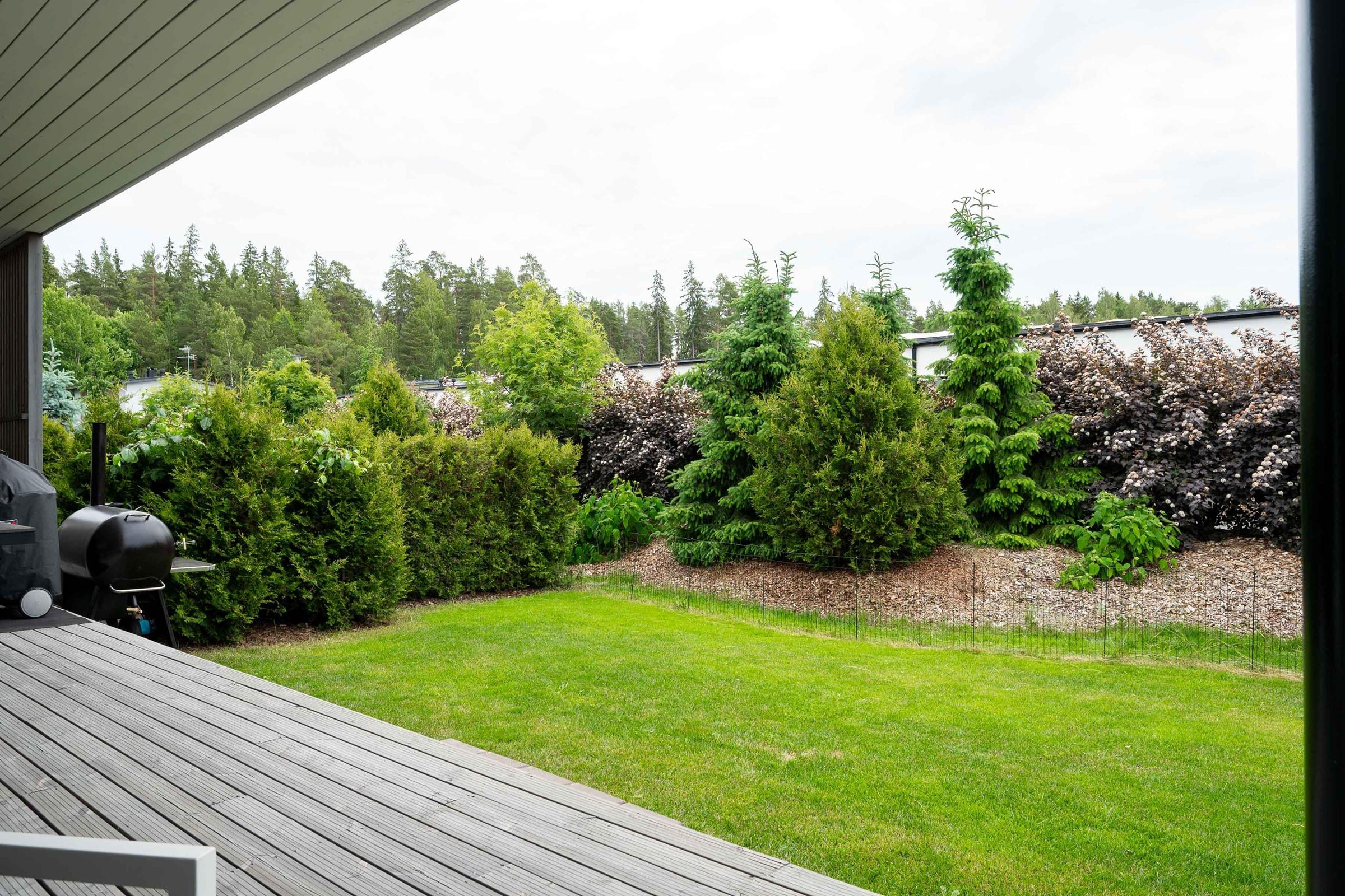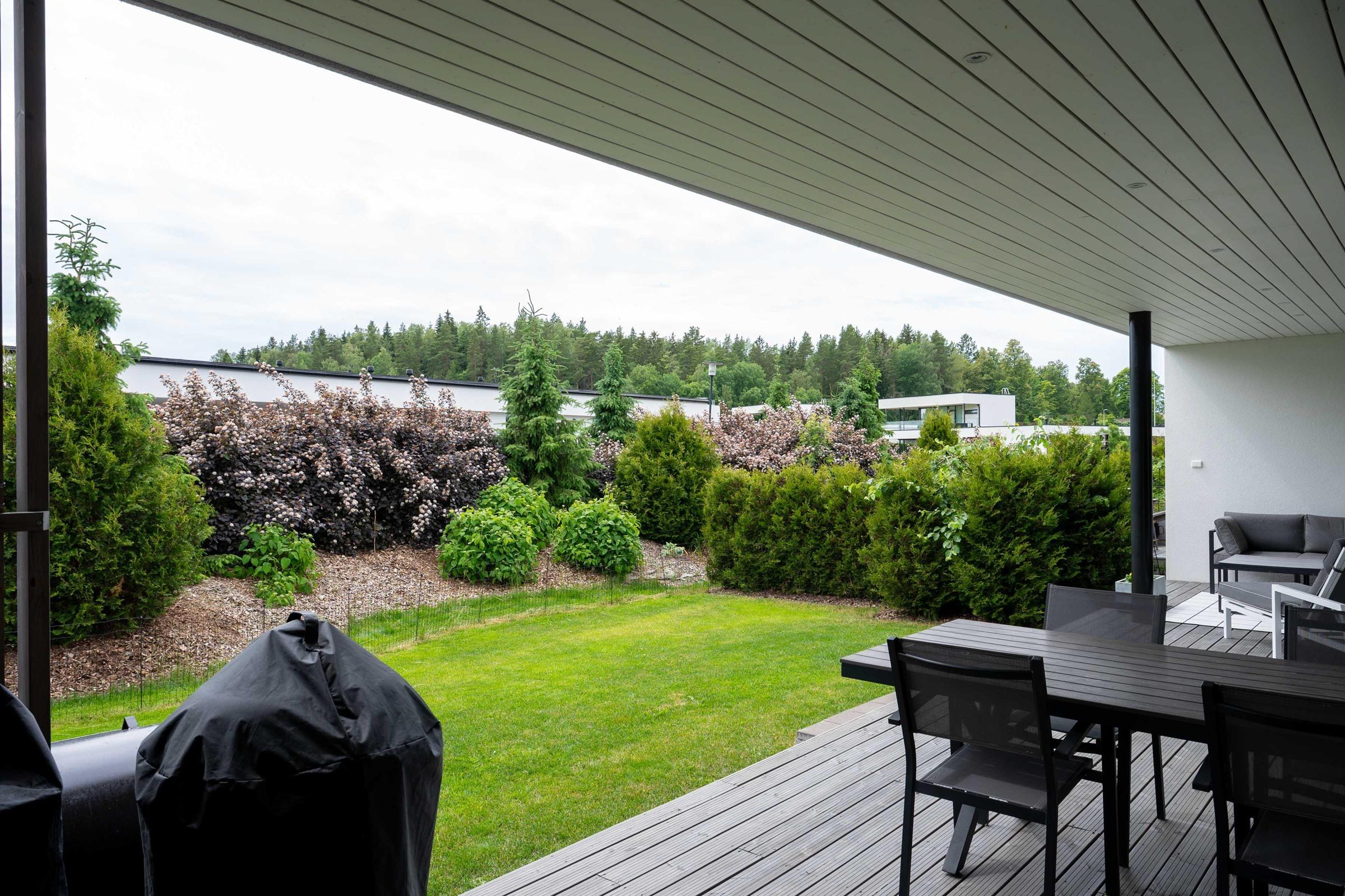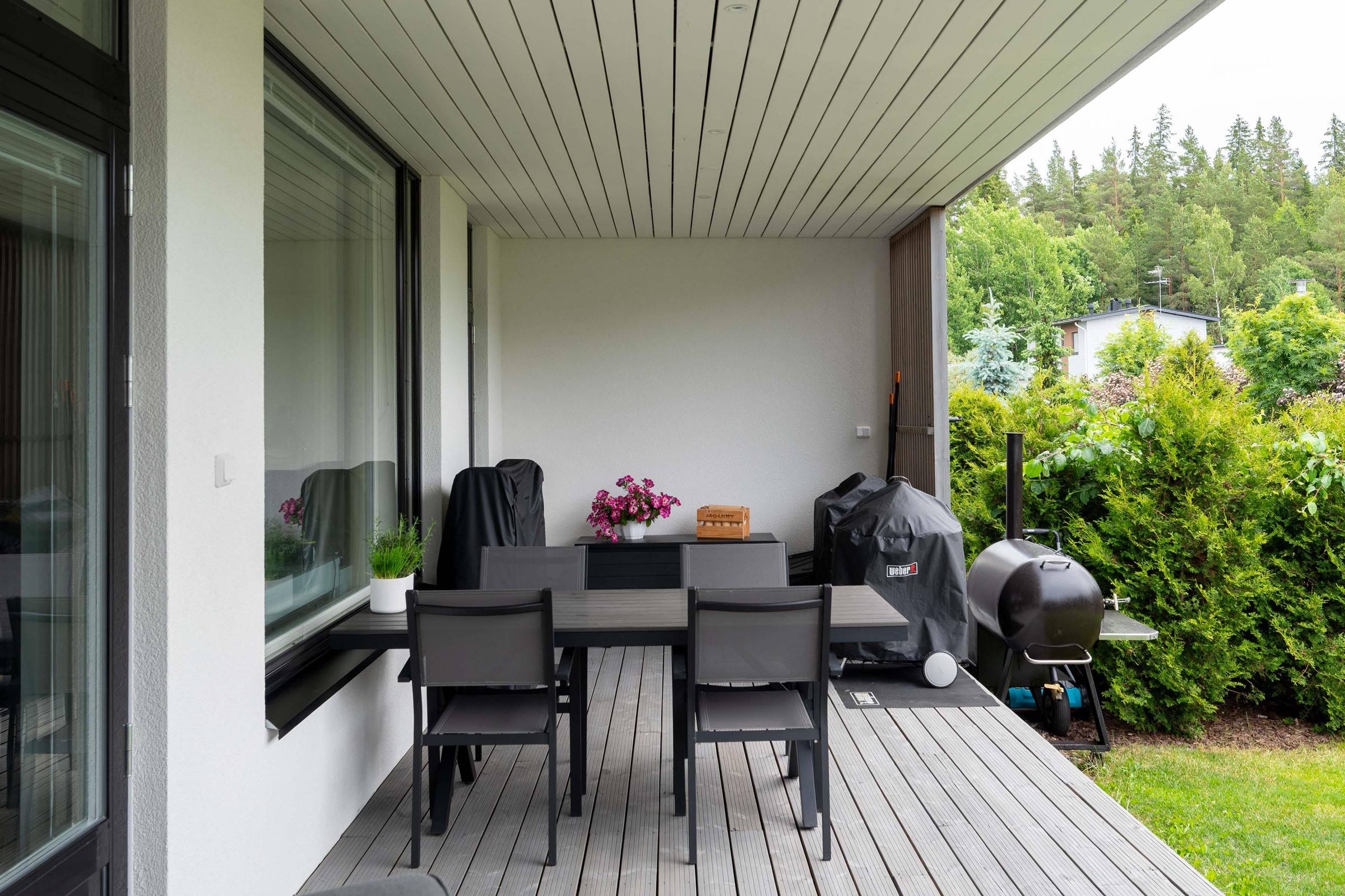 Huikean tilavat ja katetut terassit etu- ja takapihalla tarjoavat loistavat mahdollisuudet ulkoelämään. Takapihan huoneistonlevyinen terassi avautuu etelään ja sen edustalla on nurmea lapsien ja lemmikkien leikkejä varten. Tila on myös mukavan yksityinen ja suojaisa vehreiden istutusten ansiosta.