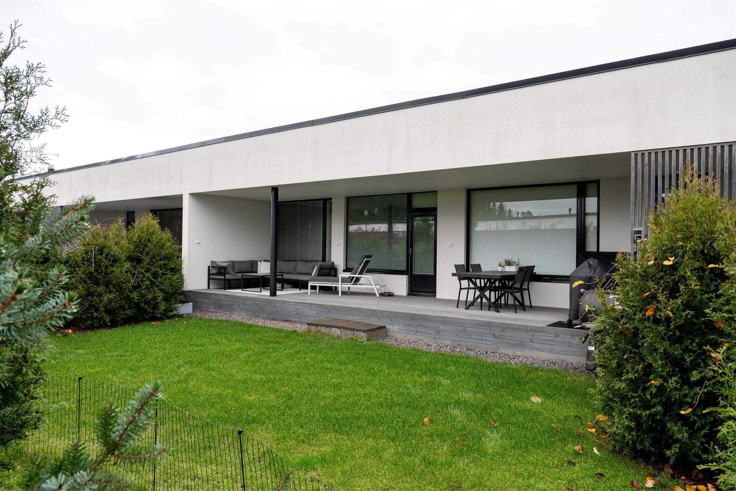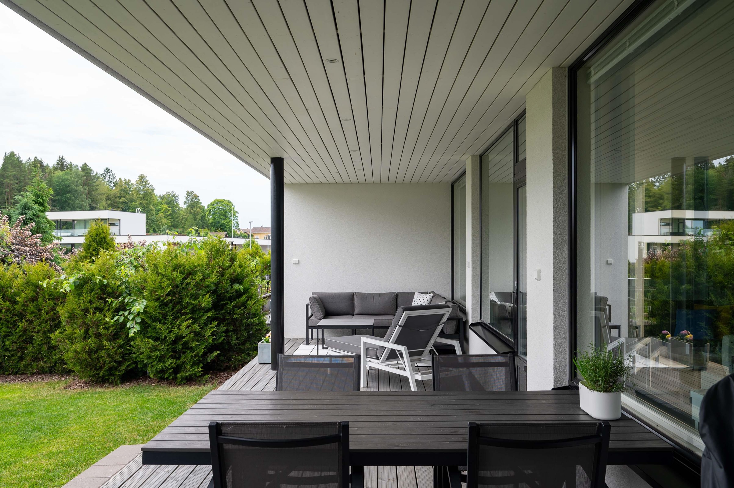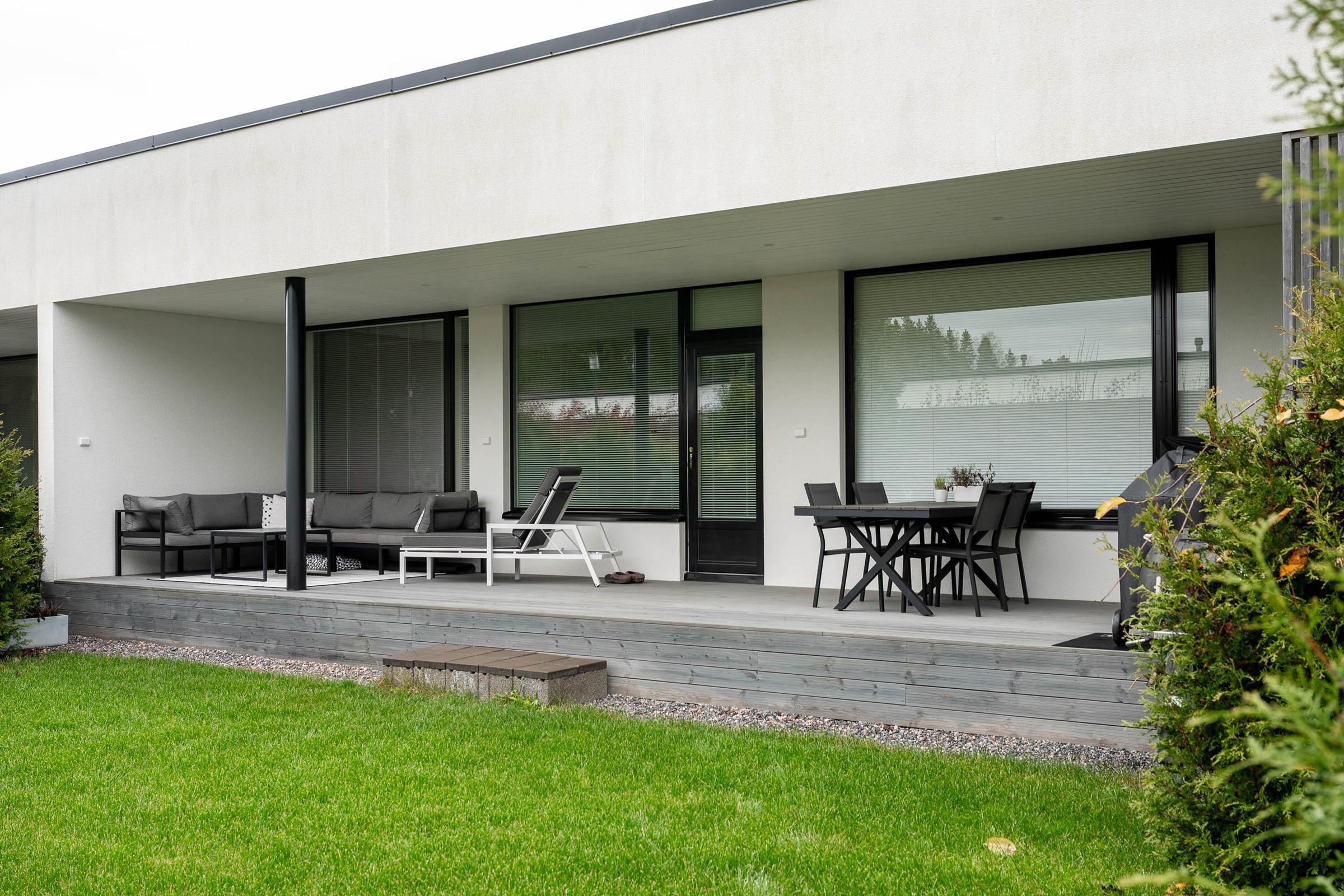 Huikean tilavat ja katetut terassit etu- ja takapihalla tarjoavat loistavat mahdollisuudet ulkoelämään. Takapihan huoneistonlevyinen terassi avautuu etelään ja sen edustalla on nurmea lapsien ja lemmikkien leikkejä varten. Tila on myös mukavan yksityinen ja suojaisa vehreiden istutusten ansiosta.