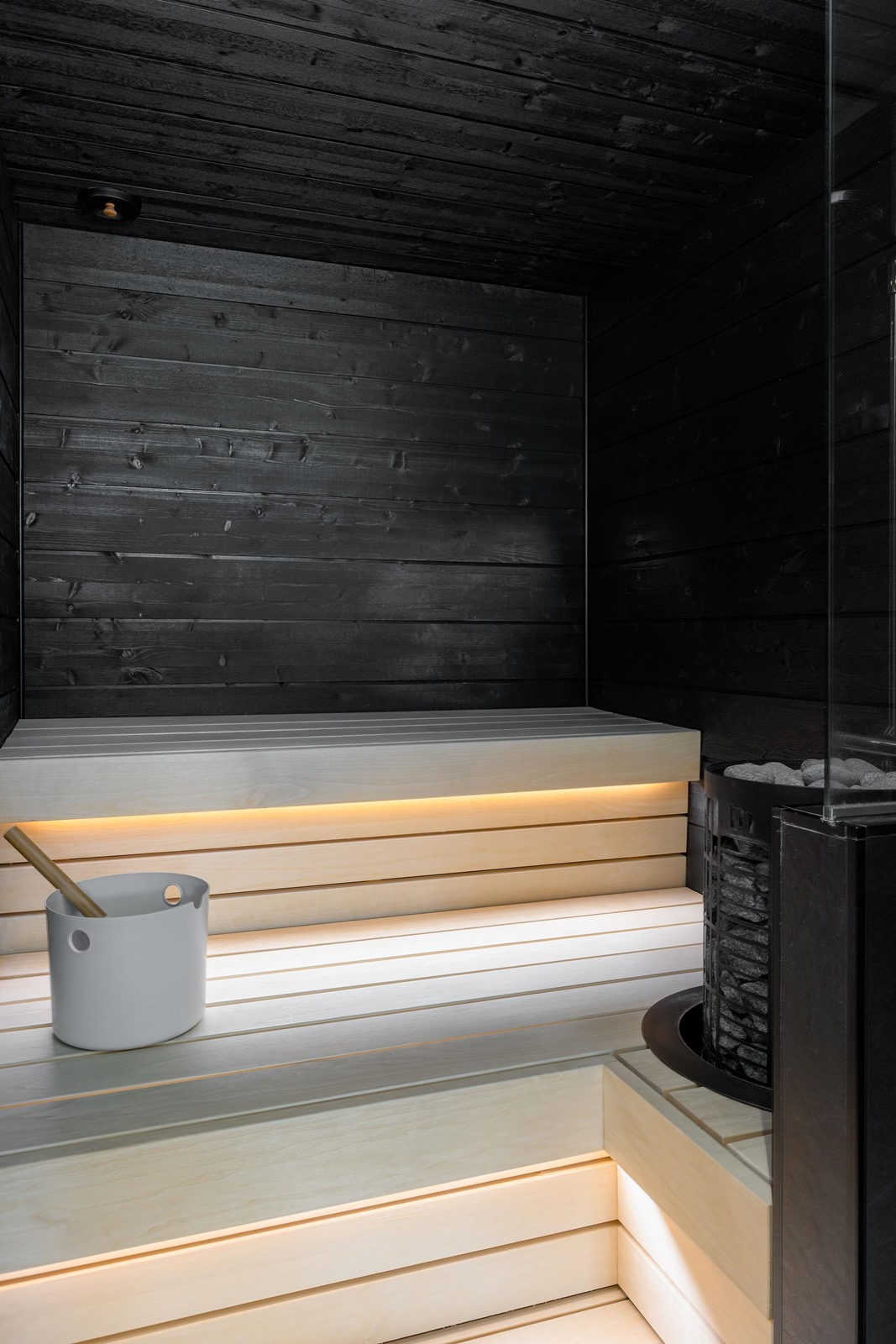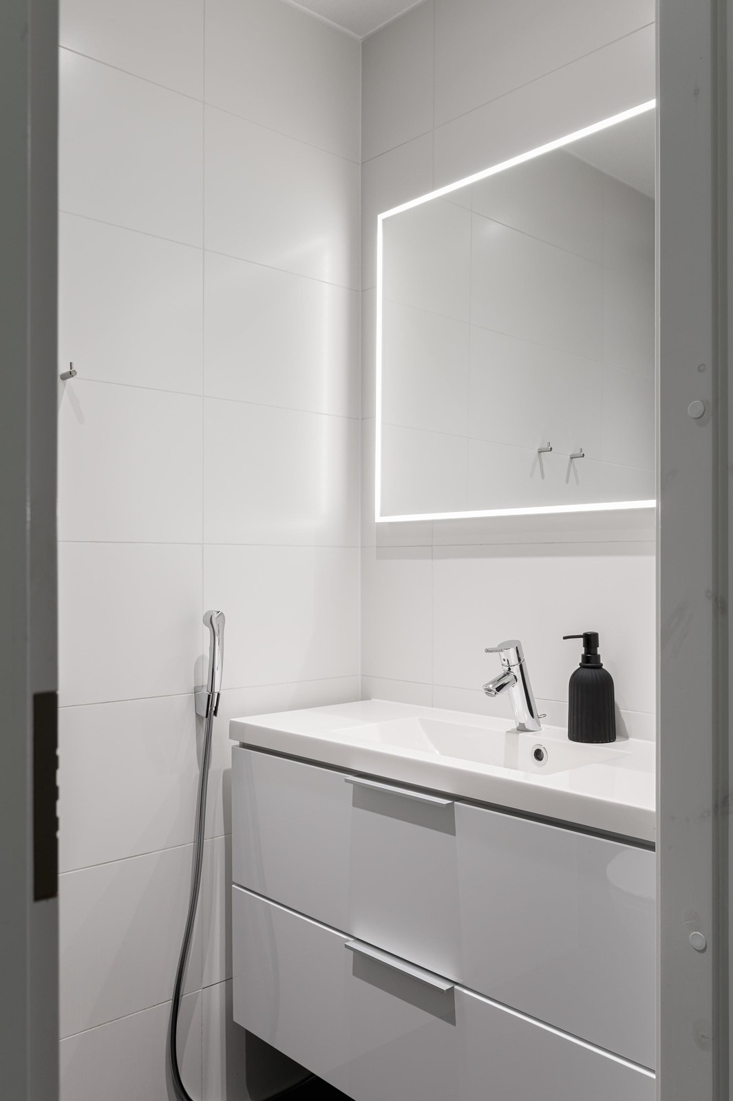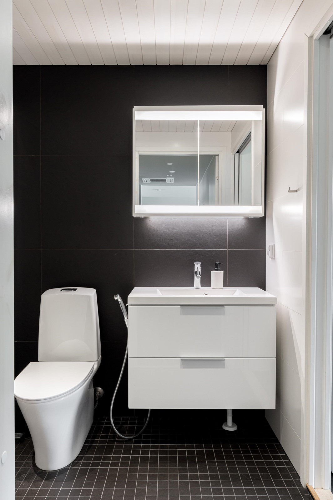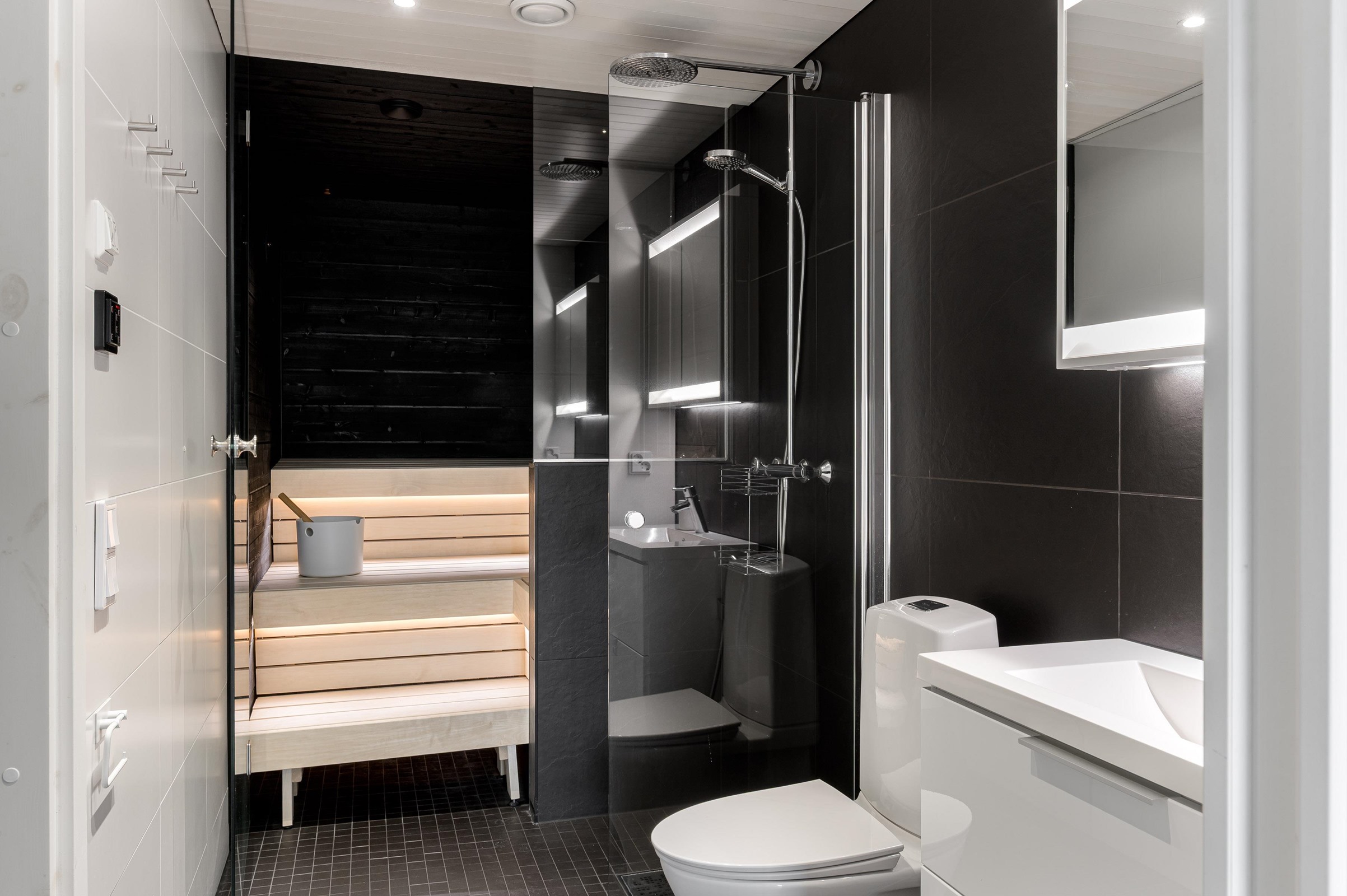 - Sähkökiuas, erillinen wc, suihku, peilikaappi, allaskaappi, pesukoneliitäntä kodinhoitohuoneessa.