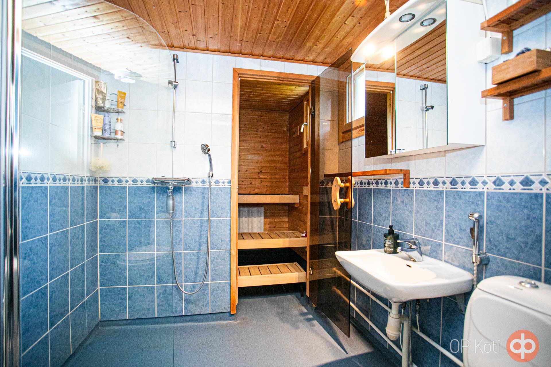 - Sauna, sähkökiuas, kylpyhuone, erillinen wc 2017 Remontoitu, suihku, suihkuseinä, peilikaappi, kiinteät valaisimet.