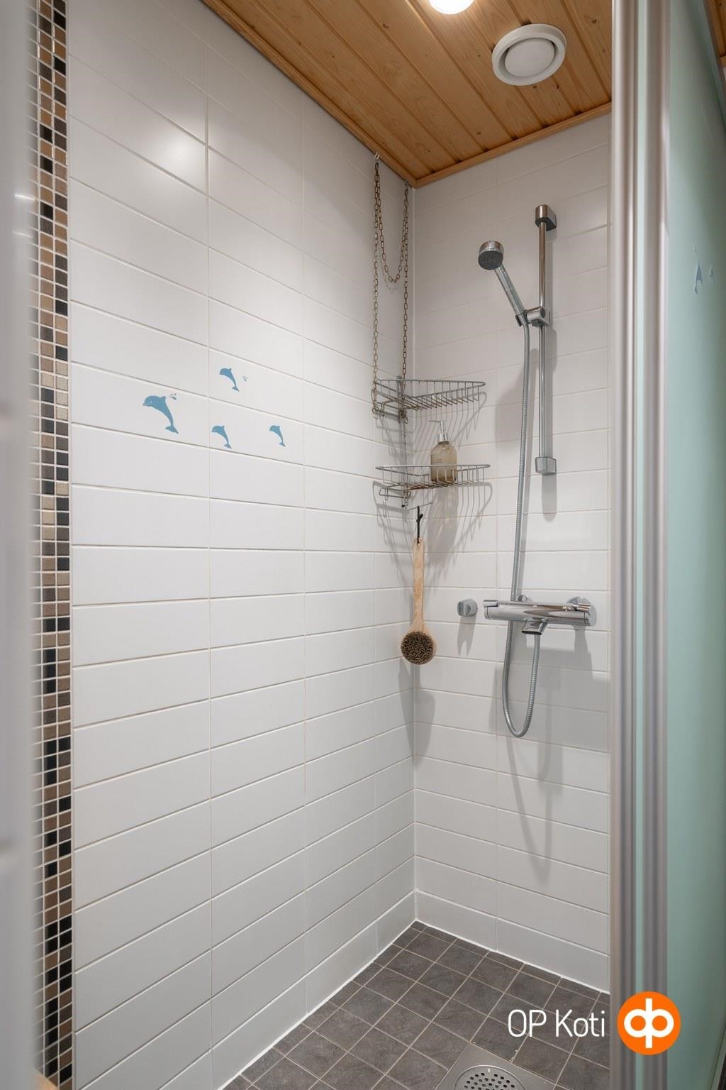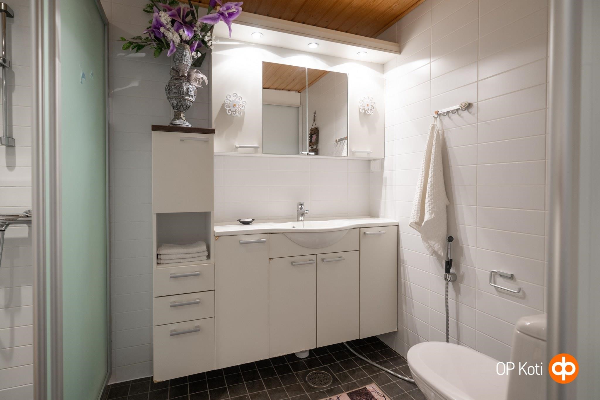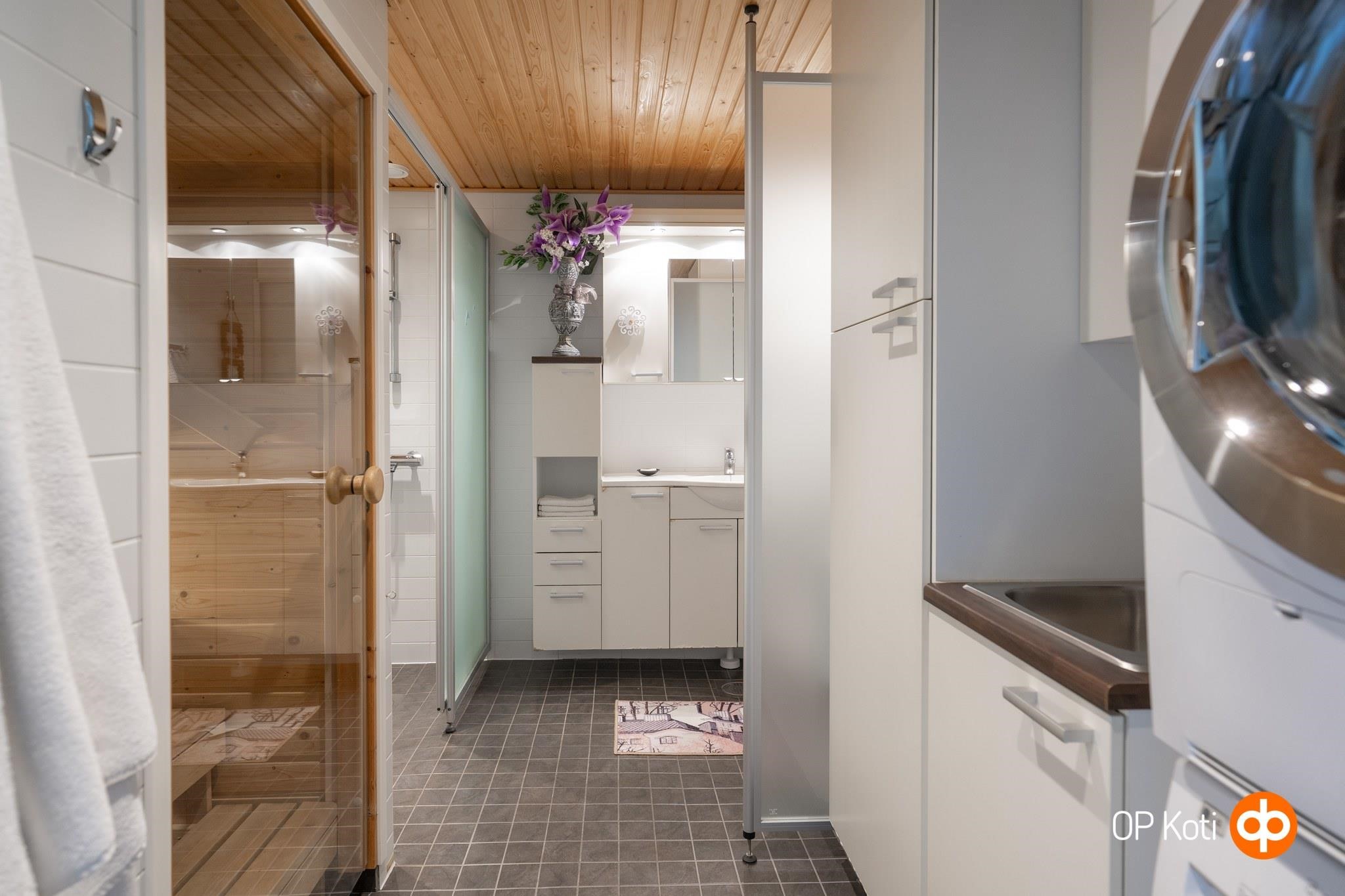 - Sauna, sähkökiuas, kylpyhuone, erillinen wc, suihku, suihkuseinä Liukuovellinen koko suihkualueen leveydeltä, peilit, kaapit, allaskaappi, pesukoneliitäntä, lattialämmitys, kiinteät valaisimet.