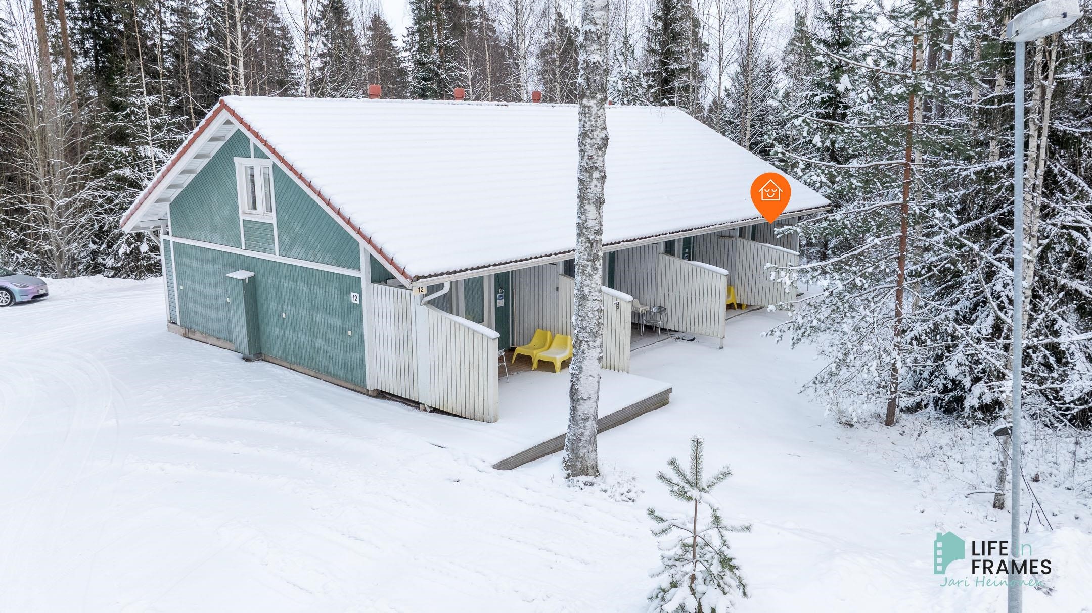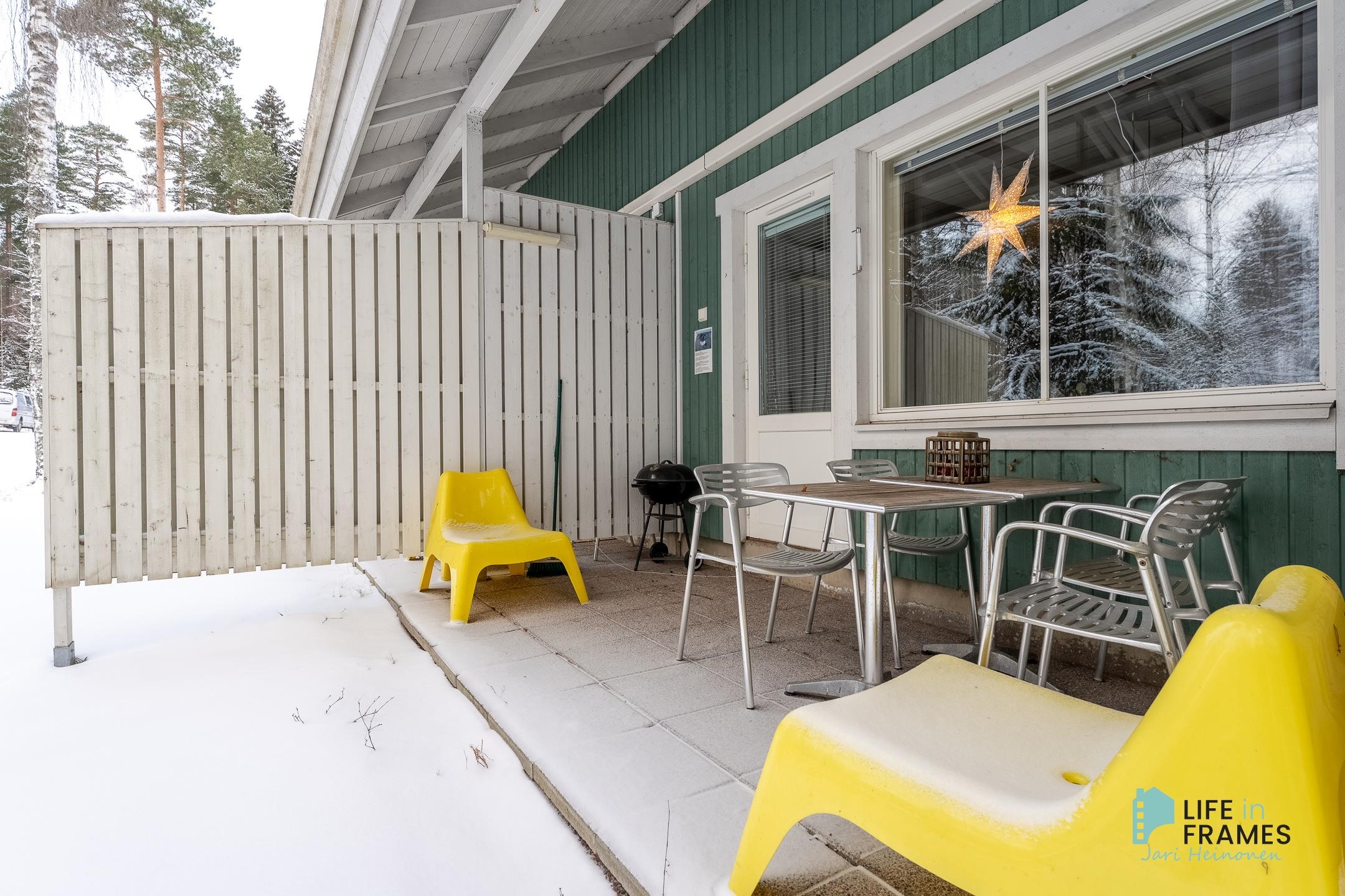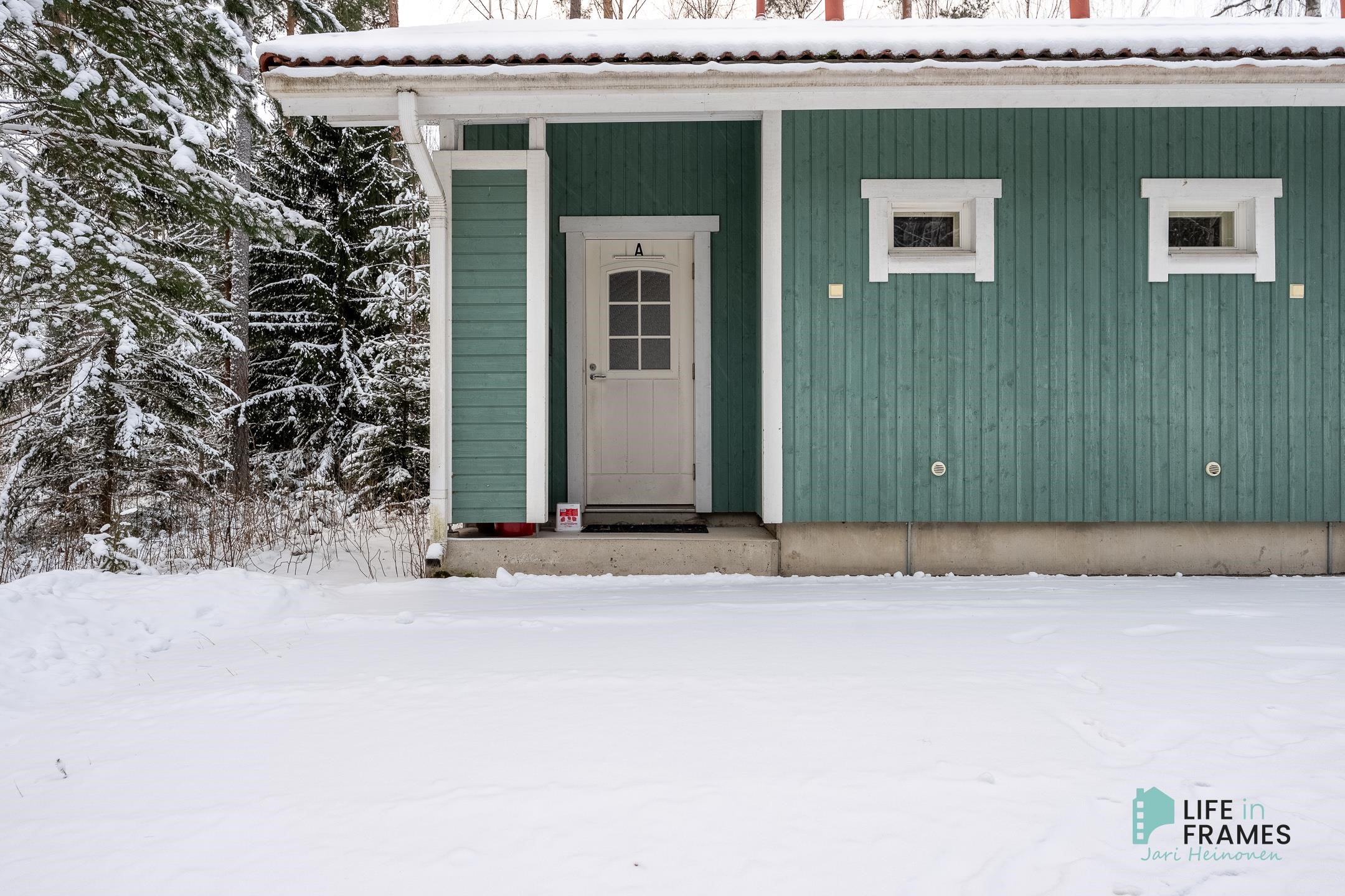 Huoneisto on kahdessa kerroksessa niin että alakerrasta löytyy tupakeittiö ja kylpyhuone/sauna. Yläkerrassa kaksi makuuhuonetta. Olohuoneesta käynti takapihan verannalle.