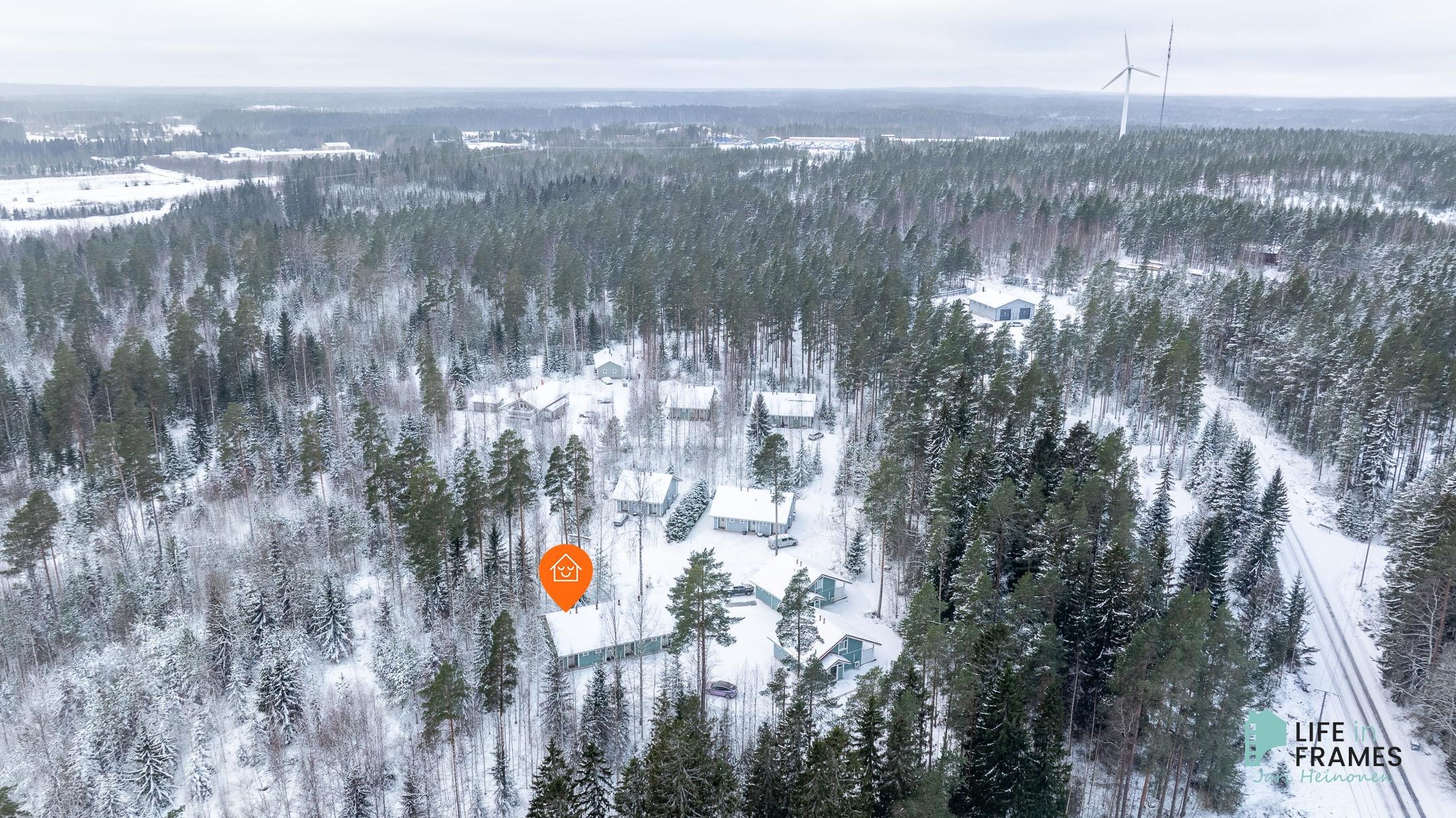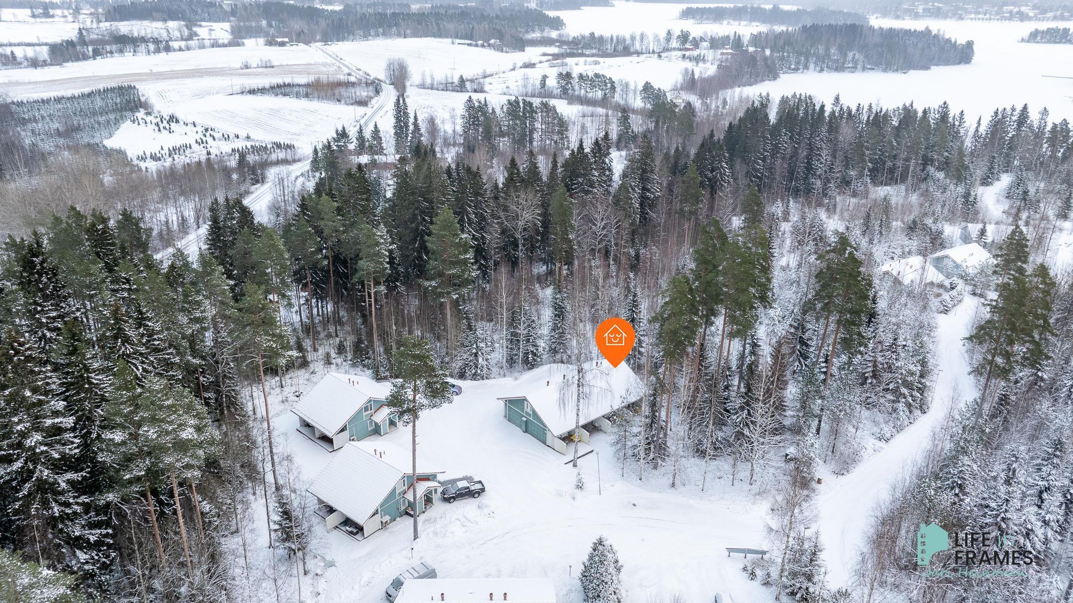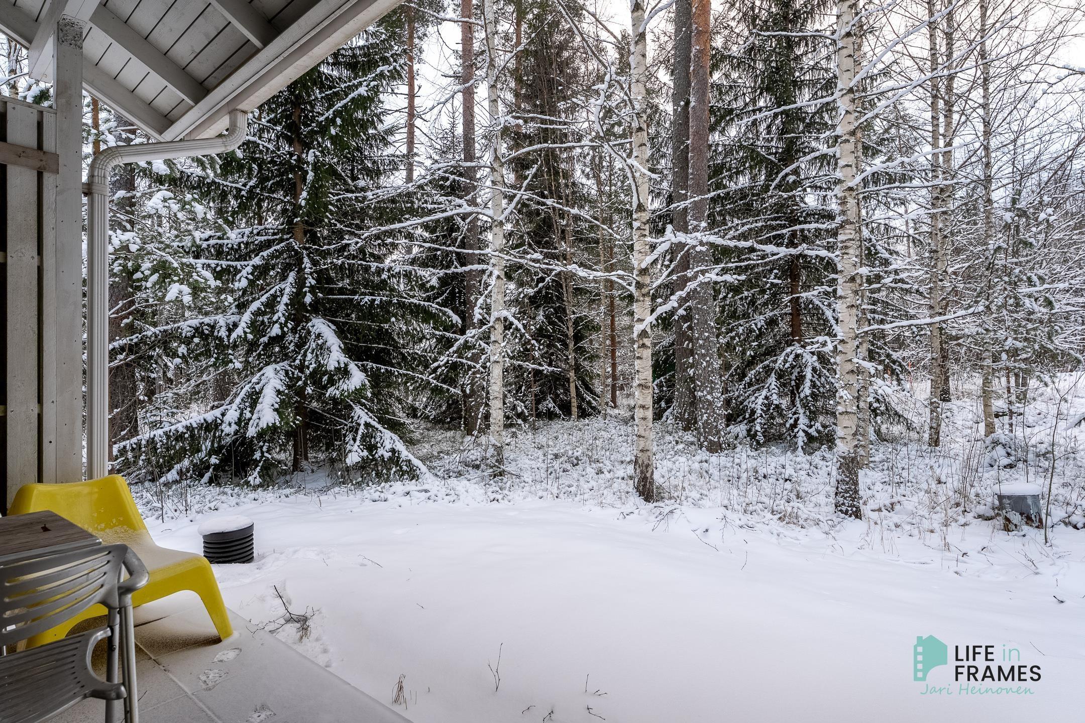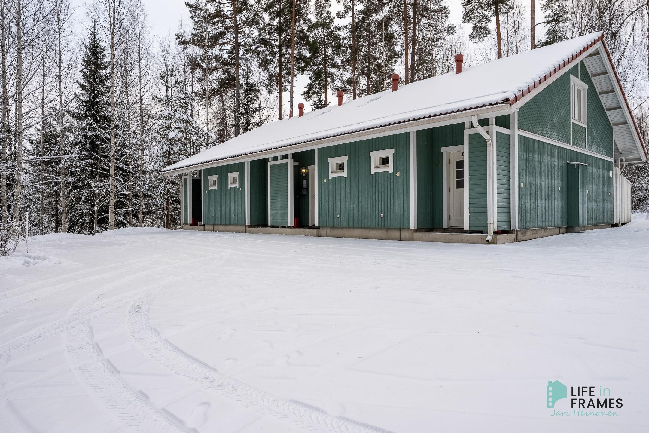Huoneisto on kahdessa kerroksessa niin että alakerrasta löytyy tupakeittiö ja kylpyhuone/sauna. Yläkerrassa kaksi makuuhuonetta. Olohuoneesta käynti takapihan verannalle.