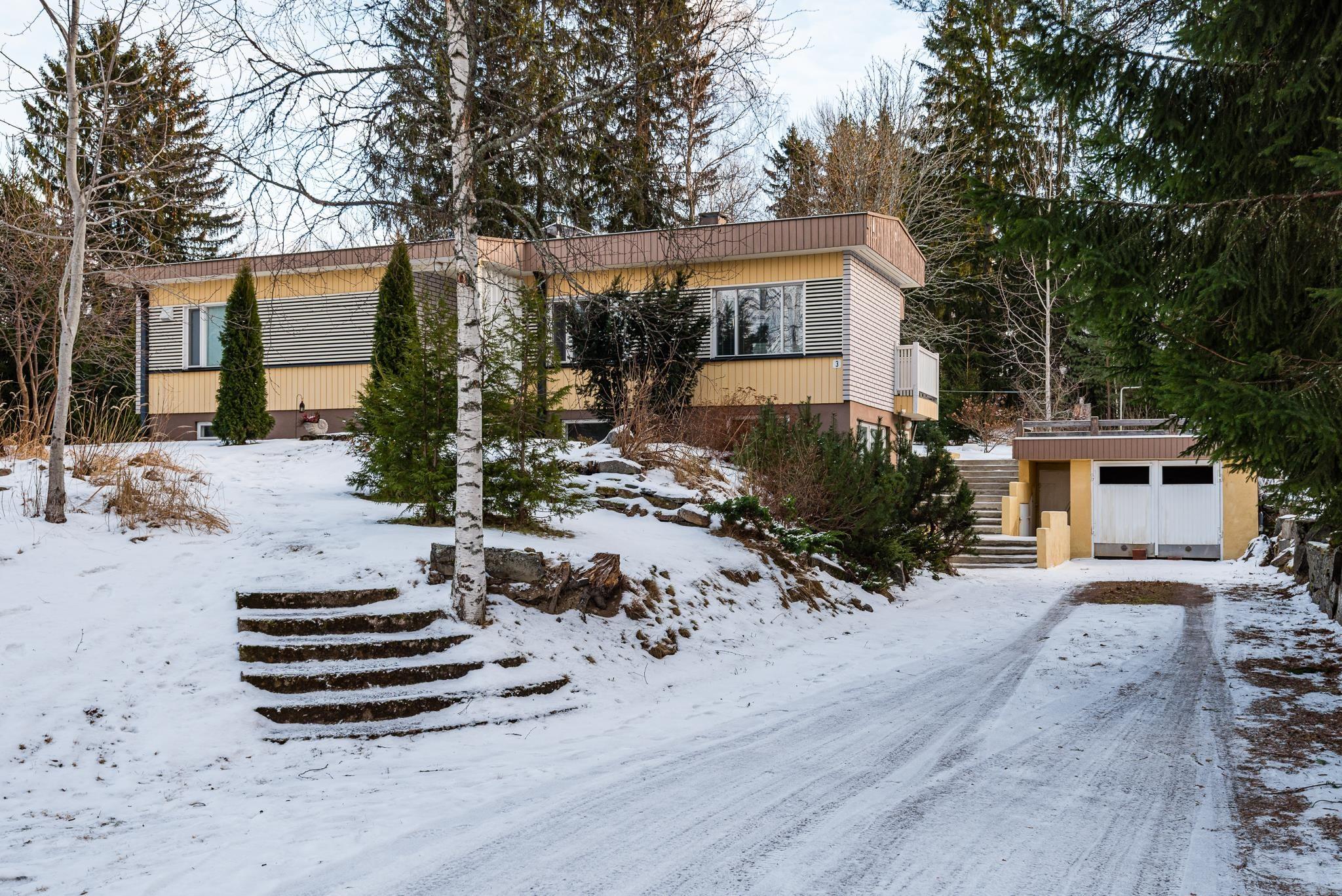 Rinnetontti, jossa talo sijaitsee ympäristöään korkeammalla. Erillinen autotallirakennus on kunnostamisen tarpeessa.