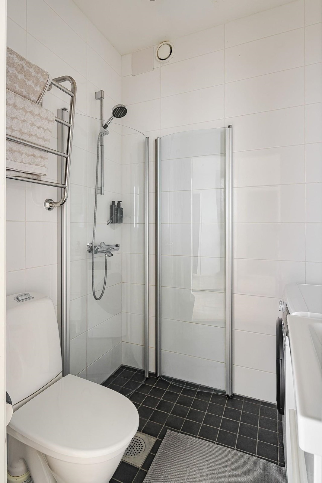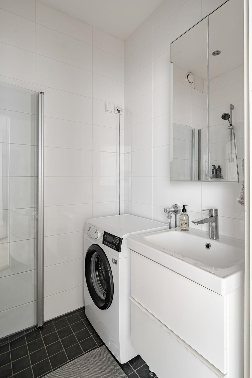 - Kylpyhuone, suihku, suihkuseinä (kääntyvät seinät), peilikaappi, allaskaappi (laatikosto), pesukoneliitäntä, kiinteät valaisimet (upotetut spotit, peilikaapin valaisin). Kylpyhuone saneerattu vuonna 2014