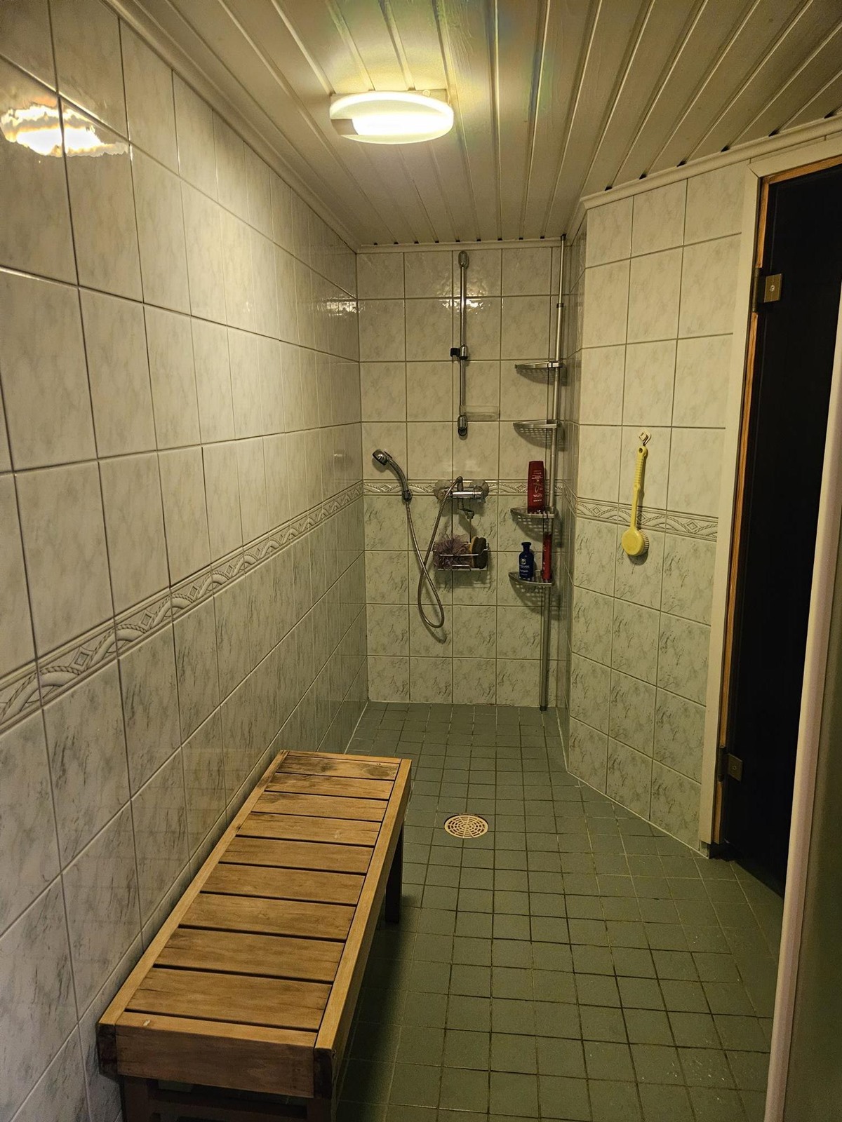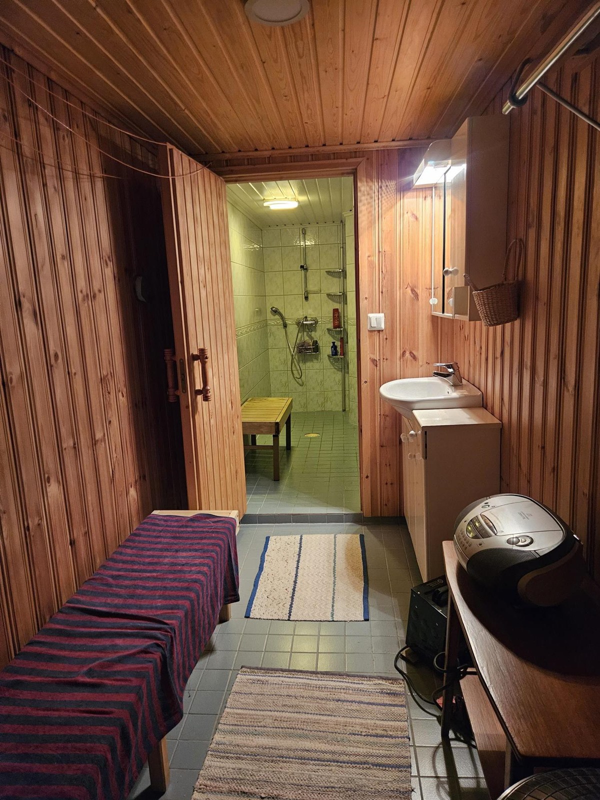 - Sauna, sähkökiuas, suihku, peilit, peilikaappi, pesukoneliitäntä, kiinteät valaisimet.