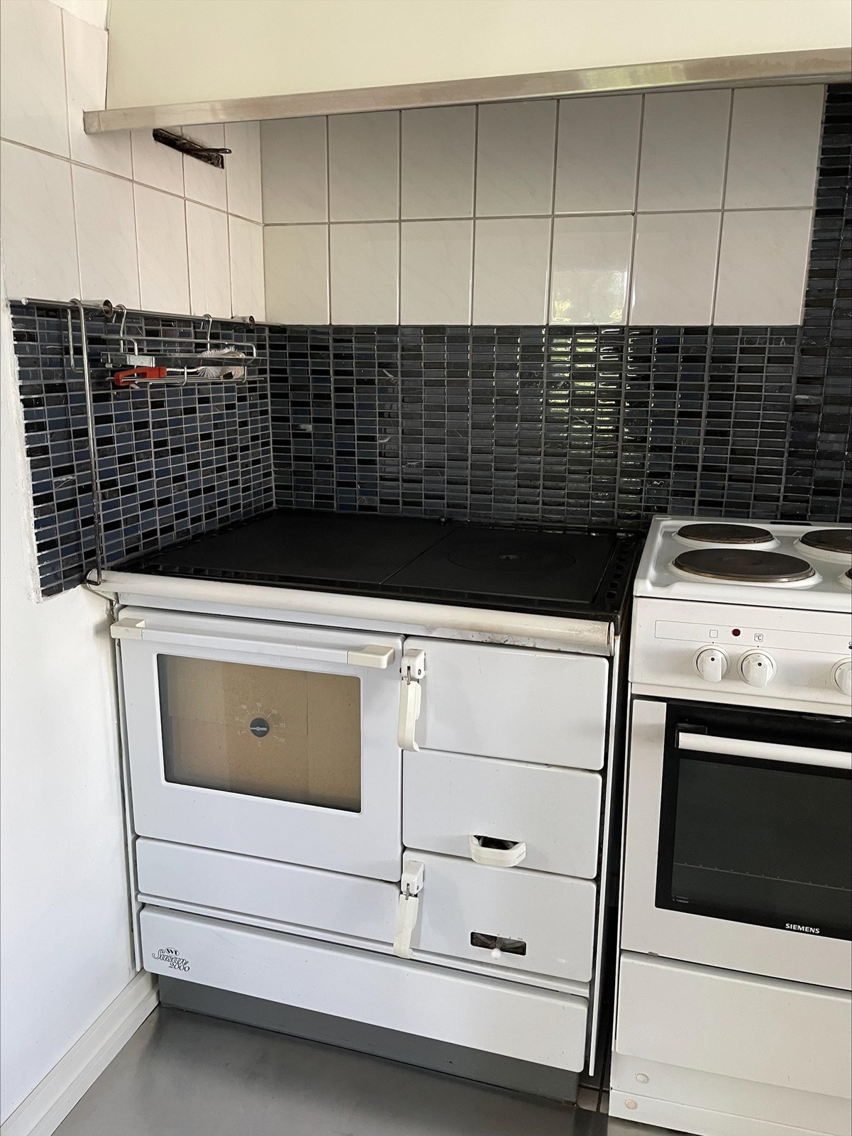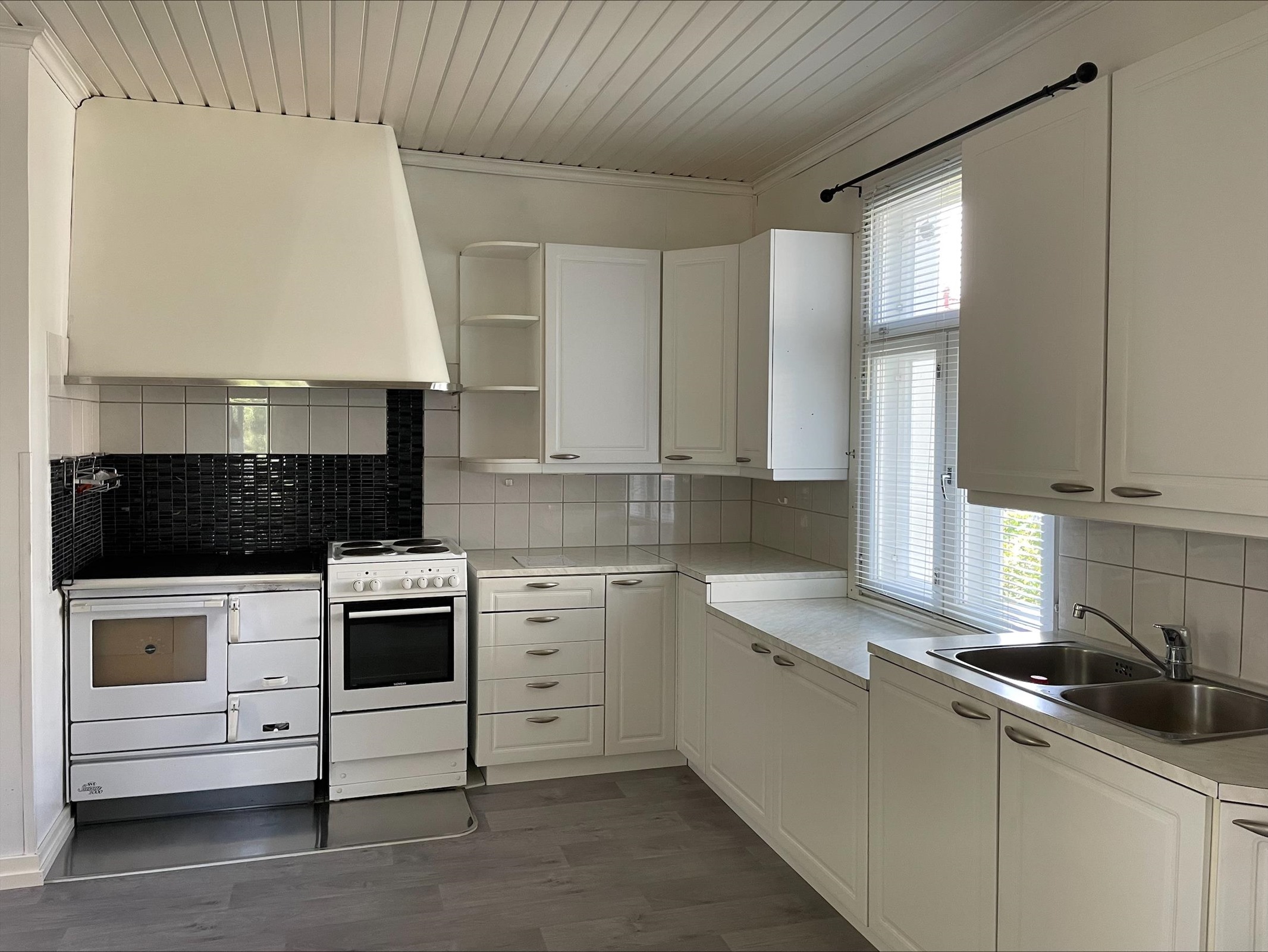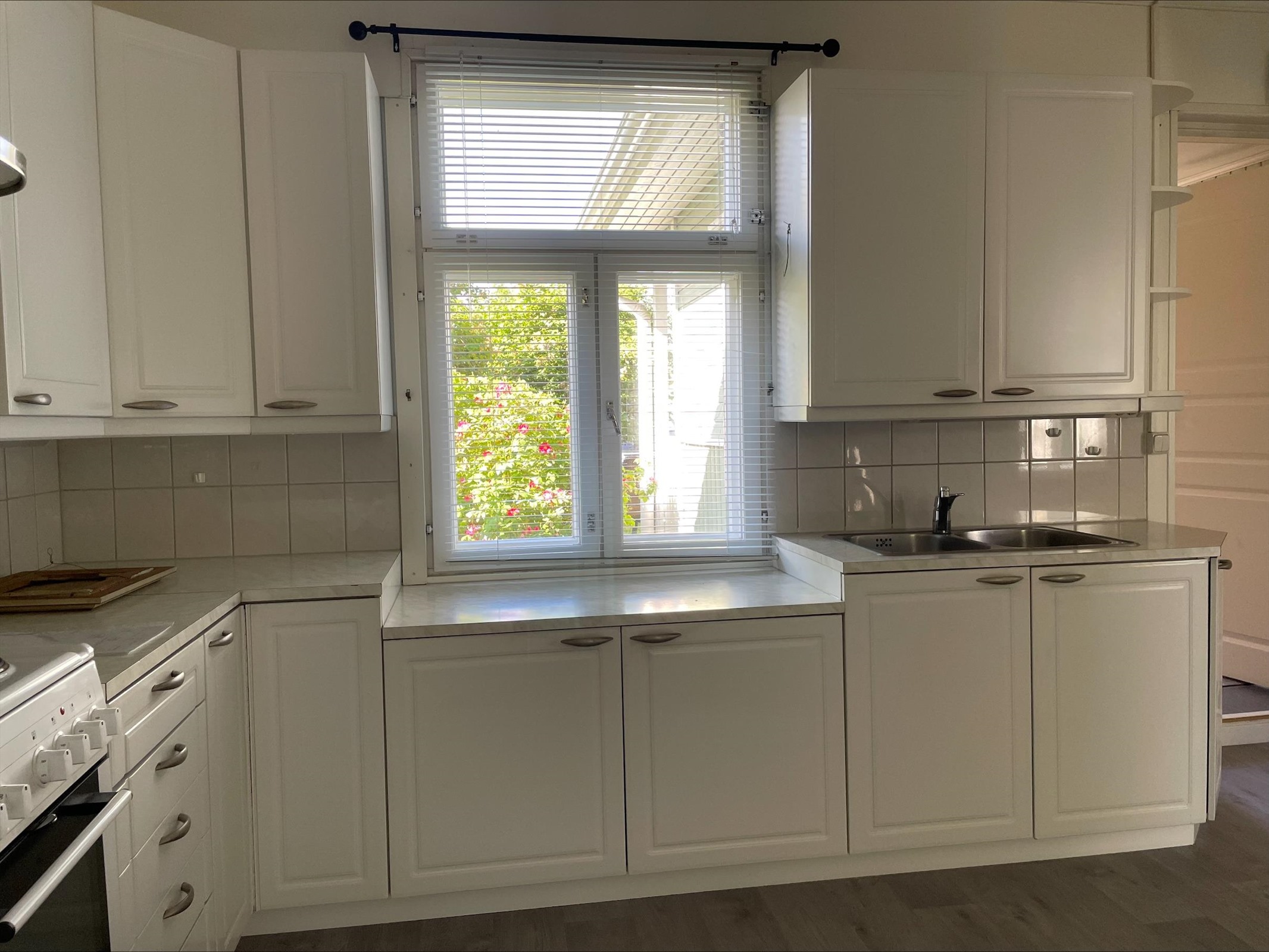 - Jääkaappipakastin, lattialiesi, sähköliesi, liesikupu, kaapistot 2002, maalattu n. 2012, kiinteät valaisimet, pöytätasojen materiaali levy.