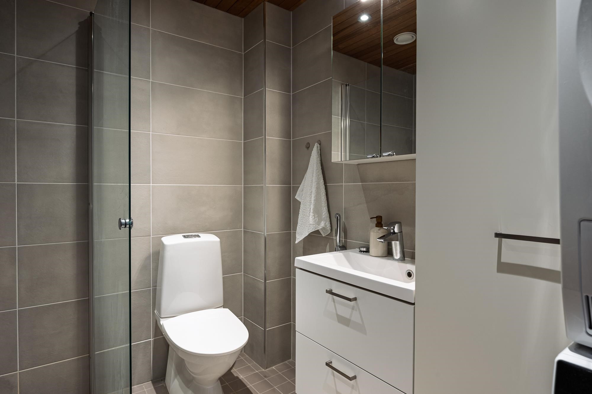- Sauna, sähkökiuas, kylpyhuone, suihku, suihkuseinä, peilikaappi, allaskaappi, pesukoneliitäntä, lattialämmitys, kiinteät valaisimet.