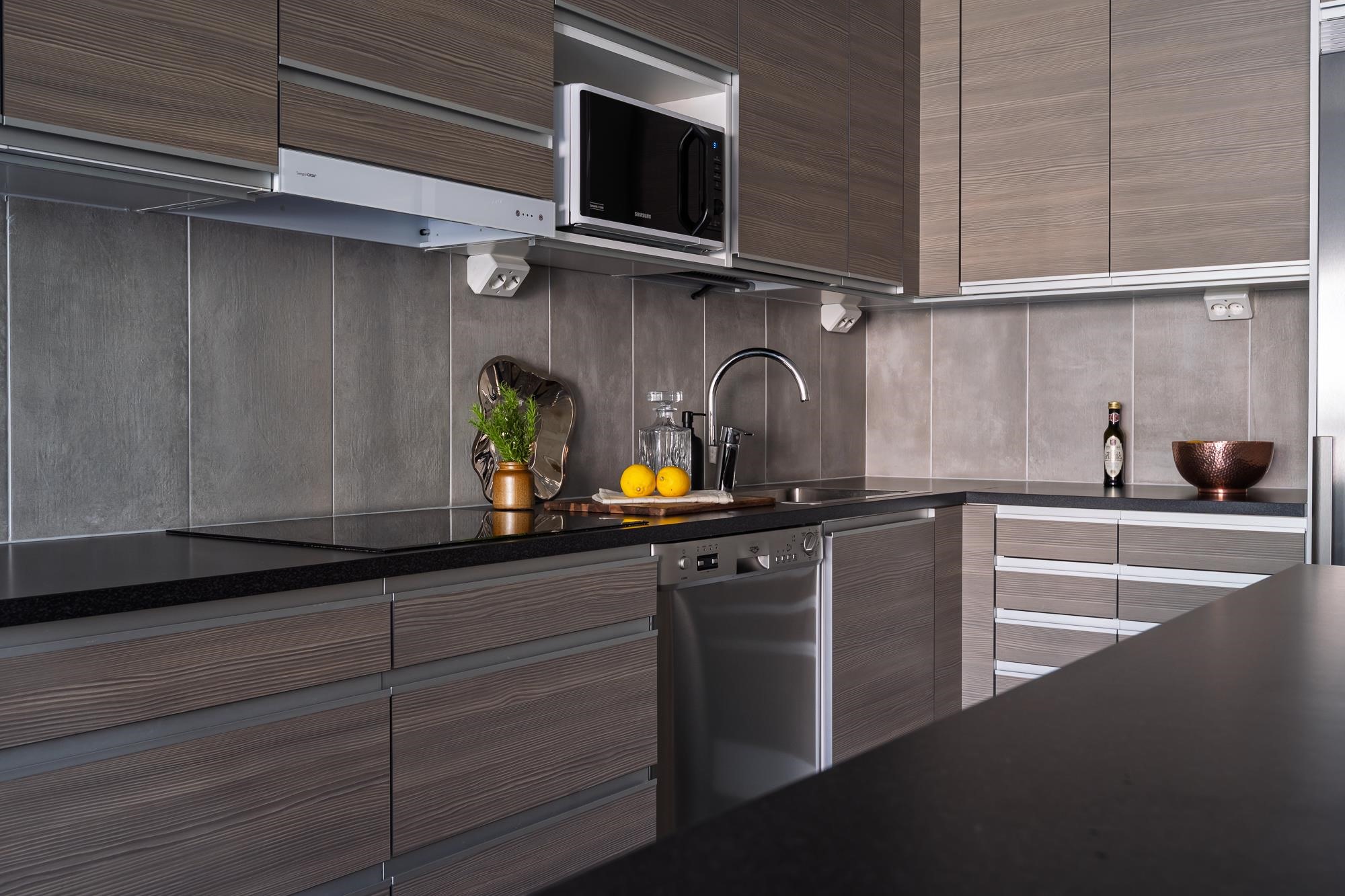 - Jääkaappipakastin, liesitaso, keraaminen liesi, liesituuletin, astianpesukone, kaapistot, kiinteät valaisimet.
