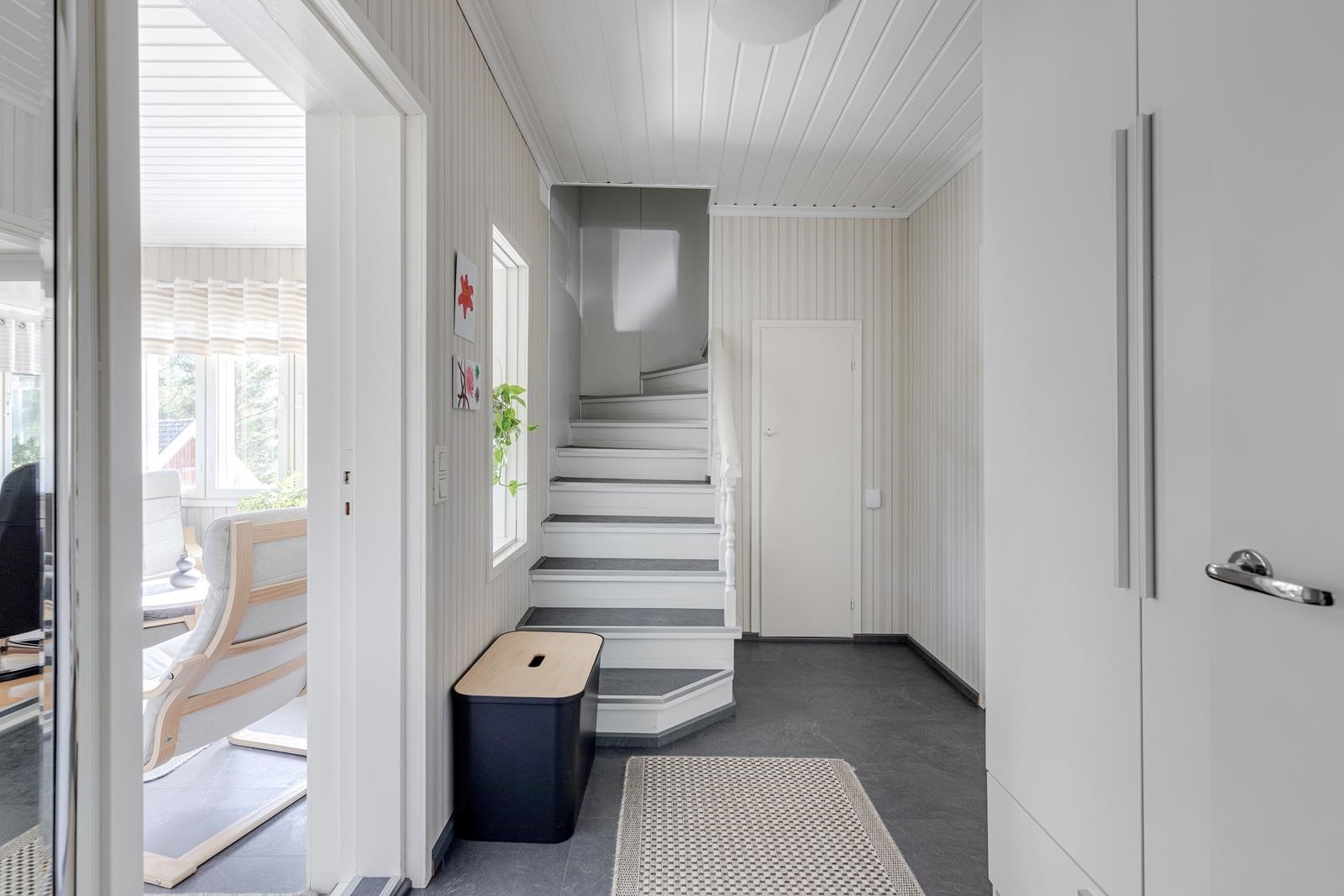 Keittiö: Lattia vinyyli laminaatti, seinät tapetti. Olohuone: Lattia parketti, seinät tapetti. Makuuhuone 1: Lattia laminaatti, seinät maali/tapetti. Kylpyhuone: Wc Lattia laatta, seinät laatta. Eteinen: /kuisti lattia vinyyli laminaatti, seinät tapetti ja paneli. Yläkerta: Lattia muovimatto, seinät maali.