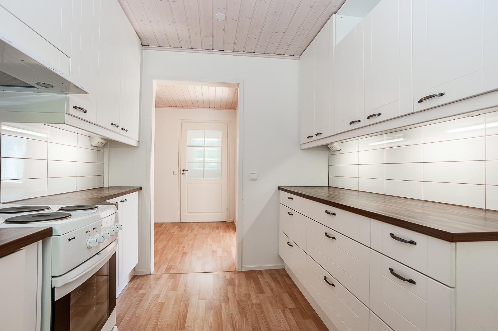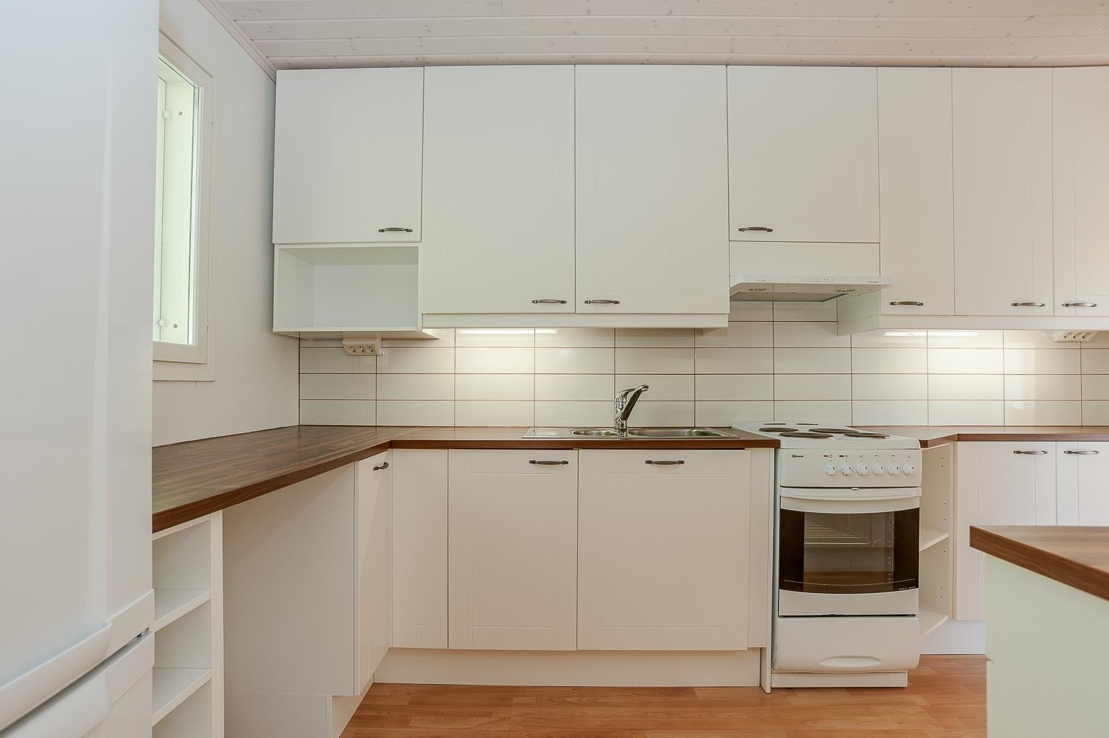 - Jääkaappipakastin, lattialiesi, liesituuletin, kaapistot, kiinteät valaisimet, pöytätasojen materiaali MDF levy.
