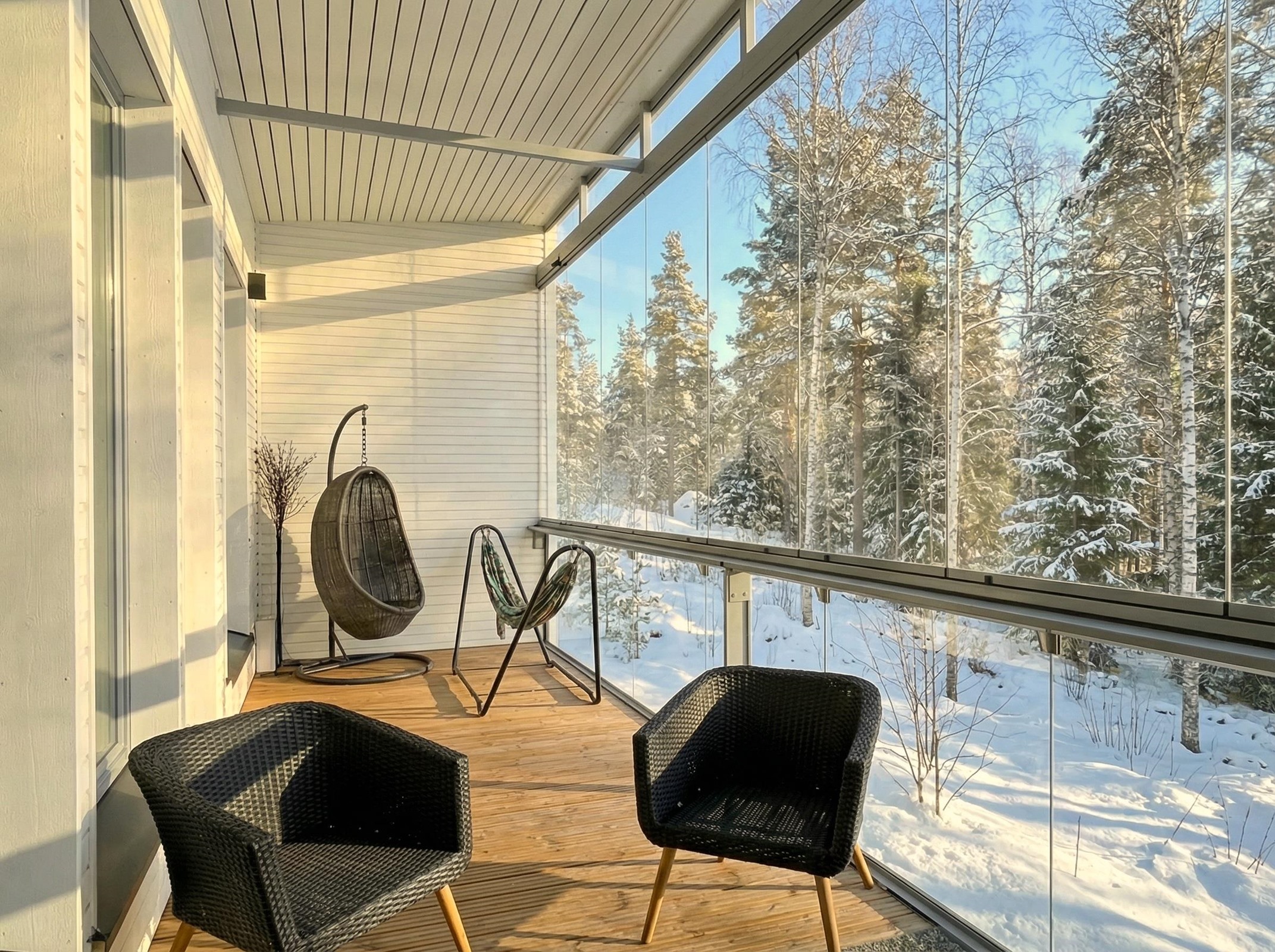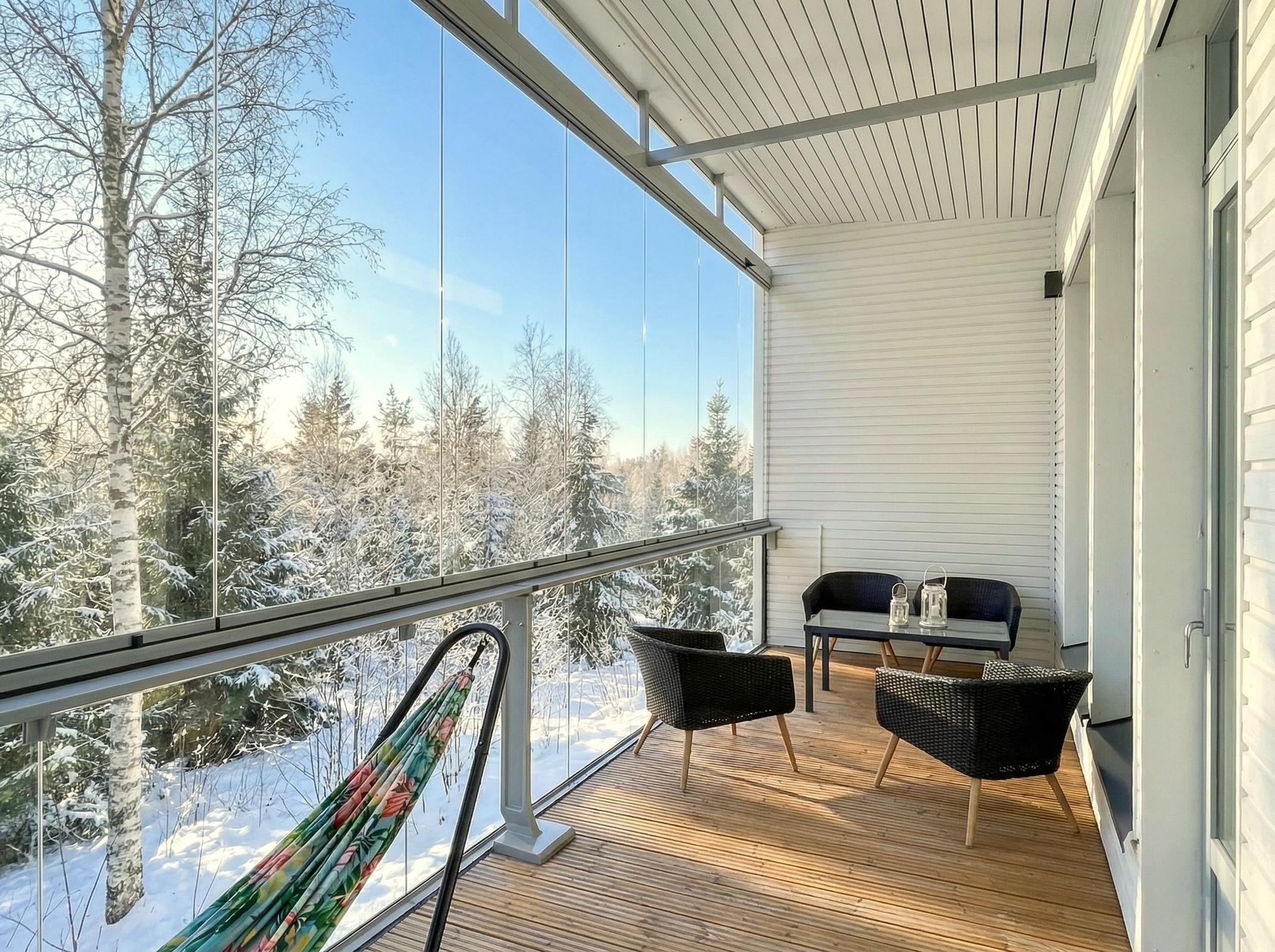 Etupihan laatoitettu alue ja sivupihan istutukset tarjoavat helppohoitoista pihapiiriä. Isolla lasitetulla parvekkeella voi nauttia oleskelusta aikaisesta keväästä myöhäiseen syksyyn.