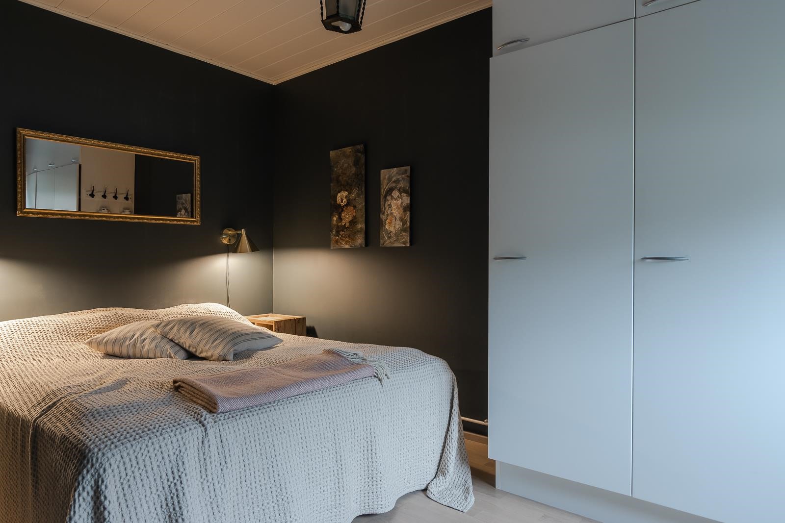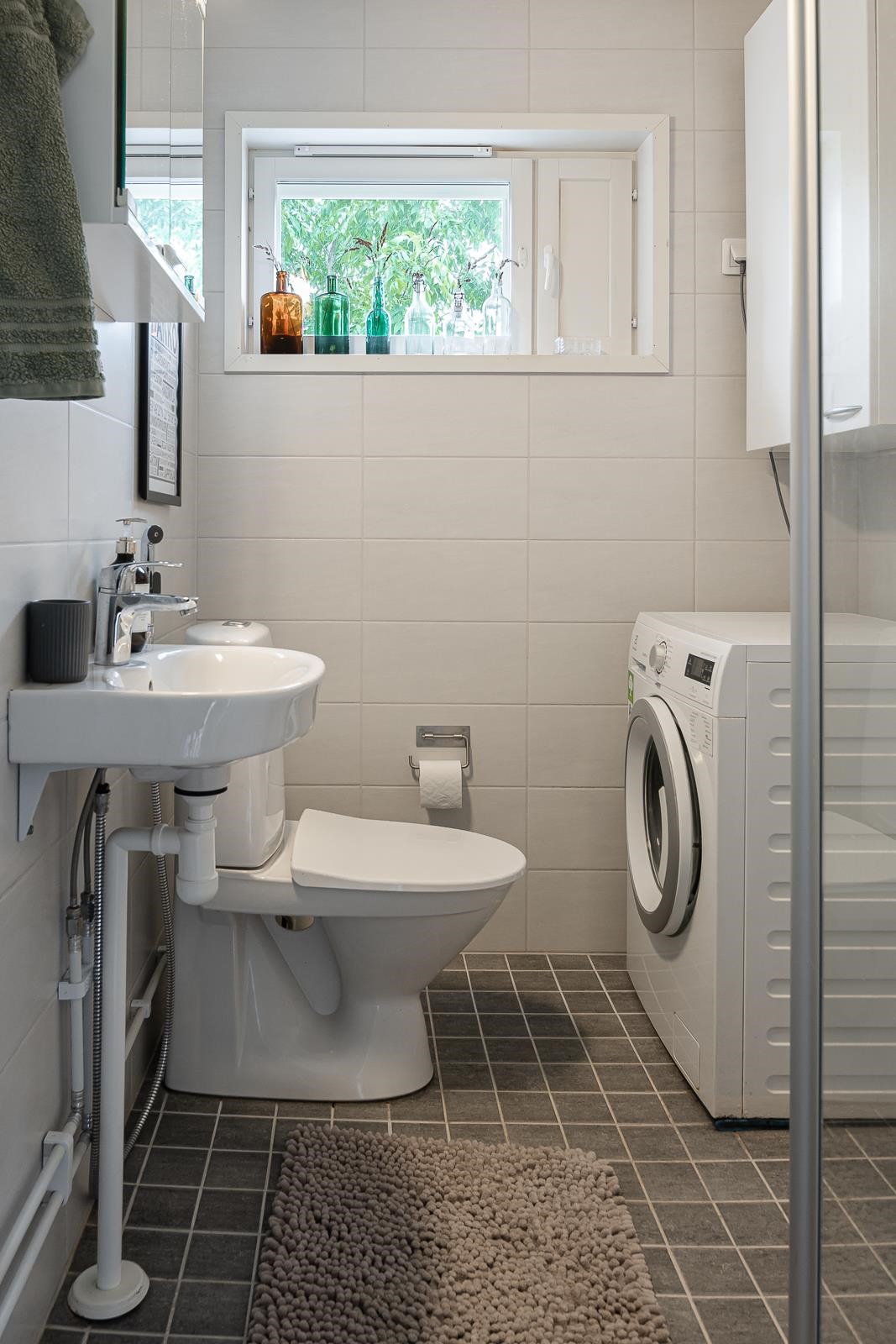 - Kylpyhuone, suihku, suihkuseinä, peilikaappi, pesukoneliitäntä, lattialämmitys, kiinteät valaisimet.