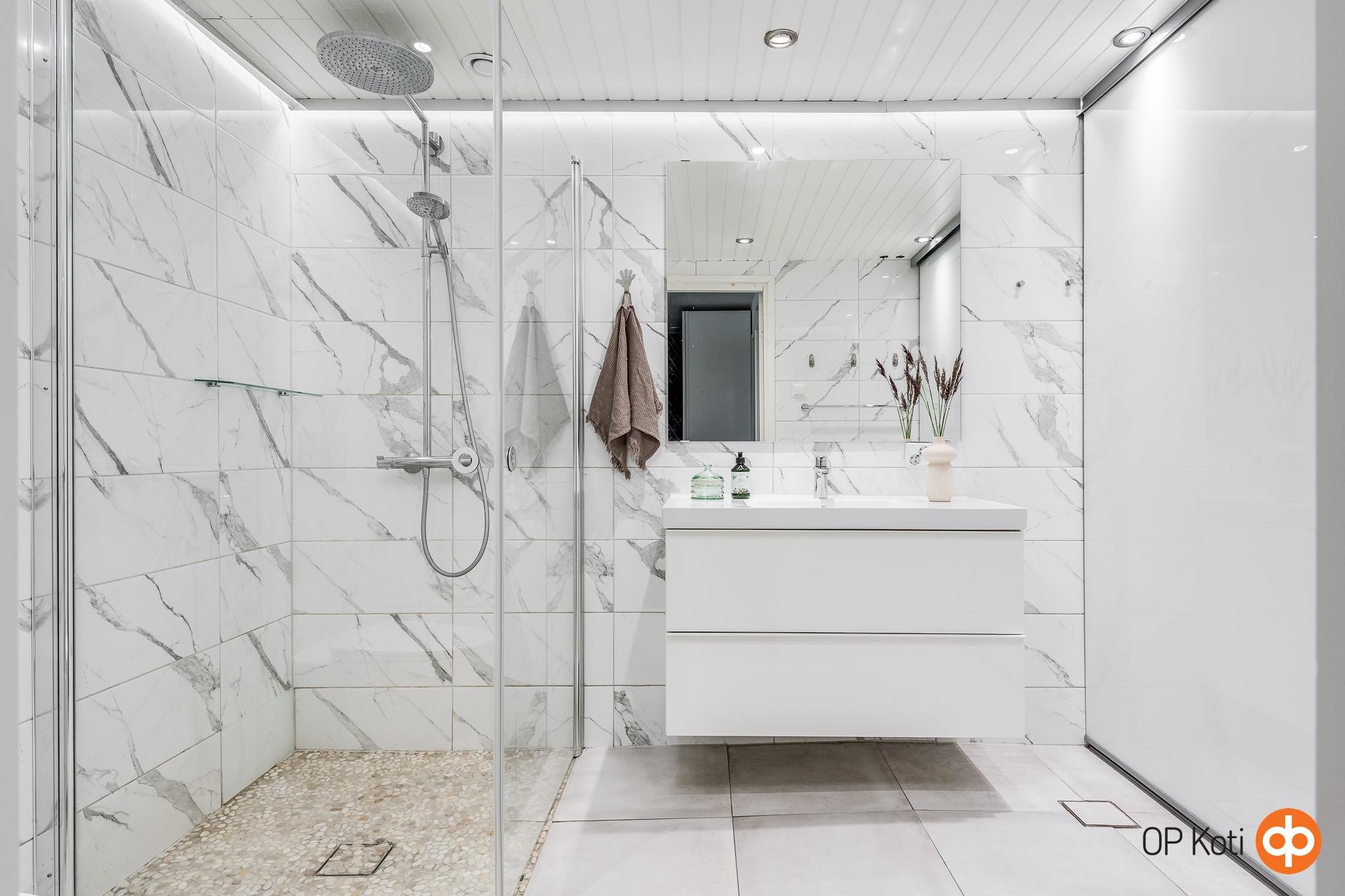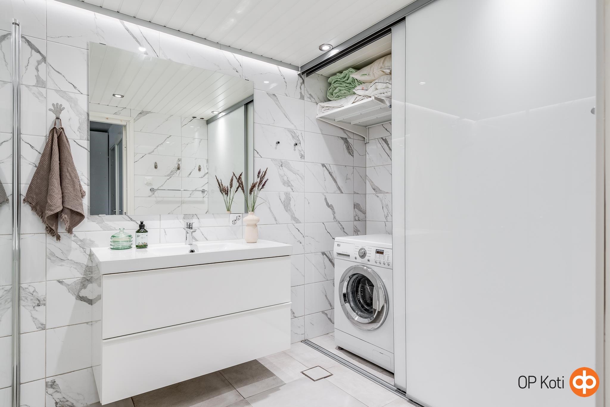 - Kylpyhuone, suihku, suihkuseinä 2 kpl kääntyviä suihkuseiniä, peilit, pesukoneliitäntä, lattialämmitys kph:ssa. Tilava ja tiloiltaan toimiva kylpyhuone, jonka toisessa päädyssä on liukuovin erotettu ns. kodinhoitotila, jonne saa mm. pyykinpeukoneen ja kuivurin liukuovien taakse näkyvistä pois. Kylpyhuoneeseen asennettu seinämallin wc-istuin. Huoneistossa ollut alunperin oma sauna, mutta se on poistettu vuonna 2016 asunnon täydellisen remontin yhteydessä. Saunavaraus jätetty edelleen, joten tarvittaessa saunan saa kohtuudella tehtyä asuntoon uudelleen takaisin.