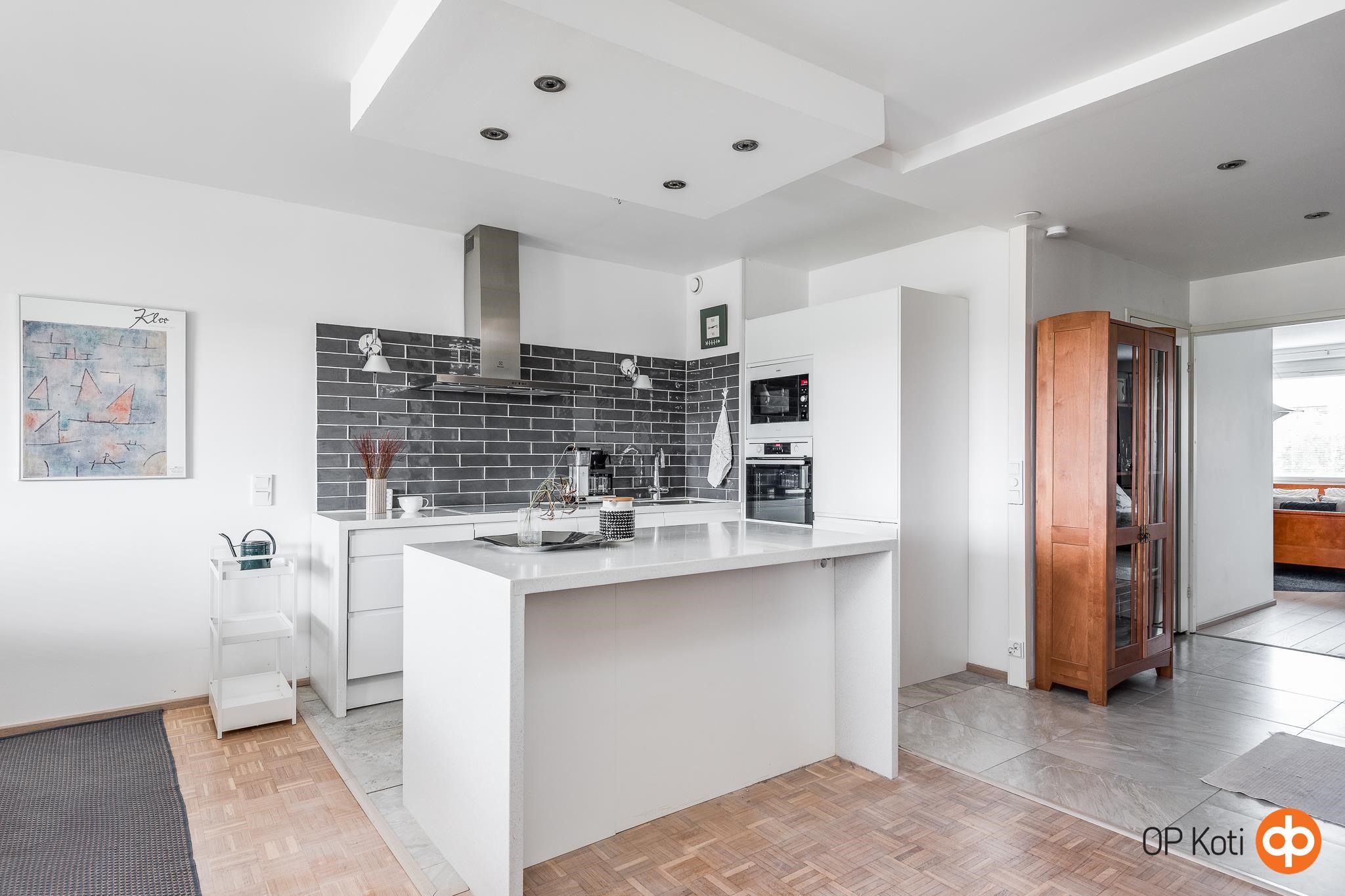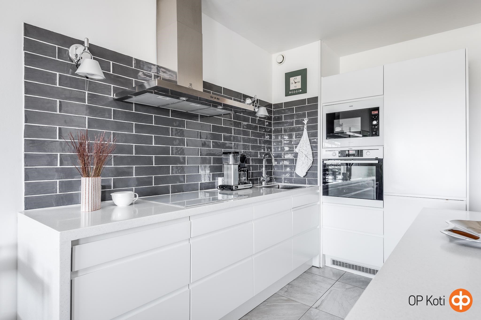 - Jääkaappipakastin integroitu, erillisuuni, induktioliesi, liesituuletin rosterinen, mikroaaltouuni integroitu, astianpesukone integroitu, kaapistot kaapistot valkeat sileäpintaiset mdf-pint. ovet. Tyylikäs ja hyvin varusteltu keittiö, runsaasti vetolaatikostoja, hyvä tilanjakajana sekä lisälaskutilana toimiva saareke.
