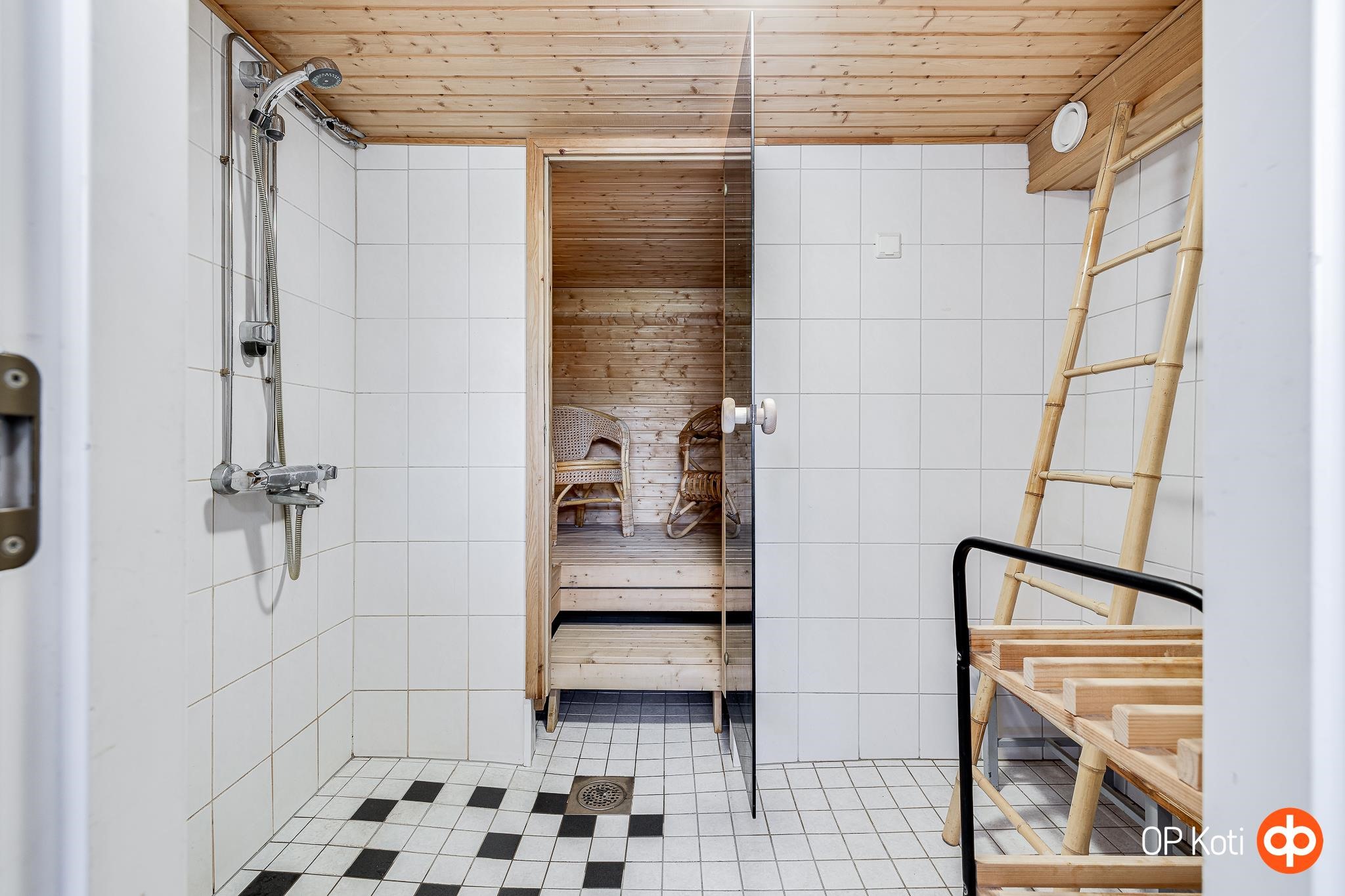 - Sauna, sähkökiuas, kylpyhuone Myös yläkerrassa suihku, erillinen wc, suihku 2x, suihkuseinä, peilikaappi, allaskaappi, pesukoneliitäntä, lattialämmitys, kiinteät valaisimet.