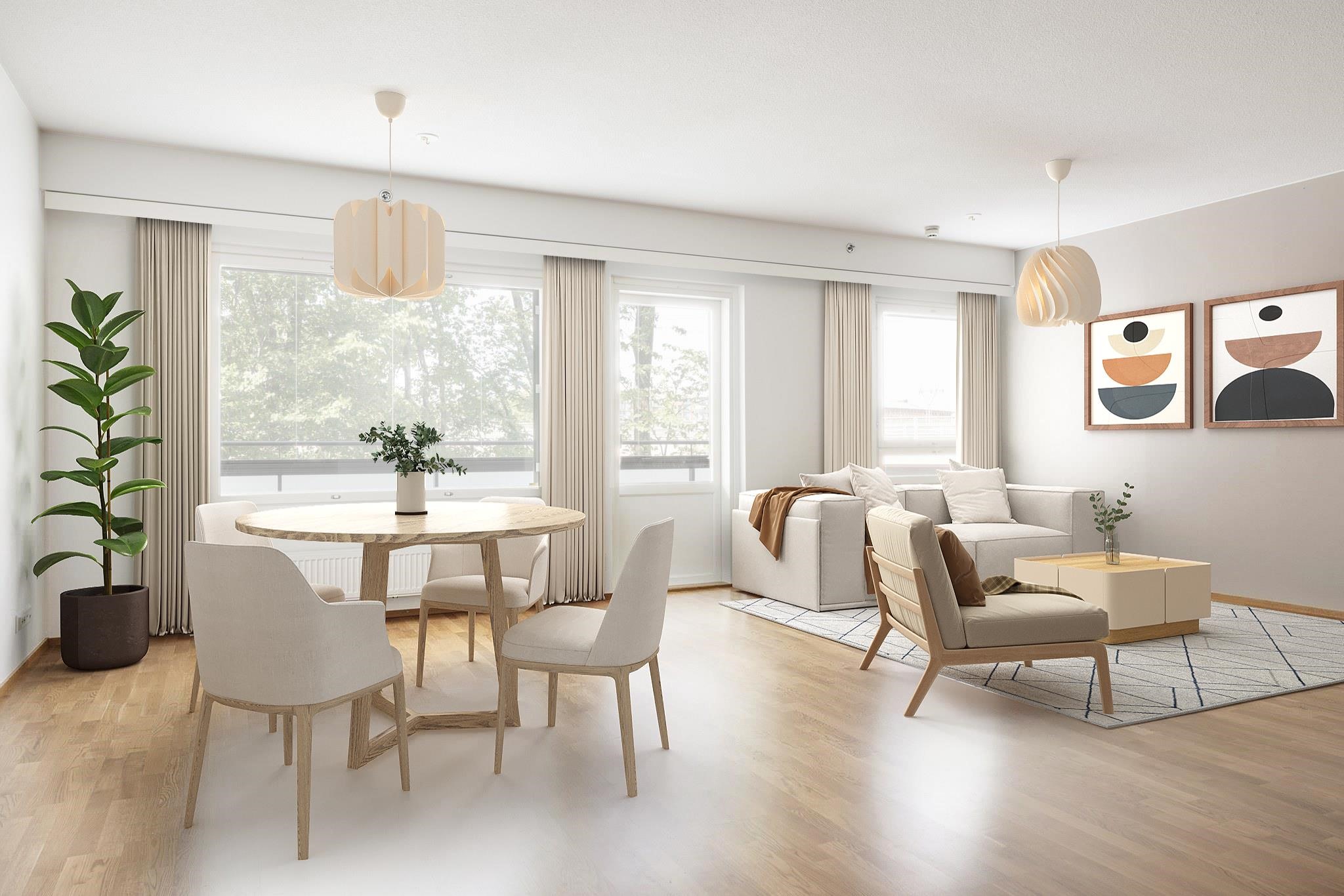 Puustoisin jokimaisemin tilava 2-3 huoneen koti heti vapaana