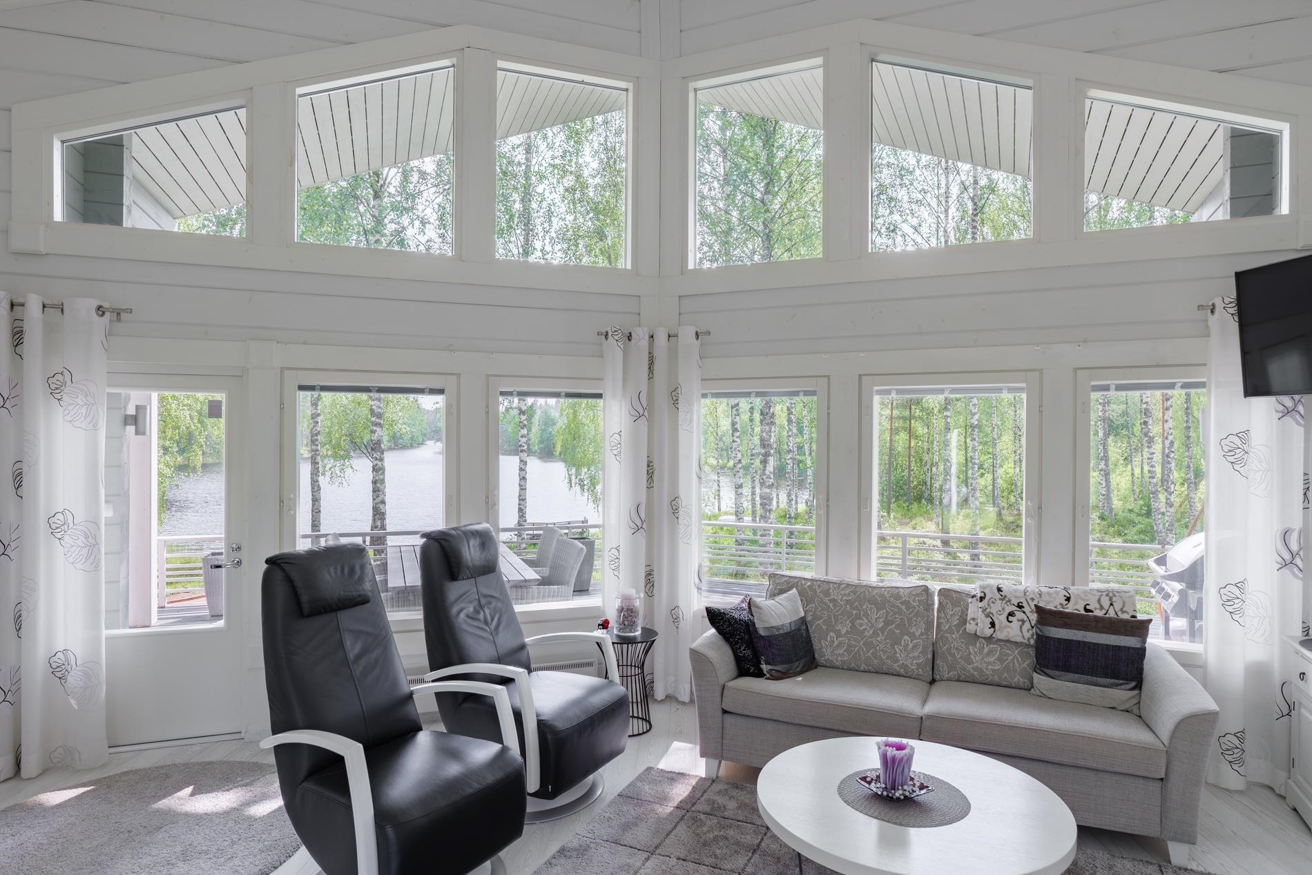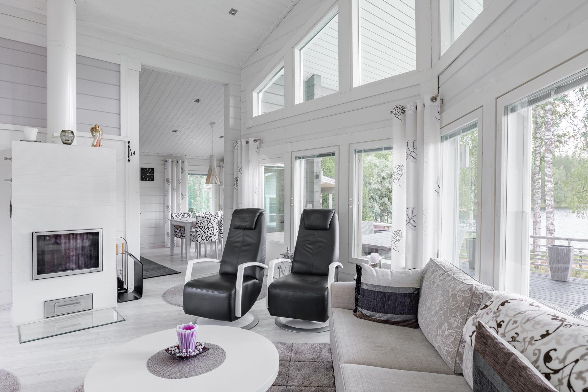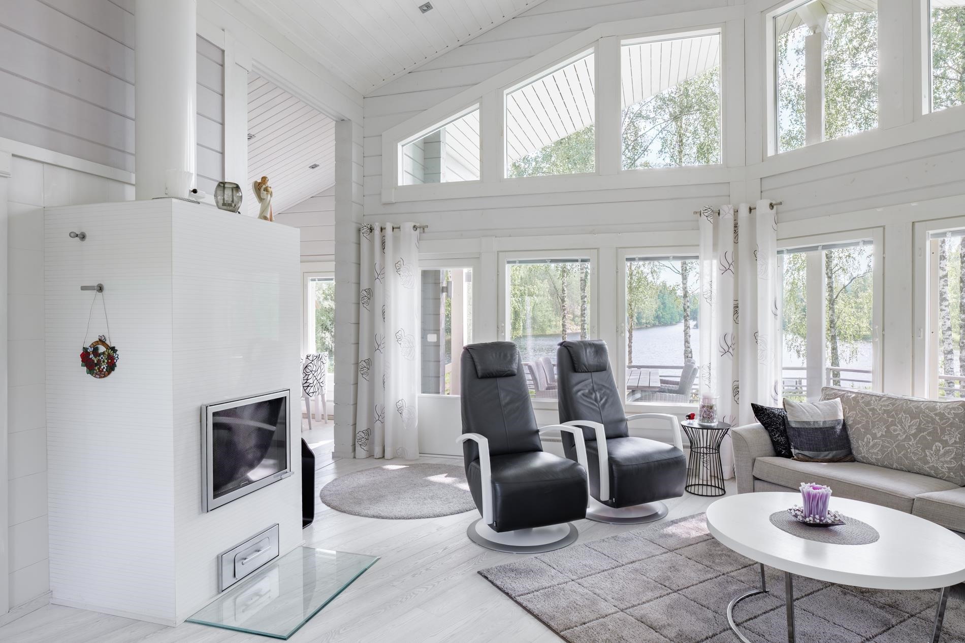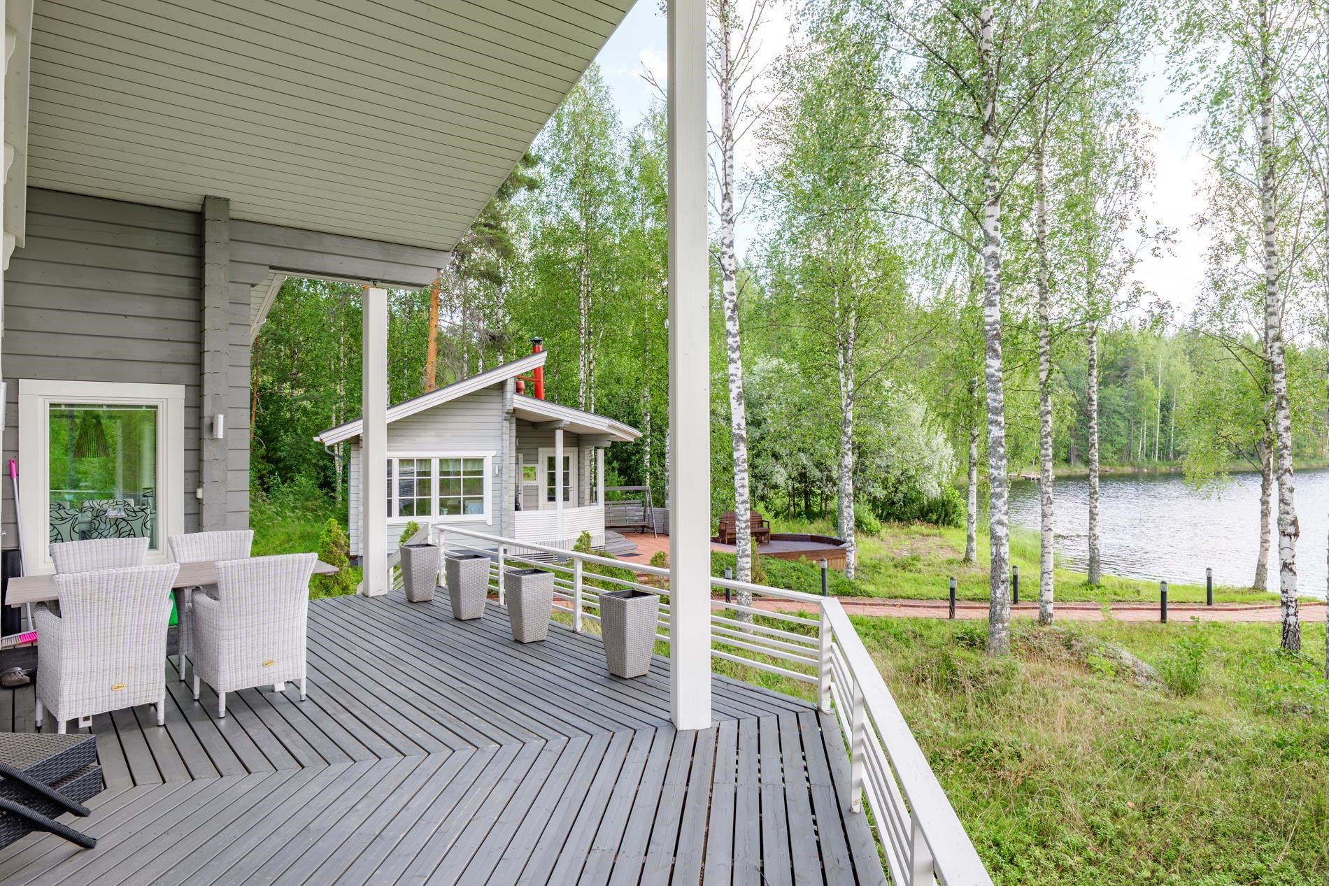 Päämökissä on toimiva pohjaratkaisu, olohuoneessa on isot lattiasta korkeaan kattoon isot ikkunat, mistä ihailet upeaa järvimaisemaa. Olohuoneessa on keskeisellä paikalla tyylikäs kaakelivuorattu varaava takka, missä iso lasiluukku josta ihailla rauhoittavaa tulenliekkiä. Tässä huvilassa on vaativallekin kokille varusteltu vaalensävyinen moderni keittiö AEG:n kodinkoneilla, kivitasoilla ja komposiitti pesualtaalla. Majoitukseen päämökissä on kaksi makuuhuonetta säilytyskomeroilla varustettuina. Iso kylpyhuone, missä suihku sekä pesukoneliitäntä lisää huvilan käyttömukavuutta. Täällä voit todellakin viettää vapaa-aikaa ympärivuotisesti, eikä mistään mukavuuksista tarvitse luopua, päinvastoin. Päämökin isolla, osaksi katetulla terassilla on tilaa grillille, ulkoruokapöydälle sekä aurinkotuoleille ja tilaa jää vielä muuhun touhuamiseen.