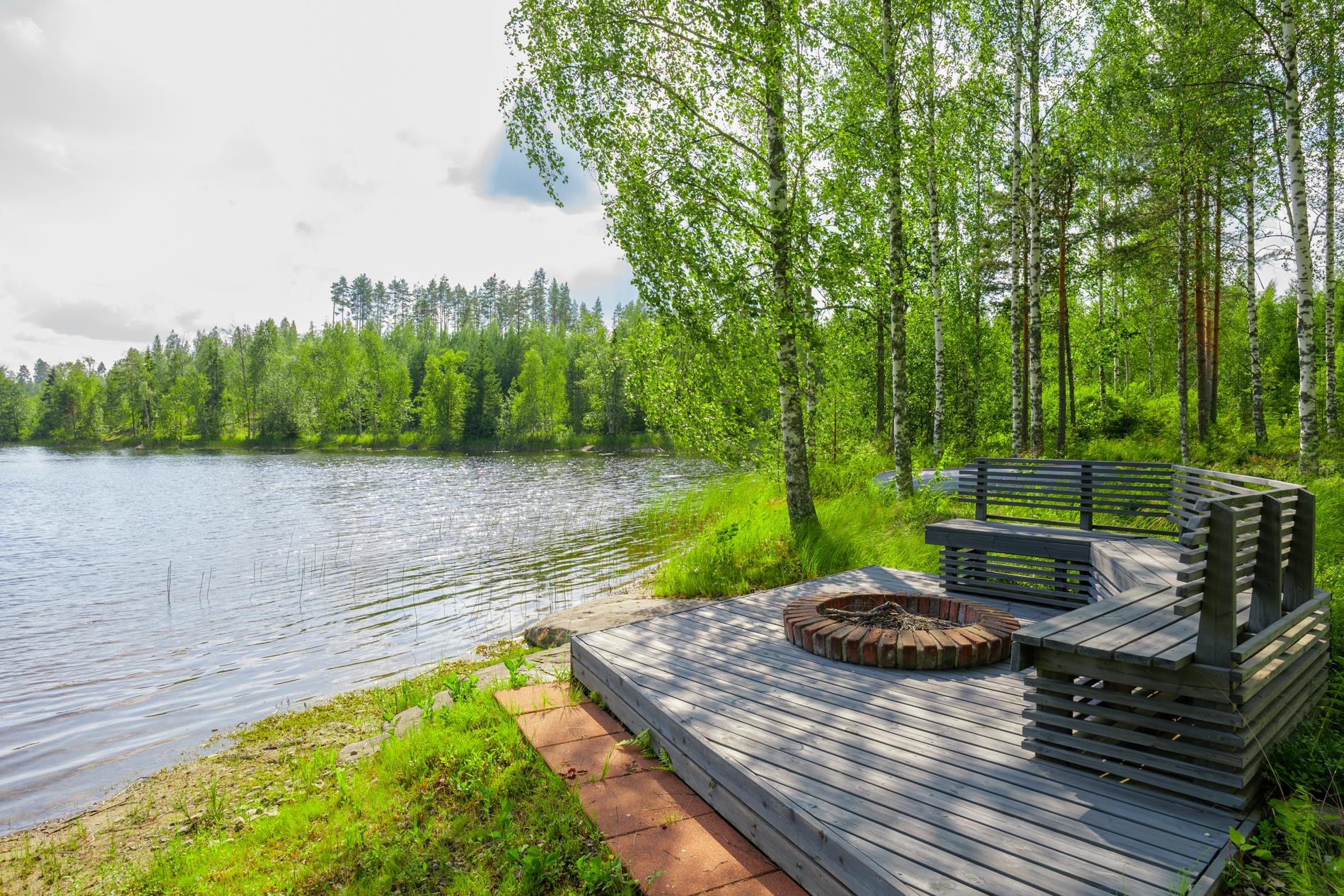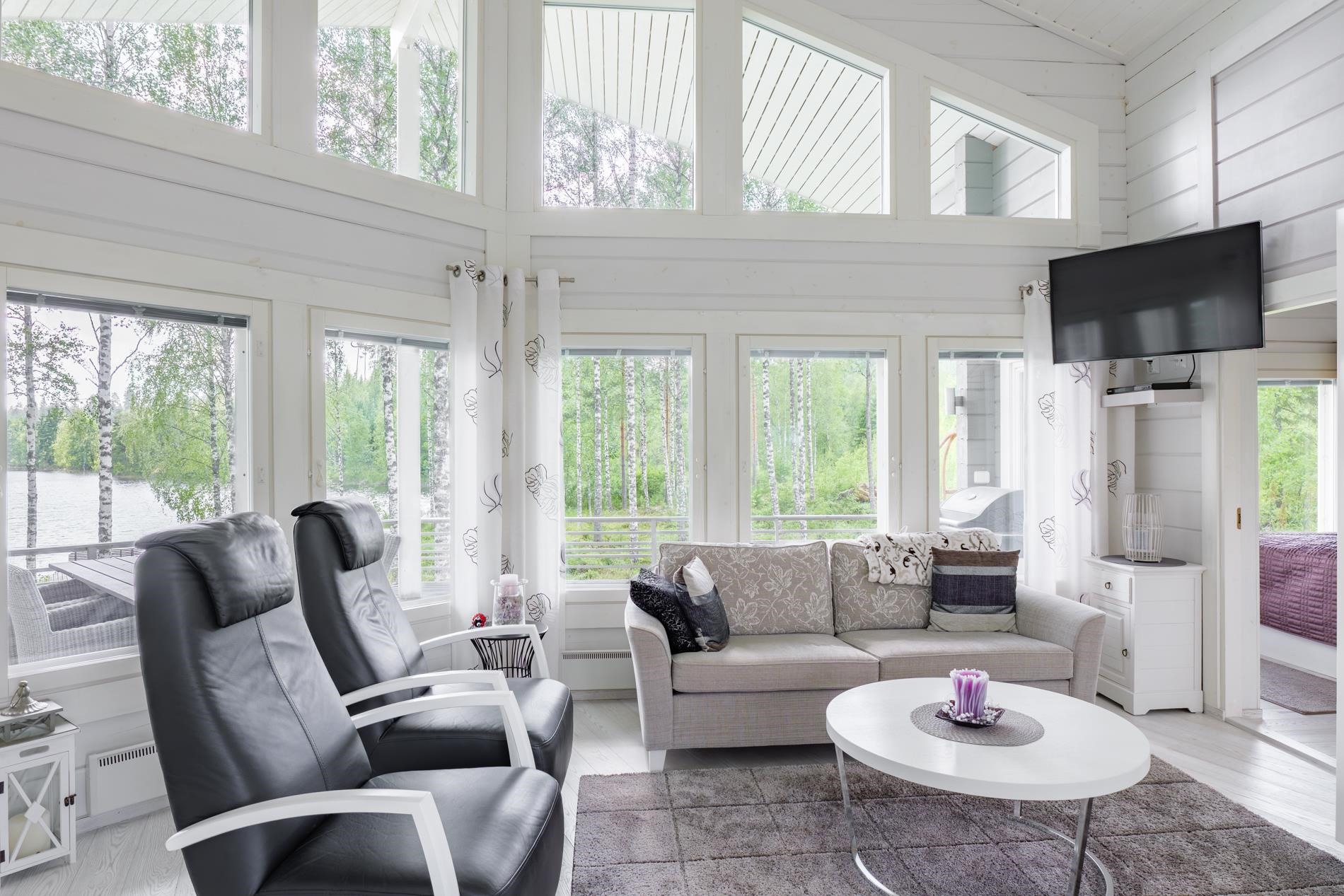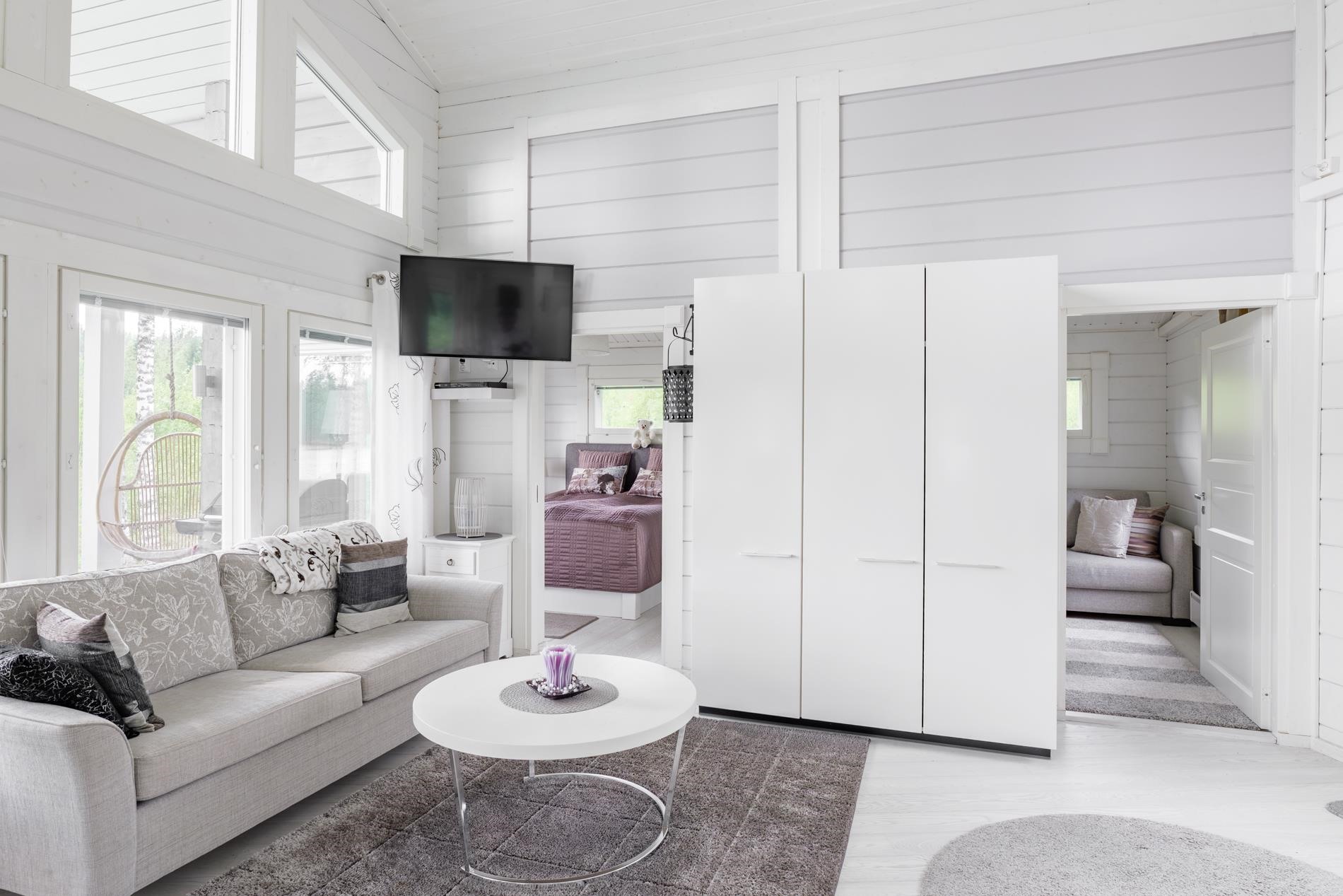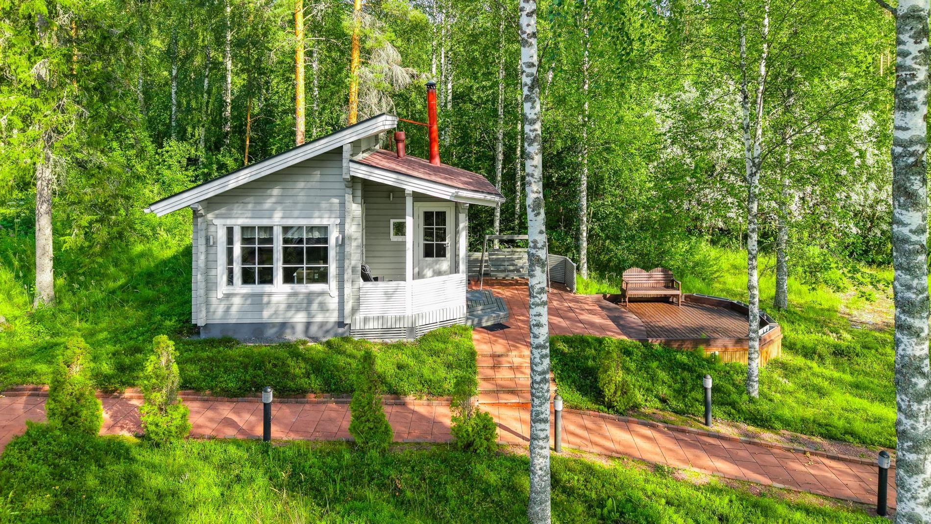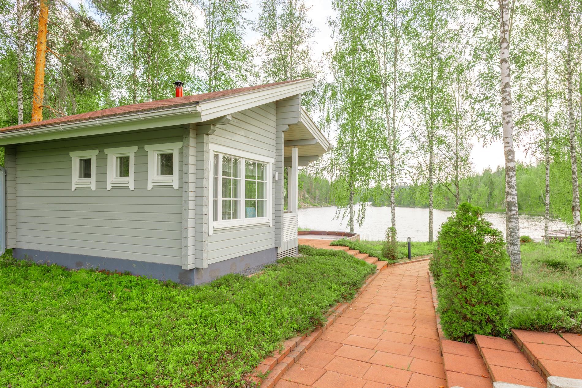 Päämökissä on toimiva pohjaratkaisu, olohuoneessa on isot lattiasta korkeaan kattoon isot ikkunat, mistä ihailet upeaa järvimaisemaa. Olohuoneessa on keskeisellä paikalla tyylikäs kaakelivuorattu varaava takka, missä iso lasiluukku josta ihailla rauhoittavaa tulenliekkiä. Tässä huvilassa on vaativallekin kokille varusteltu vaalensävyinen moderni keittiö AEG:n kodinkoneilla, kivitasoilla ja komposiitti pesualtaalla. Majoitukseen päämökissä on kaksi makuuhuonetta säilytyskomeroilla varustettuina. Iso kylpyhuone, missä suihku sekä pesukoneliitäntä lisää huvilan käyttömukavuutta. Täällä voit todellakin viettää vapaa-aikaa ympärivuotisesti, eikä mistään mukavuuksista tarvitse luopua, päinvastoin. Päämökin isolla, osaksi katetulla terassilla on tilaa grillille, ulkoruokapöydälle sekä aurinkotuoleille ja tilaa jää vielä muuhun touhuamiseen.