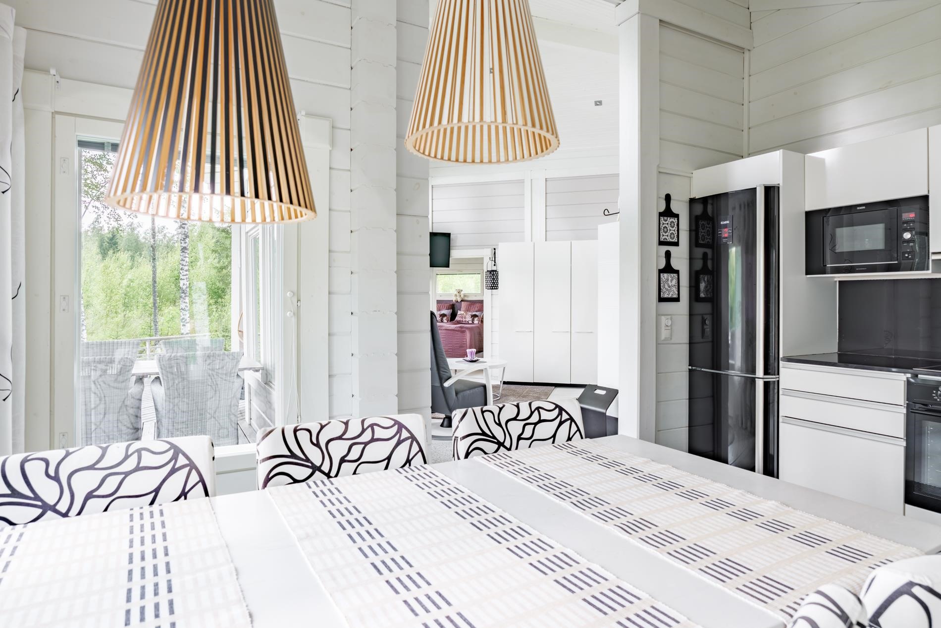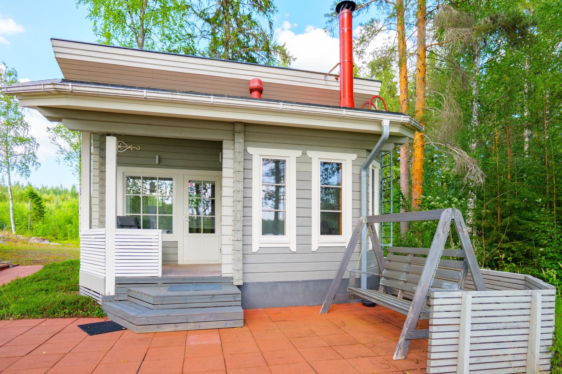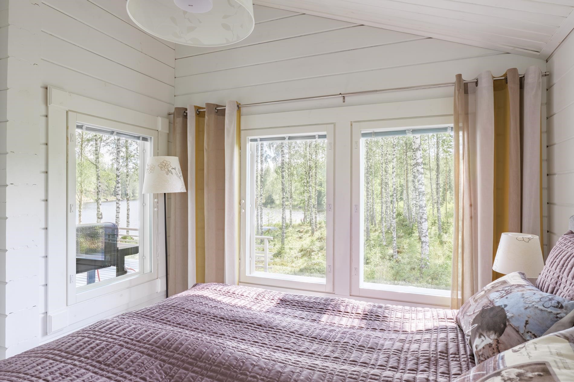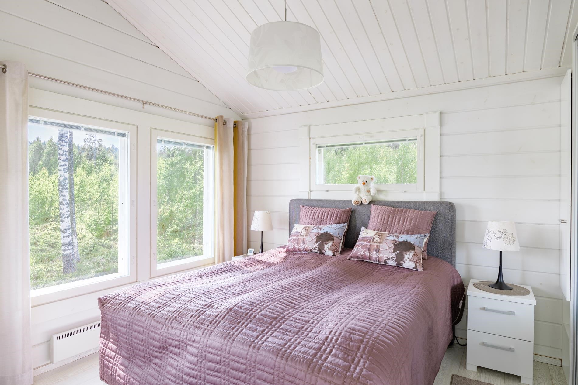 Päämökissä on toimiva pohjaratkaisu, olohuoneessa on isot lattiasta korkeaan kattoon isot ikkunat, mistä ihailet upeaa järvimaisemaa. Olohuoneessa on keskeisellä paikalla tyylikäs kaakelivuorattu varaava takka, missä iso lasiluukku josta ihailla rauhoittavaa tulenliekkiä. Tässä huvilassa on vaativallekin kokille varusteltu vaalensävyinen moderni keittiö AEG:n kodinkoneilla, kivitasoilla ja komposiitti pesualtaalla. Majoitukseen päämökissä on kaksi makuuhuonetta säilytyskomeroilla varustettuina. Iso kylpyhuone, missä suihku sekä pesukoneliitäntä lisää huvilan käyttömukavuutta. Täällä voit todellakin viettää vapaa-aikaa ympärivuotisesti, eikä mistään mukavuuksista tarvitse luopua, päinvastoin. Päämökin isolla, osaksi katetulla terassilla on tilaa grillille, ulkoruokapöydälle sekä aurinkotuoleille ja tilaa jää vielä muuhun touhuamiseen.