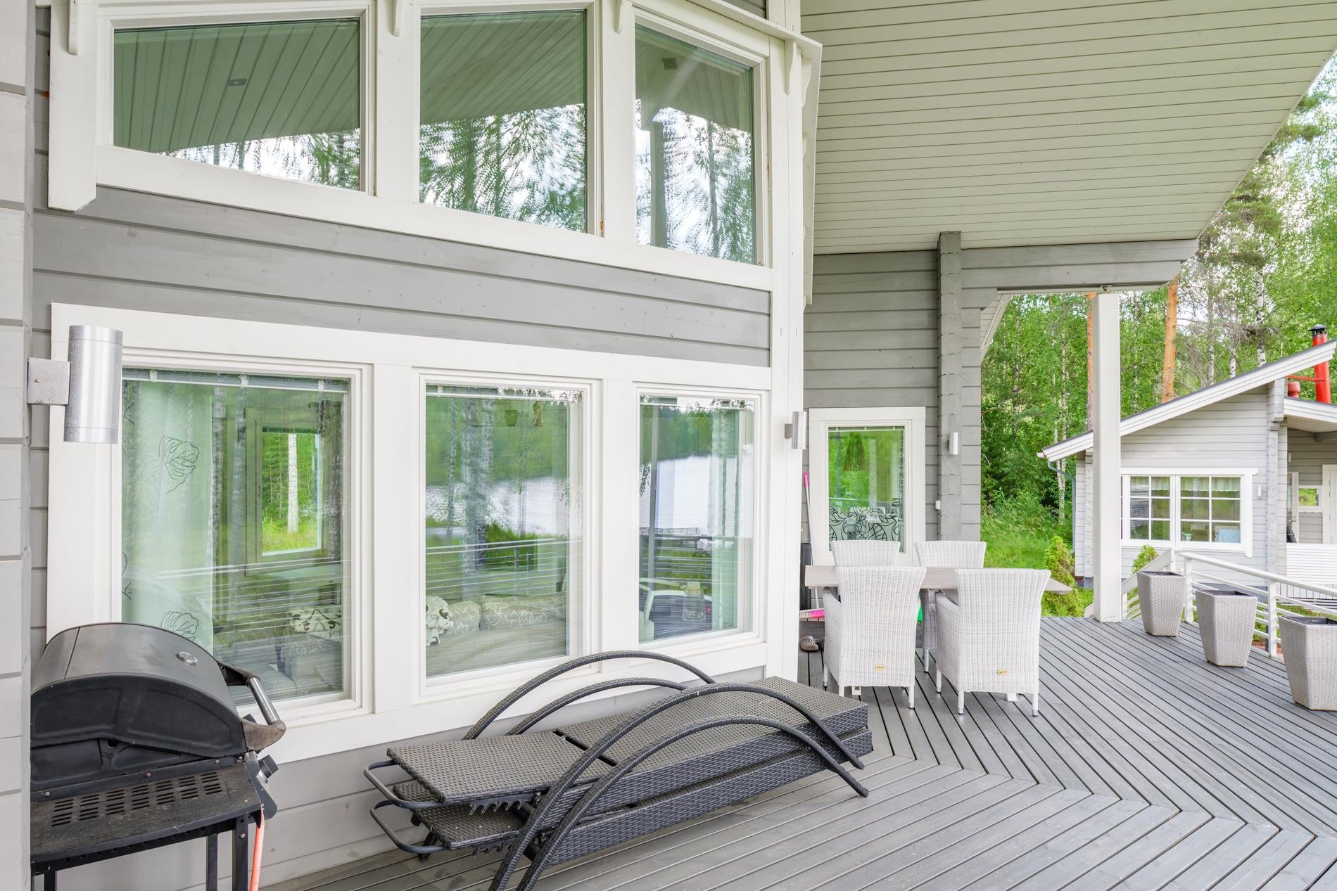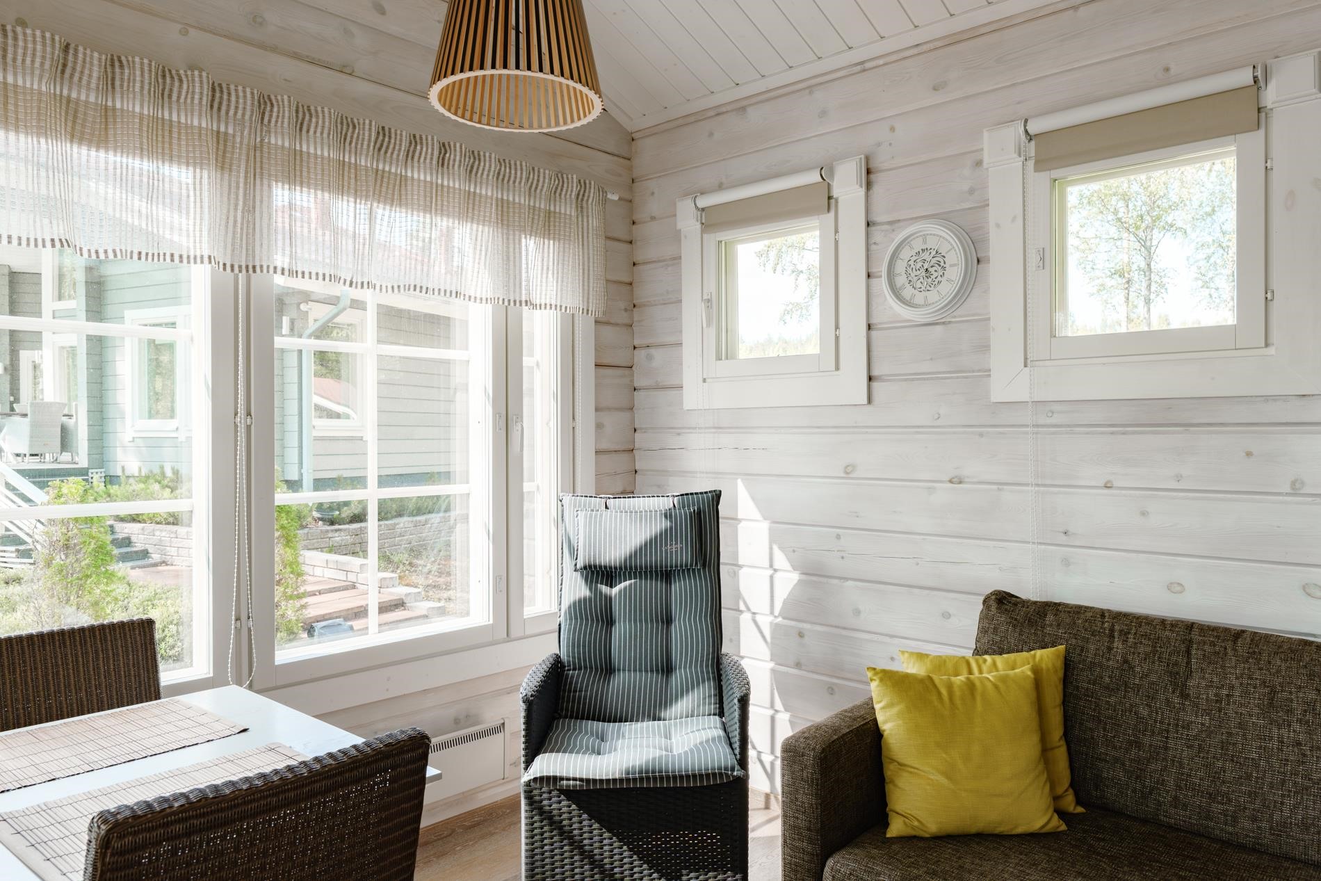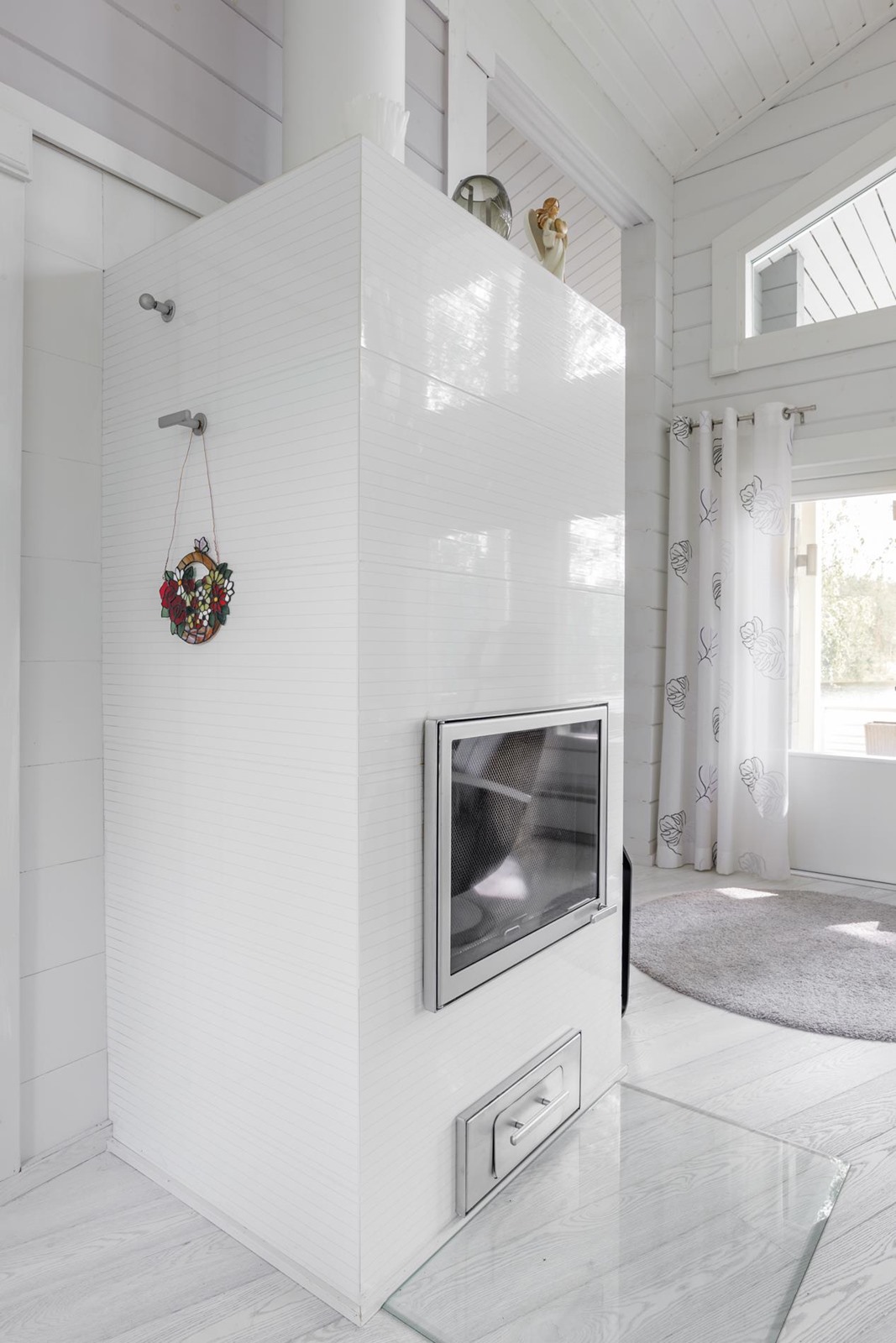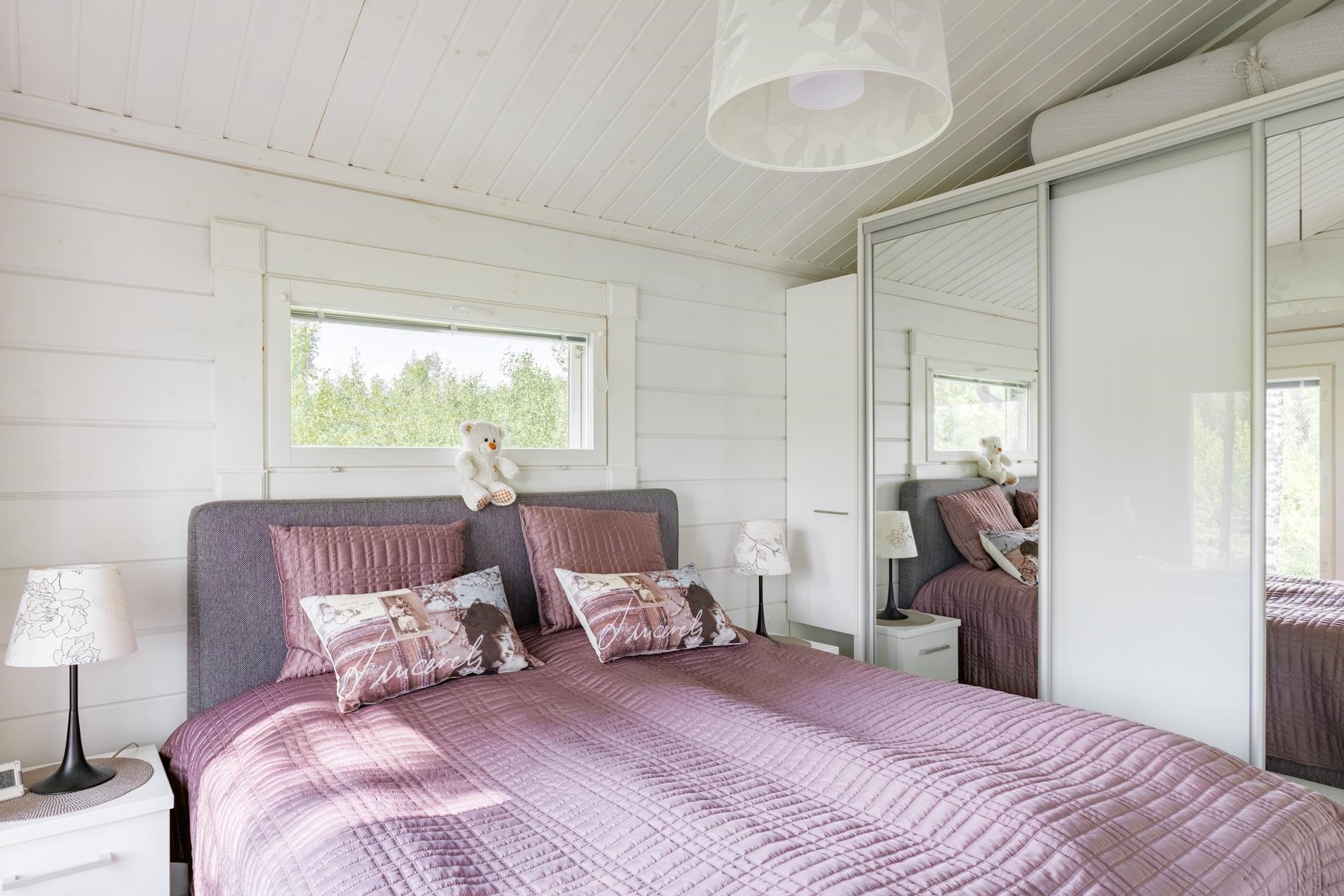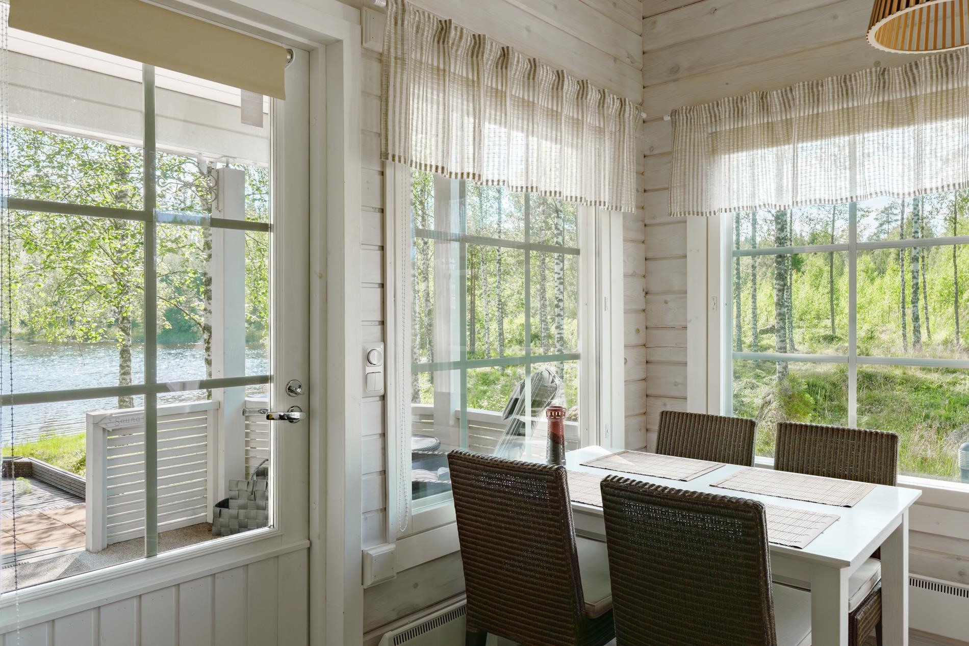 Päämökissä on toimiva pohjaratkaisu, olohuoneessa on isot lattiasta korkeaan kattoon isot ikkunat, mistä ihailet upeaa järvimaisemaa. Olohuoneessa on keskeisellä paikalla tyylikäs kaakelivuorattu varaava takka, missä iso lasiluukku josta ihailla rauhoittavaa tulenliekkiä. Tässä huvilassa on vaativallekin kokille varusteltu vaalensävyinen moderni keittiö AEG:n kodinkoneilla, kivitasoilla ja komposiitti pesualtaalla. Majoitukseen päämökissä on kaksi makuuhuonetta säilytyskomeroilla varustettuina. Iso kylpyhuone, missä suihku sekä pesukoneliitäntä lisää huvilan käyttömukavuutta. Täällä voit todellakin viettää vapaa-aikaa ympärivuotisesti, eikä mistään mukavuuksista tarvitse luopua, päinvastoin. Päämökin isolla, osaksi katetulla terassilla on tilaa grillille, ulkoruokapöydälle sekä aurinkotuoleille ja tilaa jää vielä muuhun touhuamiseen.