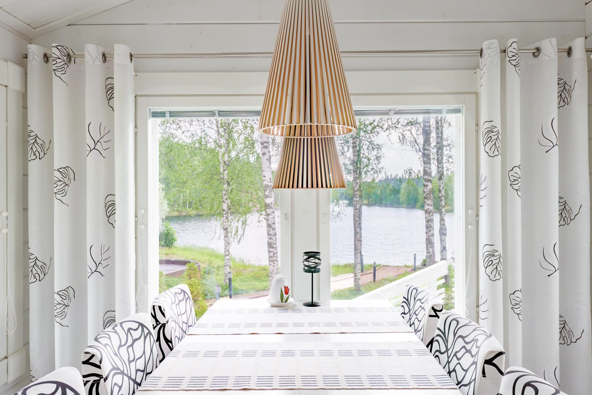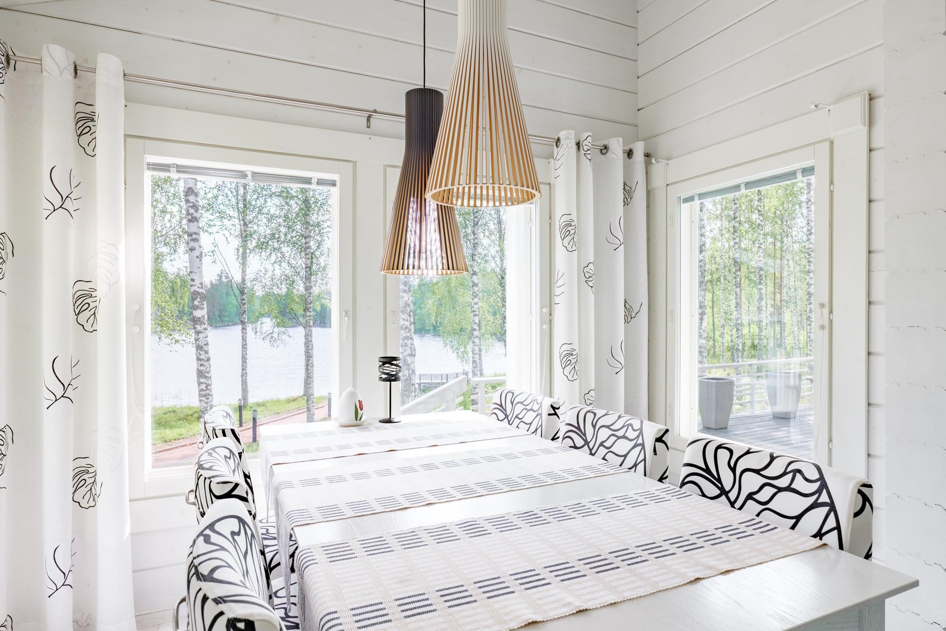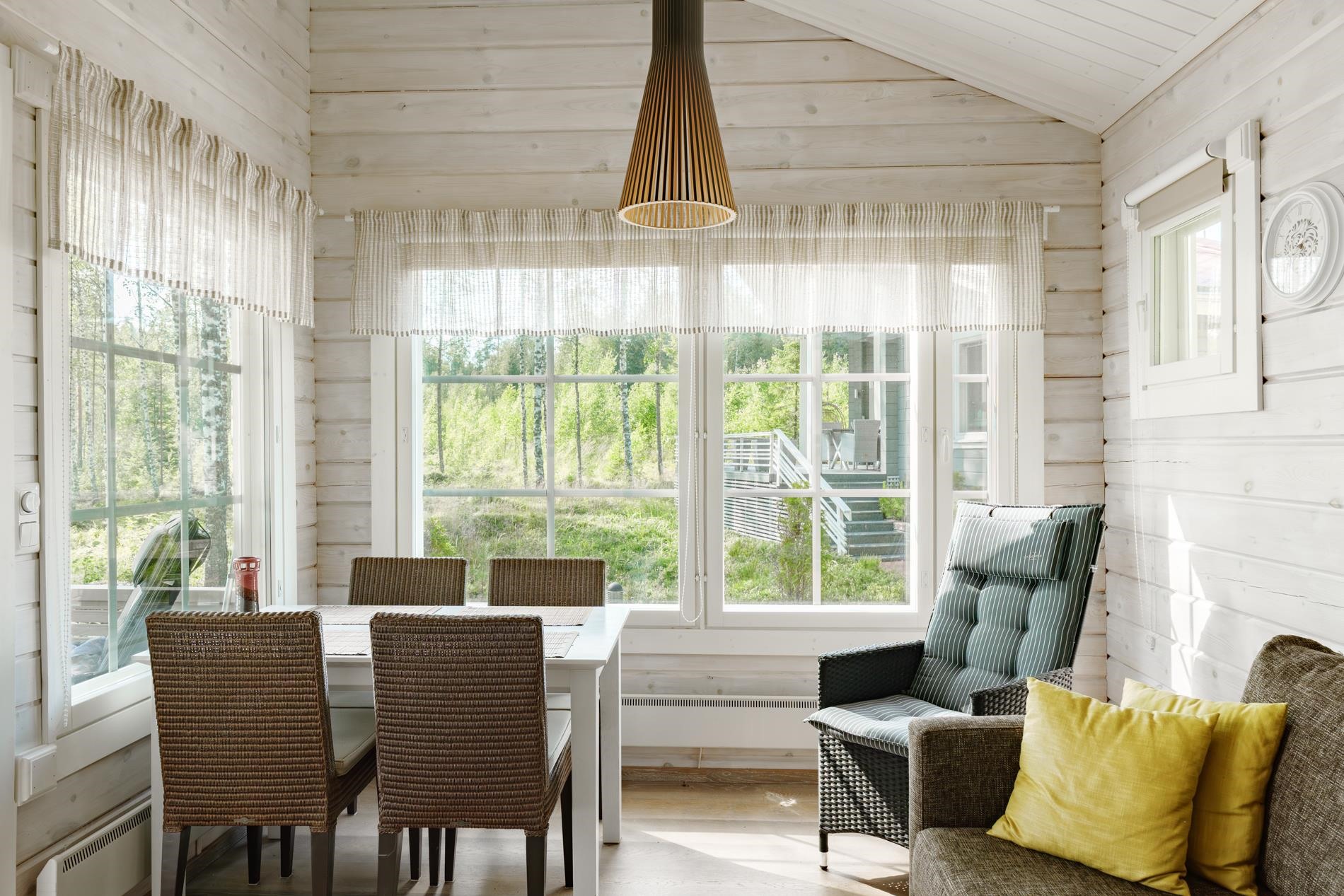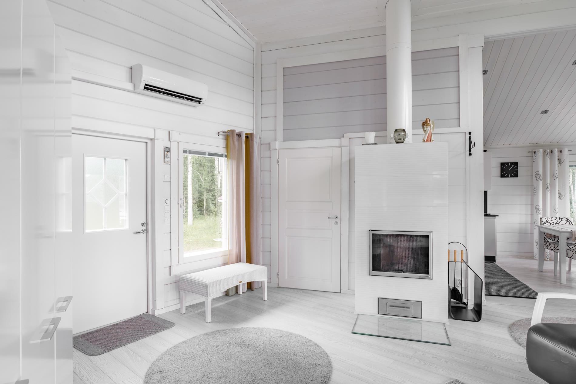 Päämökissä on toimiva pohjaratkaisu, olohuoneessa on isot lattiasta korkeaan kattoon isot ikkunat, mistä ihailet upeaa järvimaisemaa. Olohuoneessa on keskeisellä paikalla tyylikäs kaakelivuorattu varaava takka, missä iso lasiluukku josta ihailla rauhoittavaa tulenliekkiä. Tässä huvilassa on vaativallekin kokille varusteltu vaalensävyinen moderni keittiö AEG:n kodinkoneilla, kivitasoilla ja komposiitti pesualtaalla. Majoitukseen päämökissä on kaksi makuuhuonetta säilytyskomeroilla varustettuina. Iso kylpyhuone, missä suihku sekä pesukoneliitäntä lisää huvilan käyttömukavuutta. Täällä voit todellakin viettää vapaa-aikaa ympärivuotisesti, eikä mistään mukavuuksista tarvitse luopua, päinvastoin. Päämökin isolla, osaksi katetulla terassilla on tilaa grillille, ulkoruokapöydälle sekä aurinkotuoleille ja tilaa jää vielä muuhun touhuamiseen.