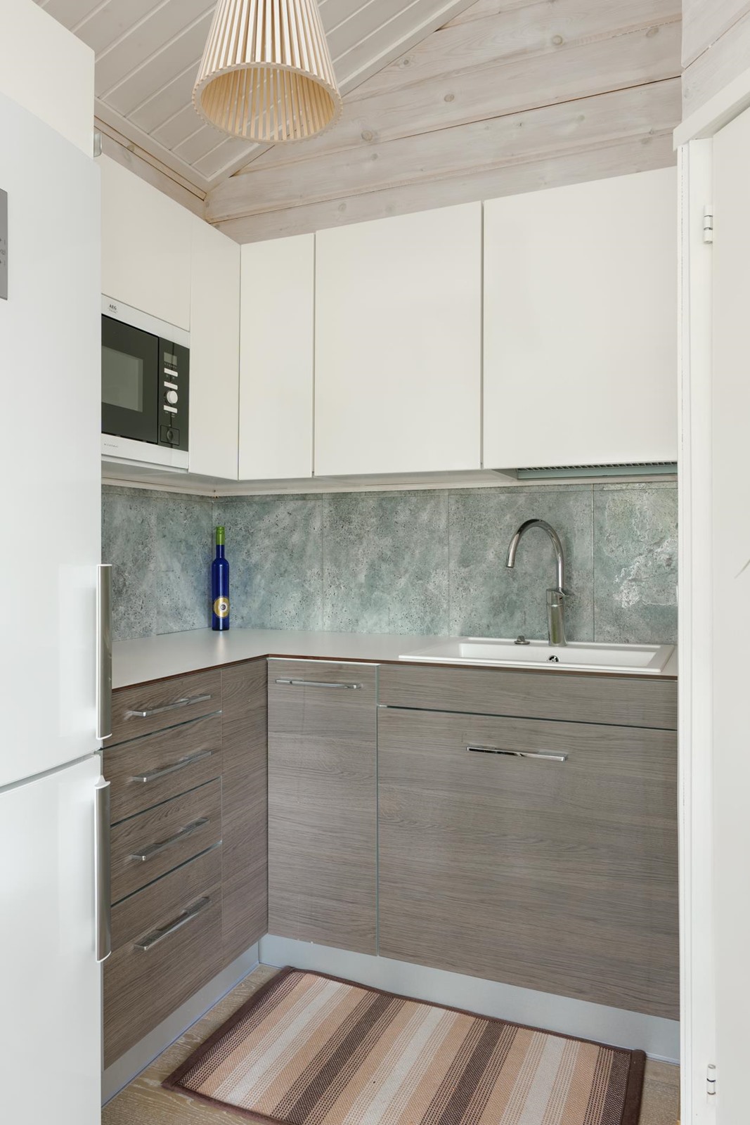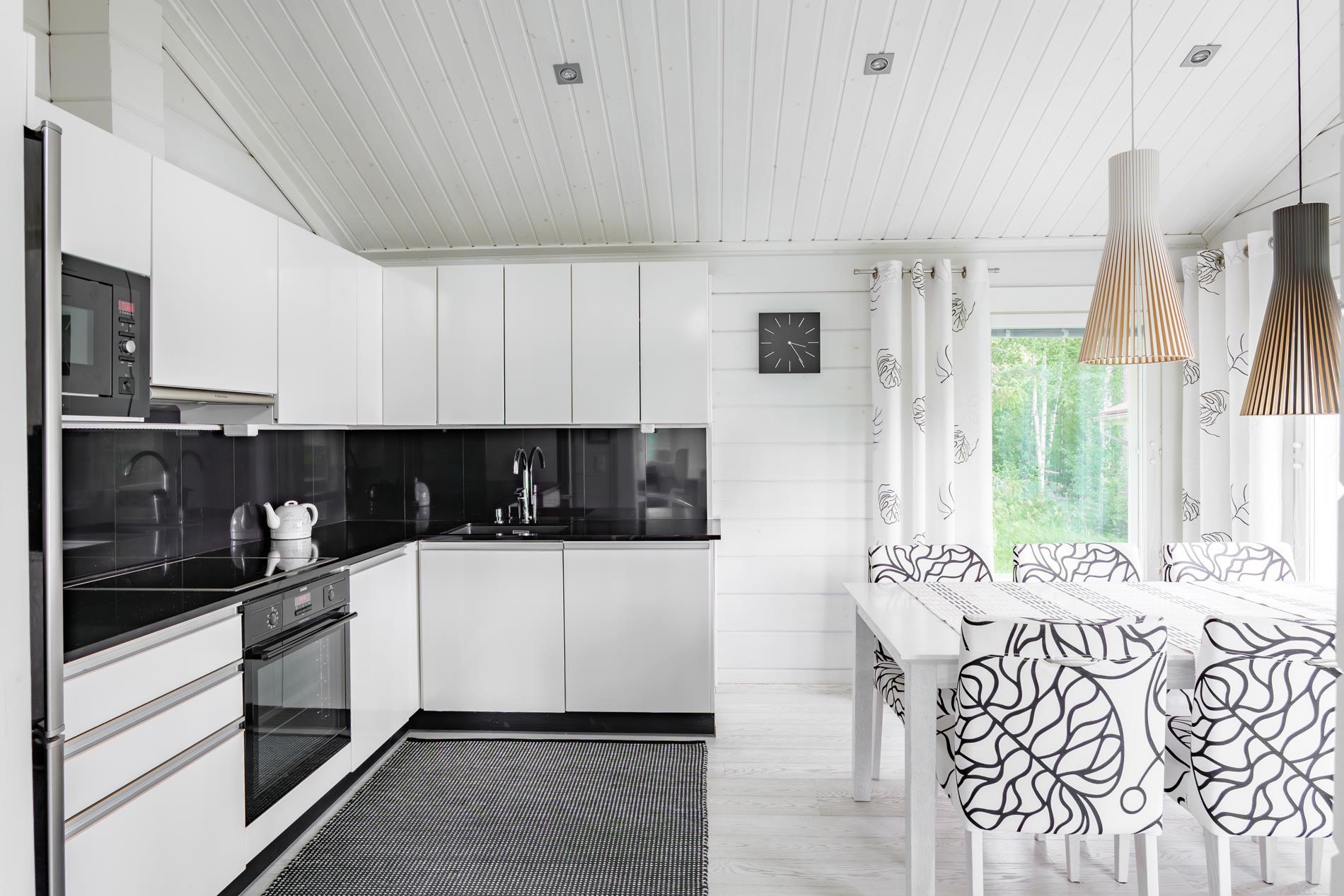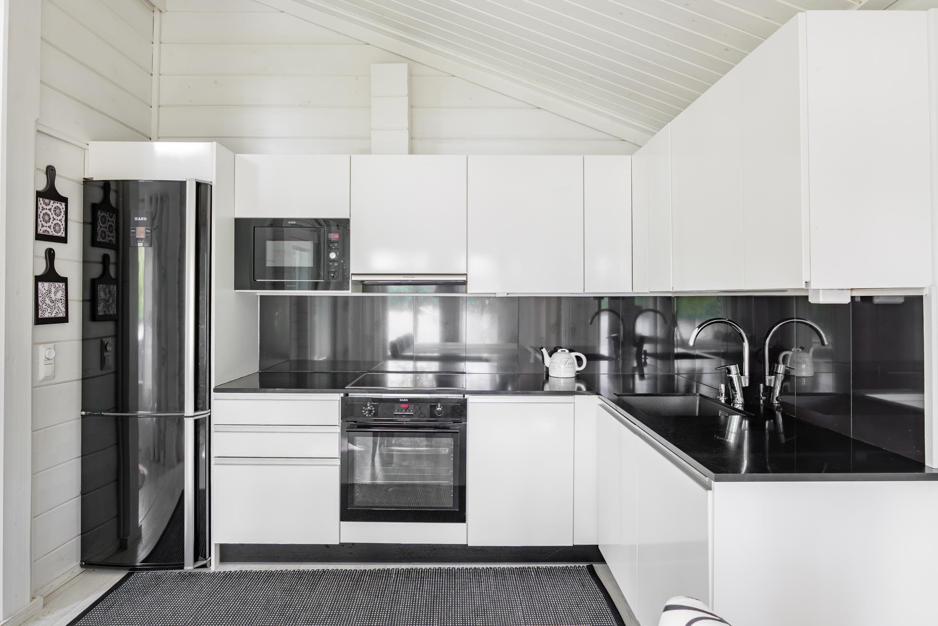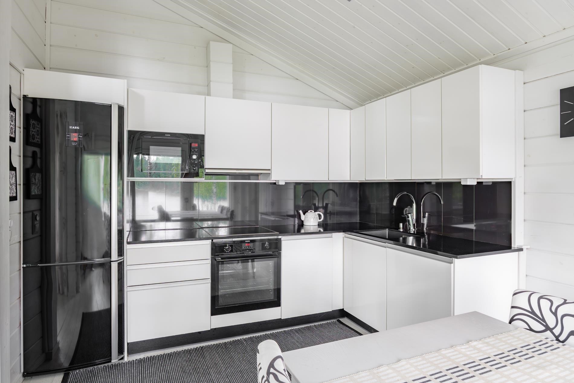 - Jääkaappipakastin, erillisuuni, induktioliesi, liesituuletin, mikroaaltouuni, astianpesukone, kaapistot, kiinteät valaisimet, pöytätasojen materiaali Kivitasot.