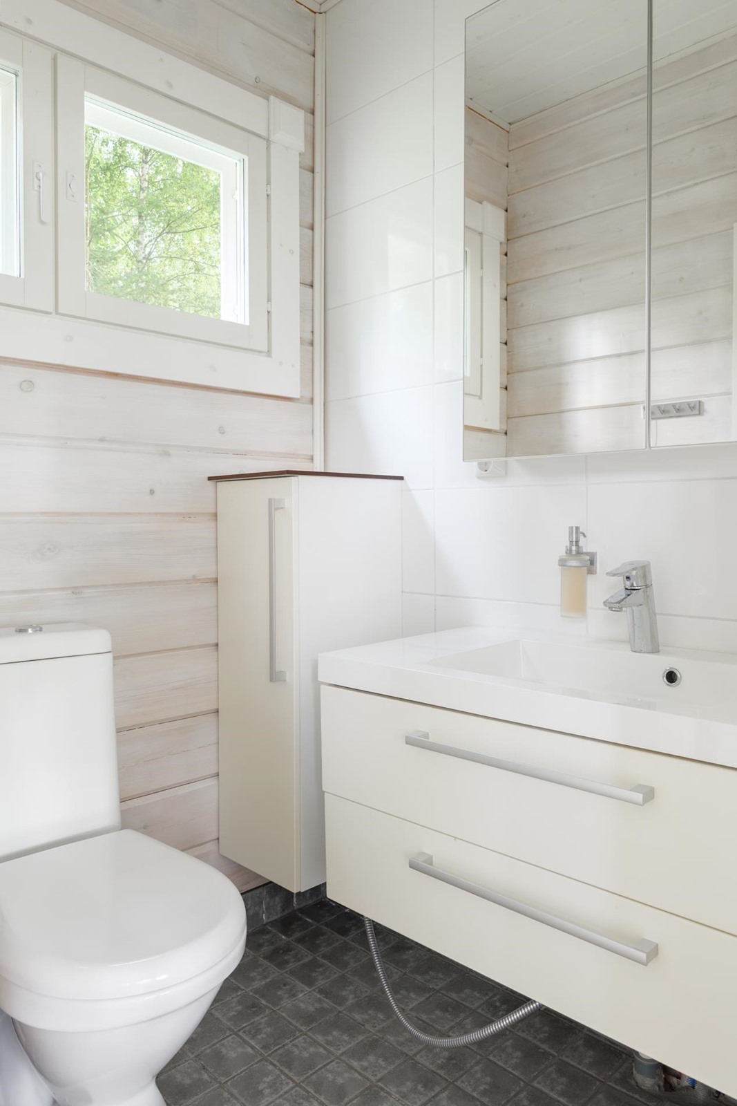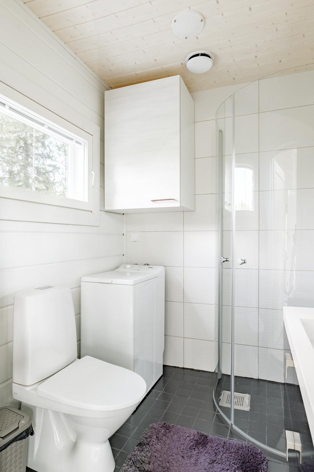 - Sauna, puukiuas, kylpyhuone päämökki, erillinen wc molemmissa mökeissä, suihku, peilit, kaapit, allaskaappi, pesukoneliitäntä päämökin kph, lattialämmitys kph, s, pesuhuone, sähkö, kiinteät valaisimet.