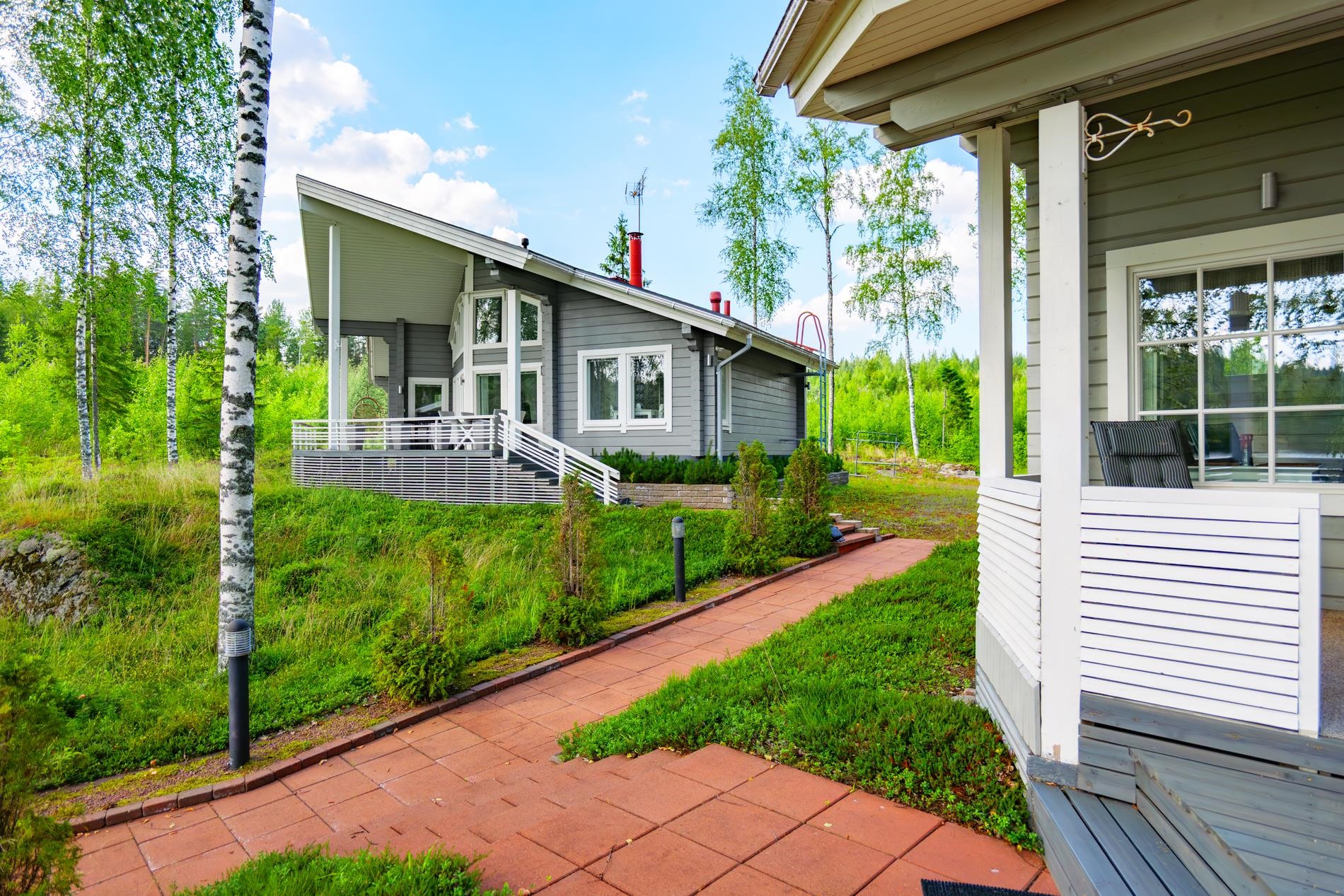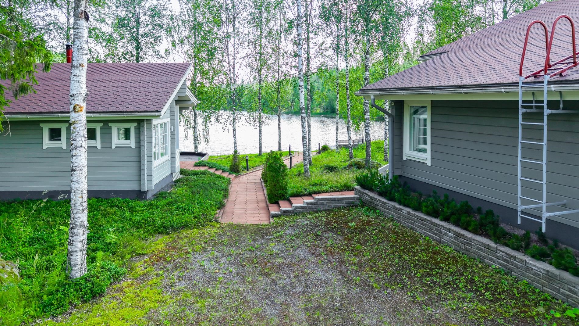 Piha on hyvin suunniteltu ja kauniisti ja rytmikkäästi toteutettu. Useat terassit ja huolella toteutetut siistit kivetykset on hienosti sulautettu tontin muotoihin ja korkeuseroihin sopiviksi ja kulkevat harmonisesti kauniin luonnon maiseman katveessa. Etupihalla on hyvin tilaa useammalle autolle, sekä hyvät säilytystilat tarvittaville huoltokoneille ja työkaluille sekä puuliiteri polttopuille.
