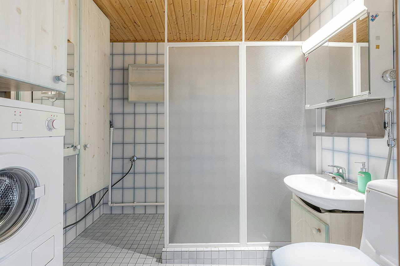- Kylpyhuone, erillinen wc, suihku, suihkuseinä, peilikaappi, allaskaappi, kiinteät valaisimet.