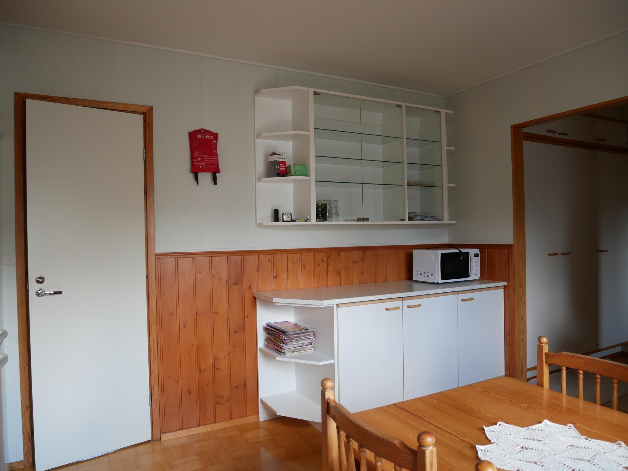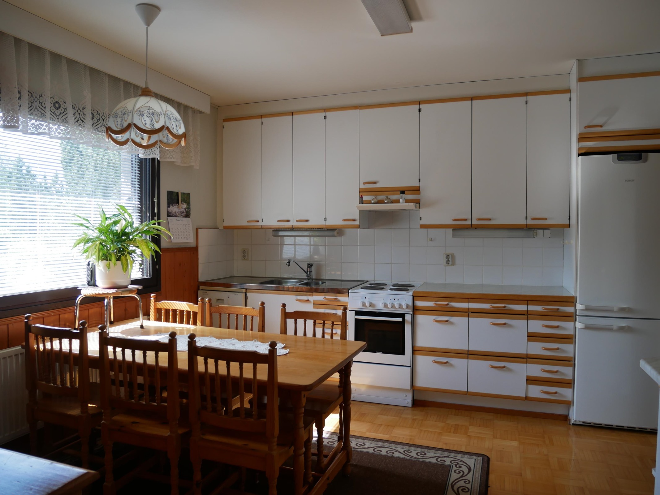 - Jääkaappipakastin, lattialiesi, sähköliesi, liesituuletin, mikroaaltouuni, astianpesukone, kaapistot, kiinteät valaisimet, pöytätasojen materiaali levy.