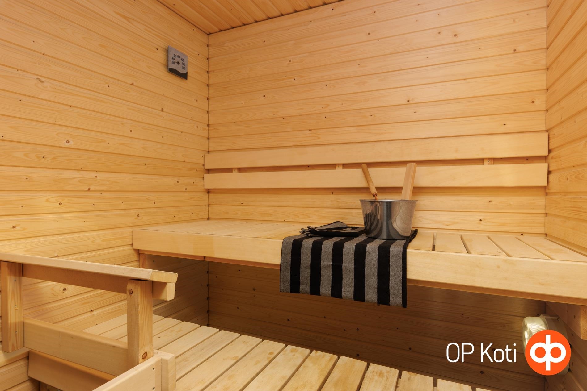 - Sauna, sähkökiuas, kylpyhuone, suihku, suihkuseinä, peilikaappi, allaskaappi, pesukoneliitäntä, lattialämmitys, kiinteät valaisimet.