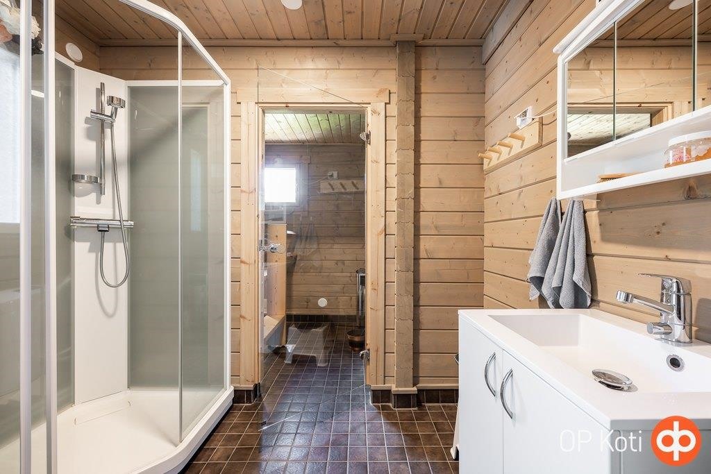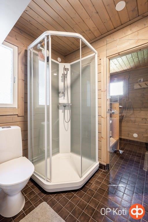- Sauna, sähkökiuas, kylpyhuone, suihku, suihkukaappi, poreallas Cello Ruka Spa (2018), peilikaappi, allaskaappi, lattialämmitys sähköinen.