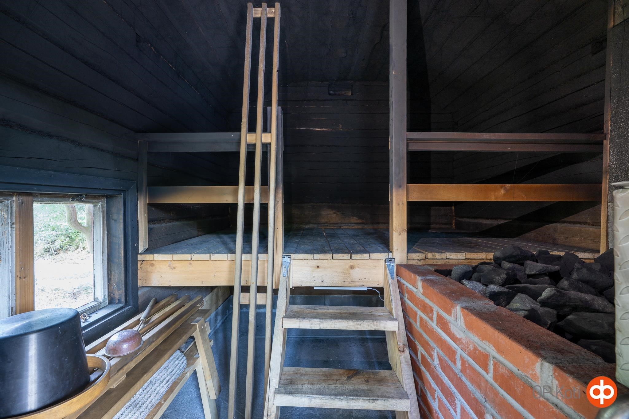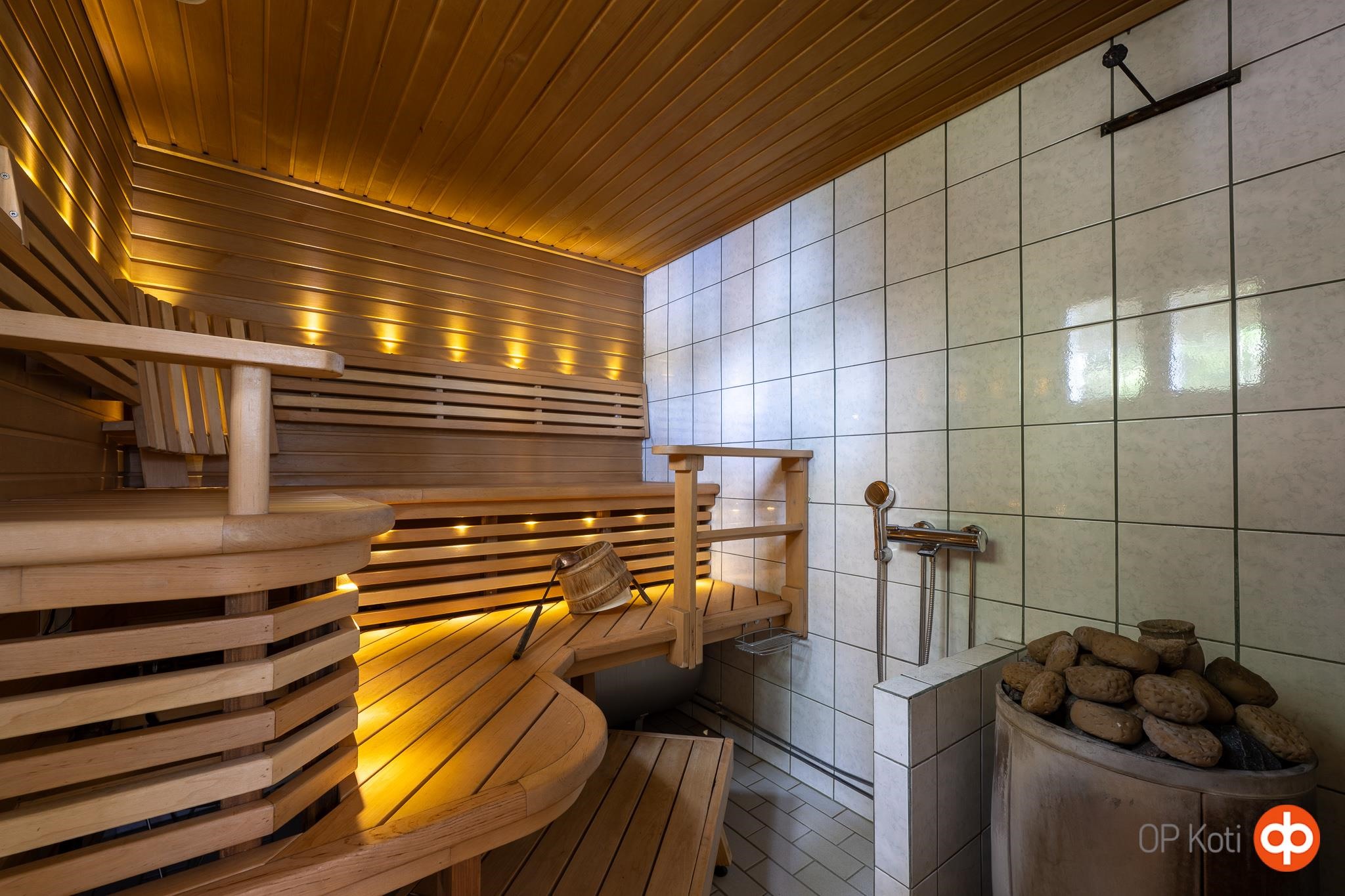 - Sauna, puukiuas, erillinen wc, suihku saunatilassa, peilikaappi, kaapit, allaskaappi, lattialämmitys wc:ssä, kiinteät valaisimet. Saunatilassa suihku sekä lämminvesivaraaja.