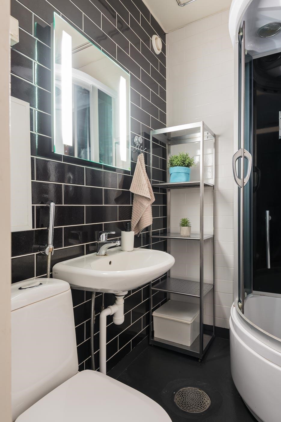 - Kylpyhuoneessa on suihku, suihkukaappi, peilit ja kiinteät valaisimet.