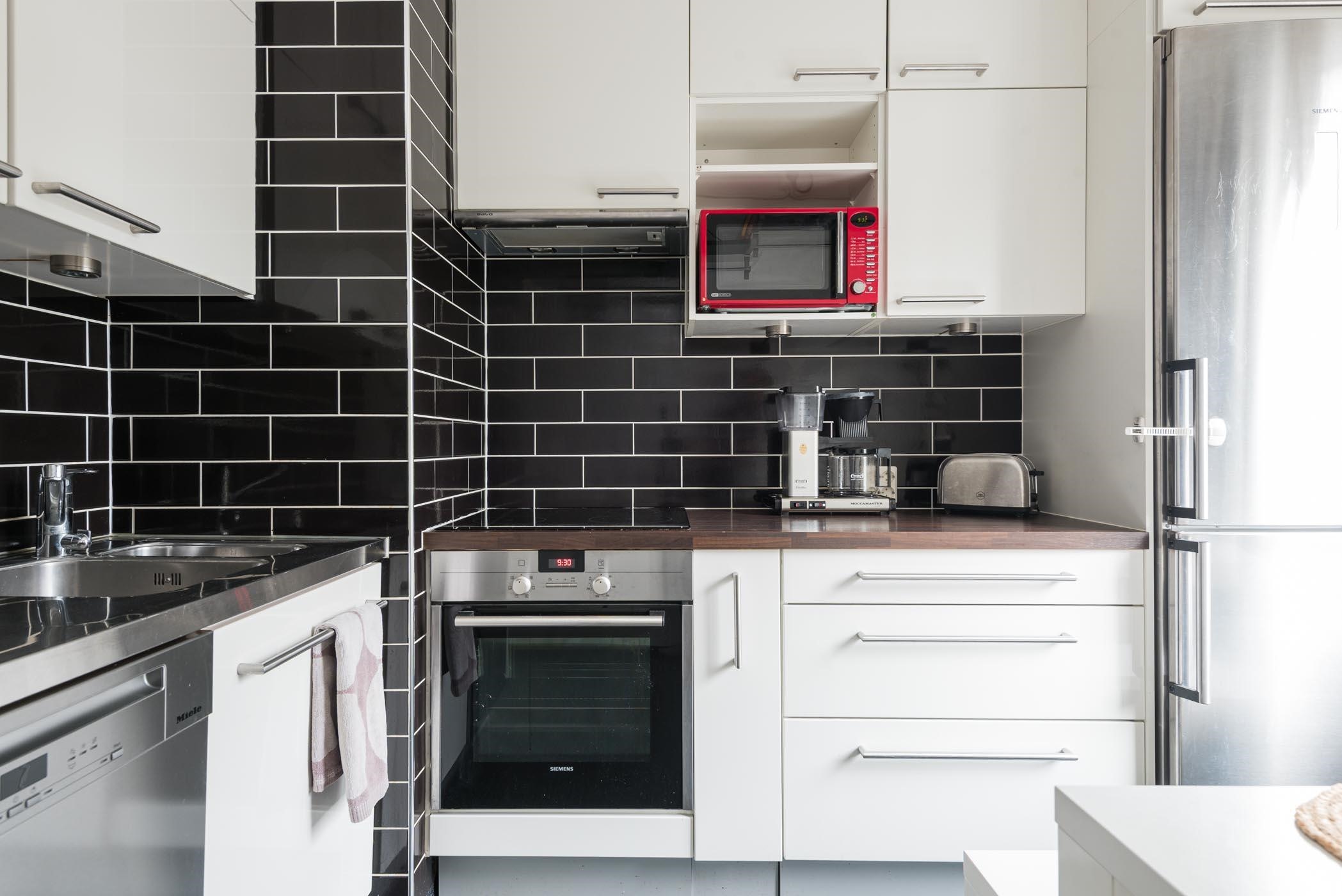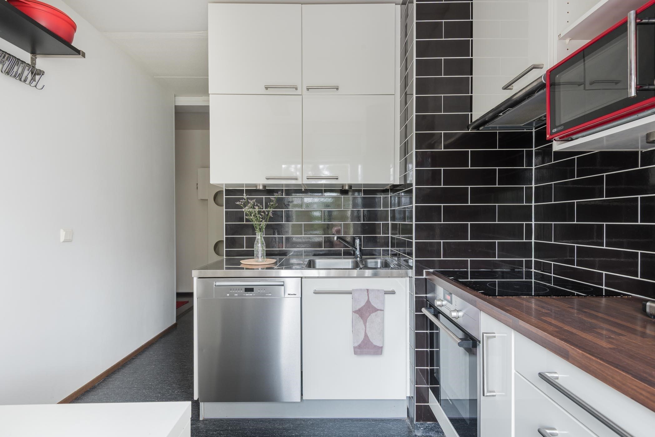 - Keittiöstä löytyy jääkaappipakastin, erillisuuni, induktioliesitaso, liesituuletin, astianpesukone, kaapistot ja kiinteät valaisimet.