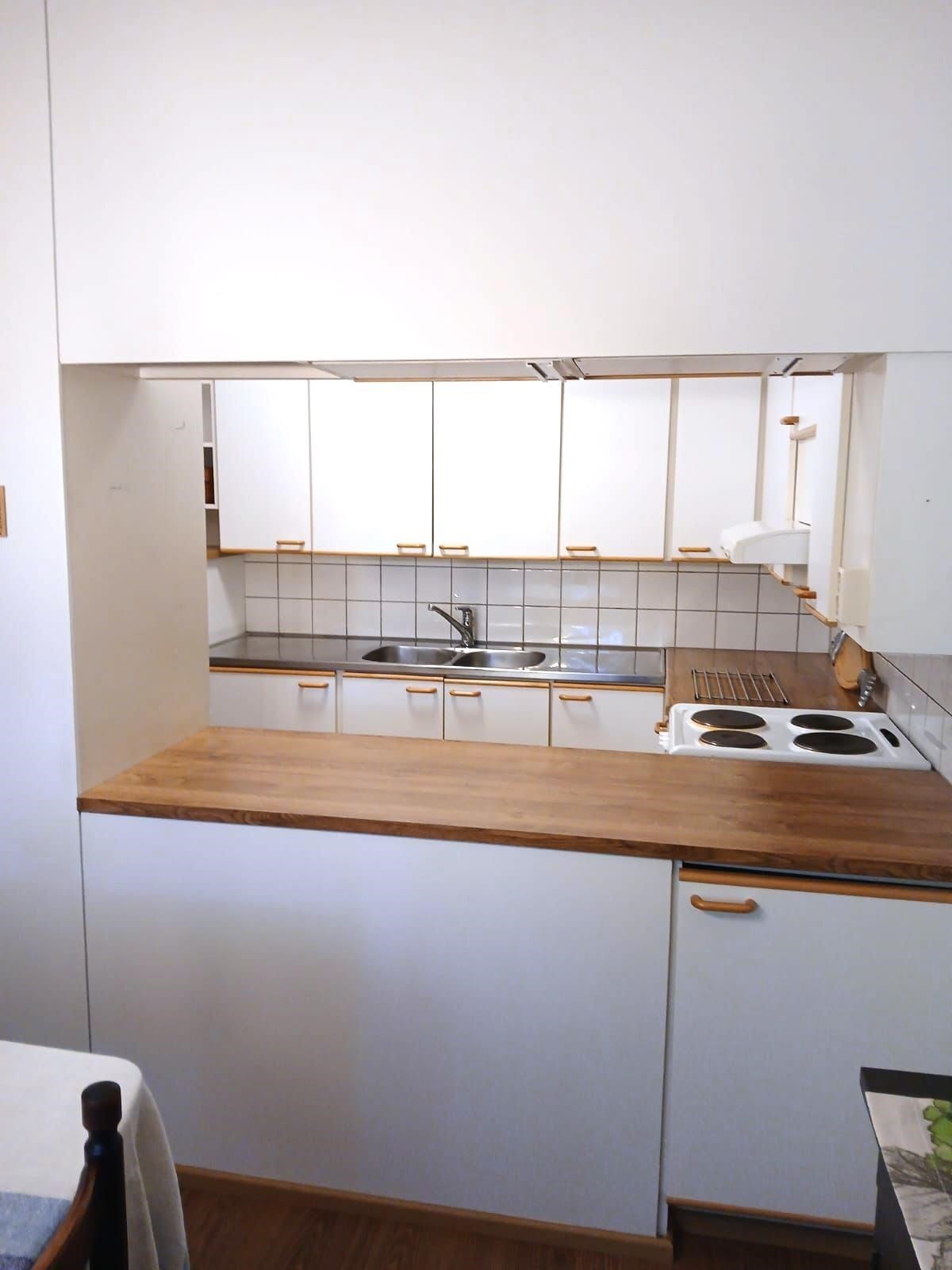 - Jääkaappipakastin, sähköliesi, liesituuletin, astianpesukone, kaapistot, kiinteät valaisimet.