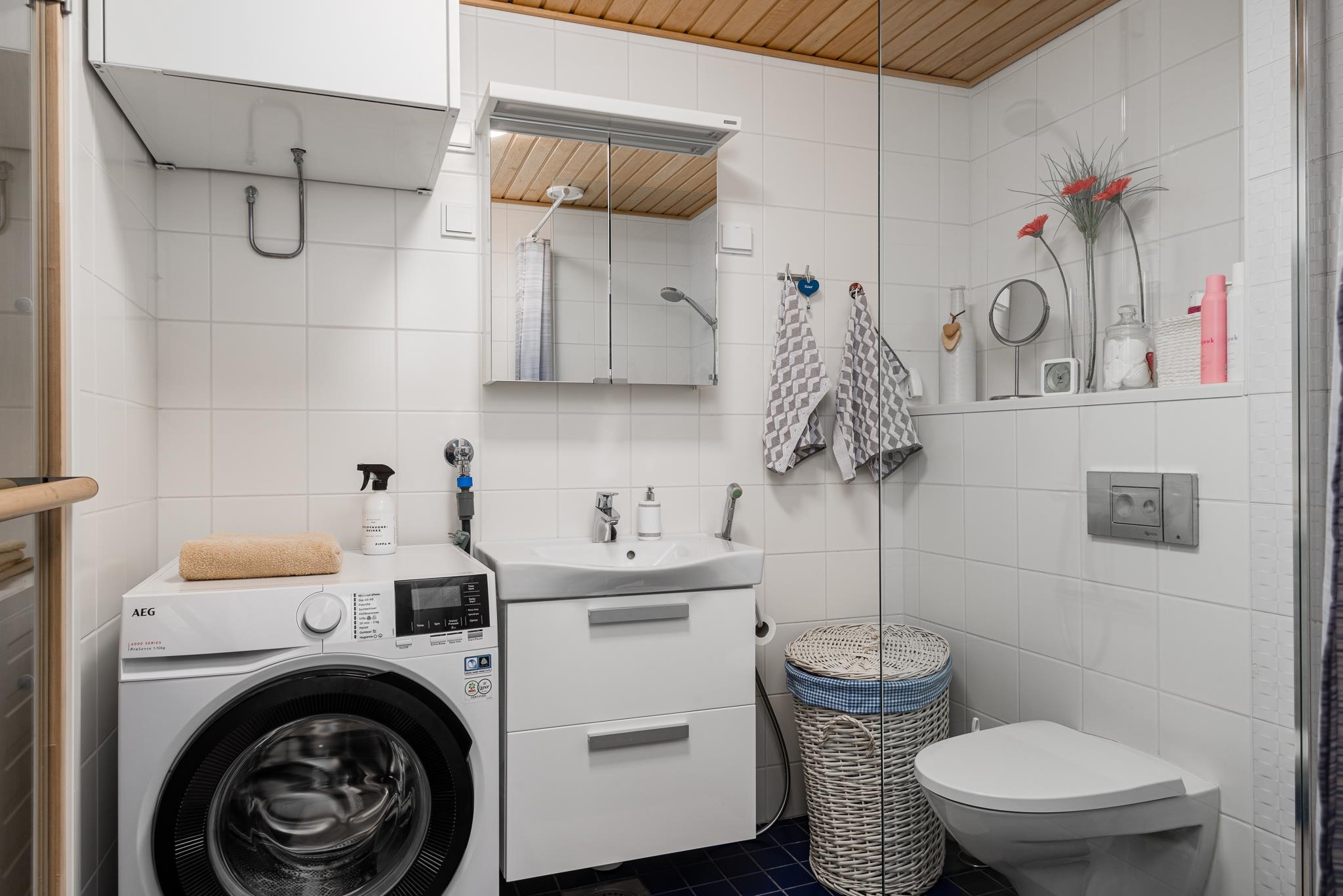 - Sauna, sähkökiuas, kylpyhuone, suihku, suihkuseinä, peilikaappi, allaskaappi, pesukoneliitäntä, lattialämmitys, kiinteät valaisimet.