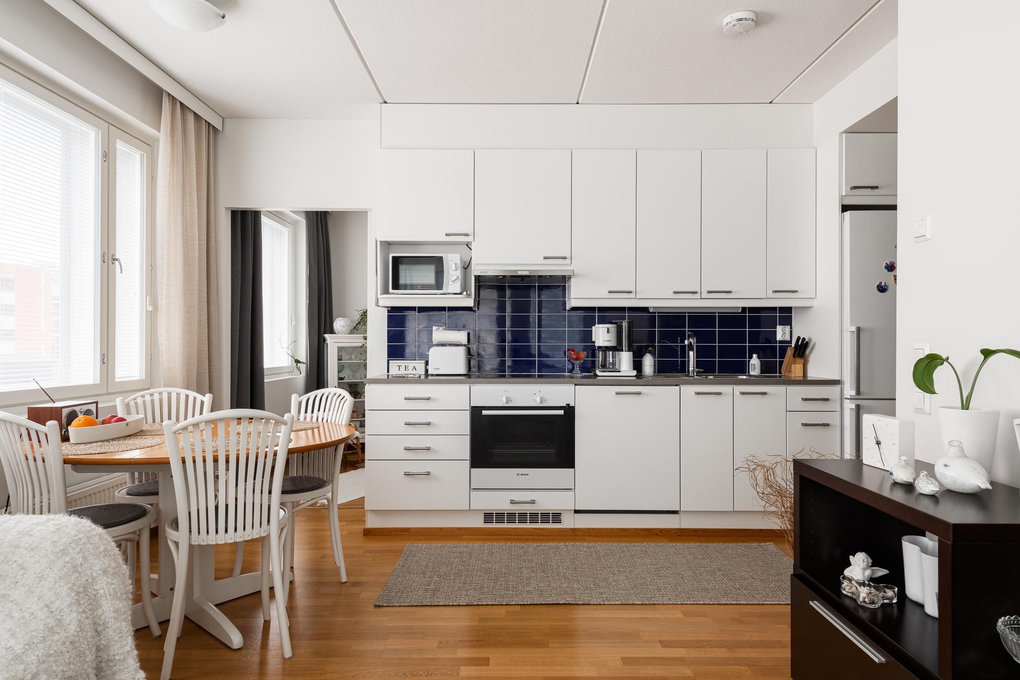 - Jääkaappipakastin, erillisuuni, liesitaso, keraaminen liesi, liesituuletin, astianpesukone, kaapistot, kiinteät valaisimet.