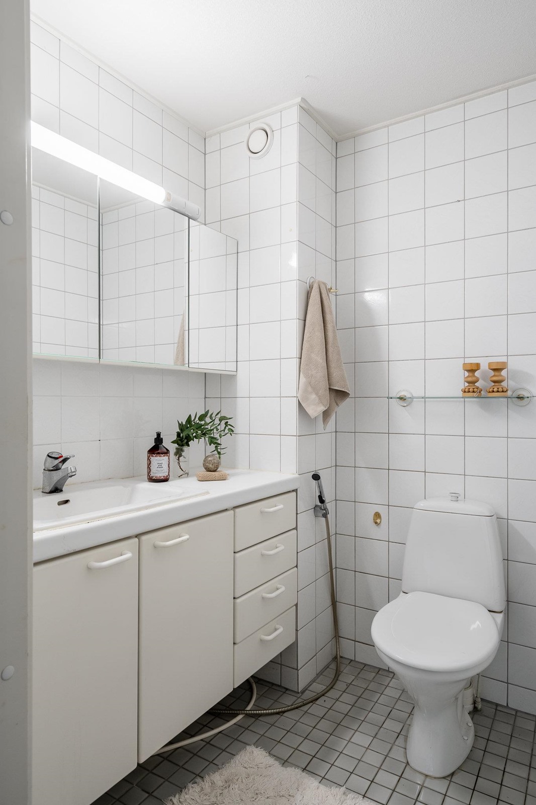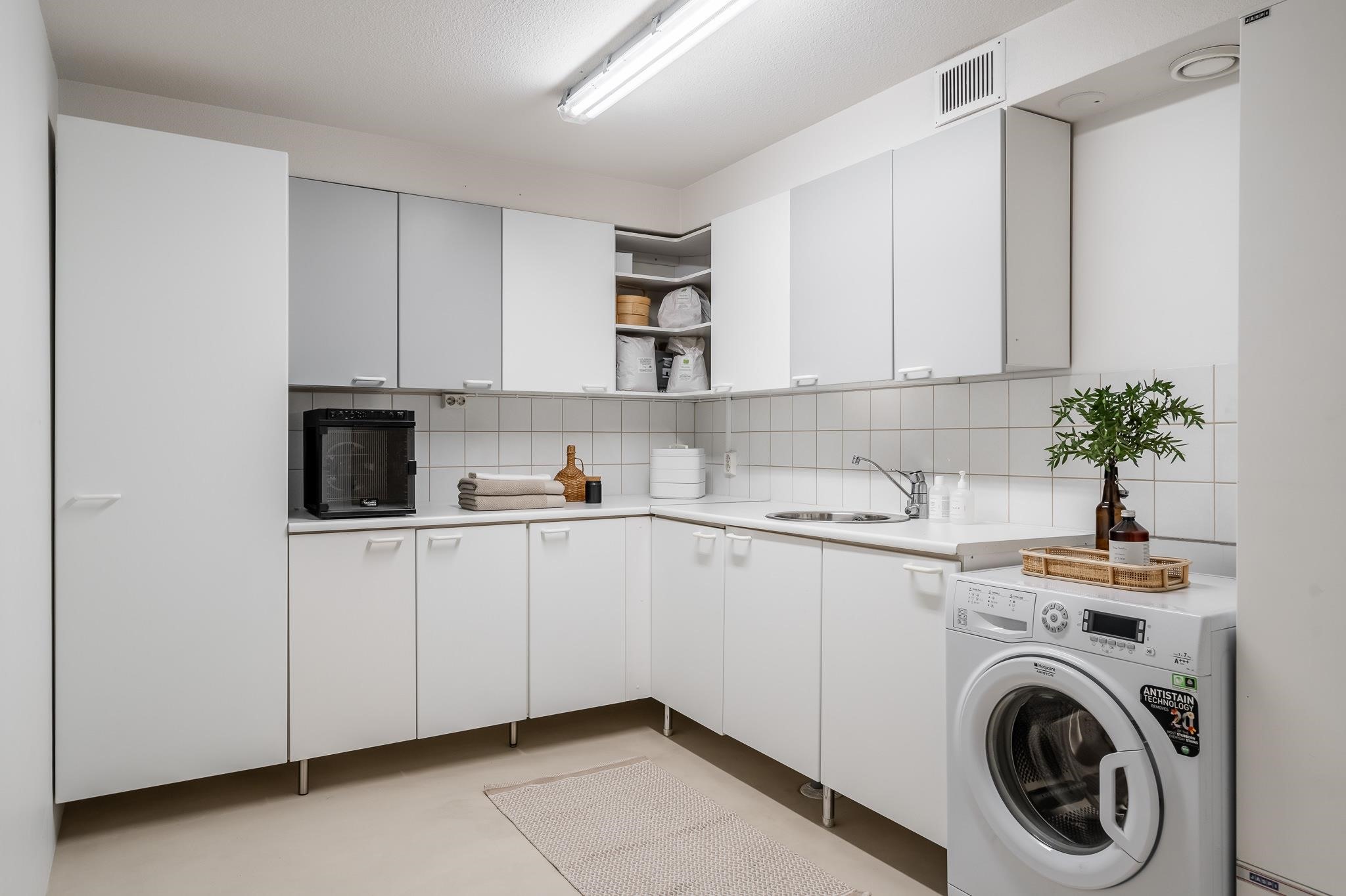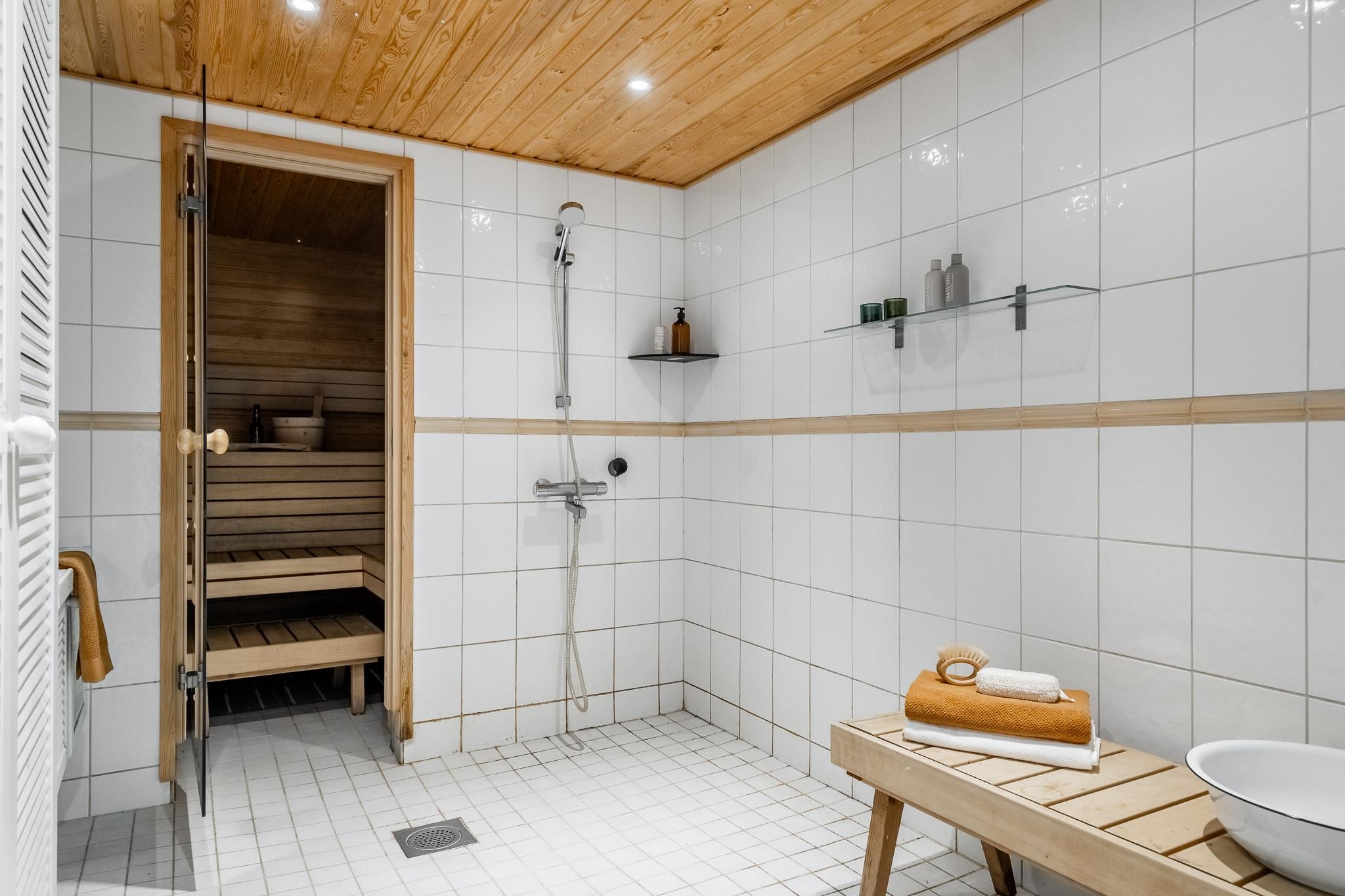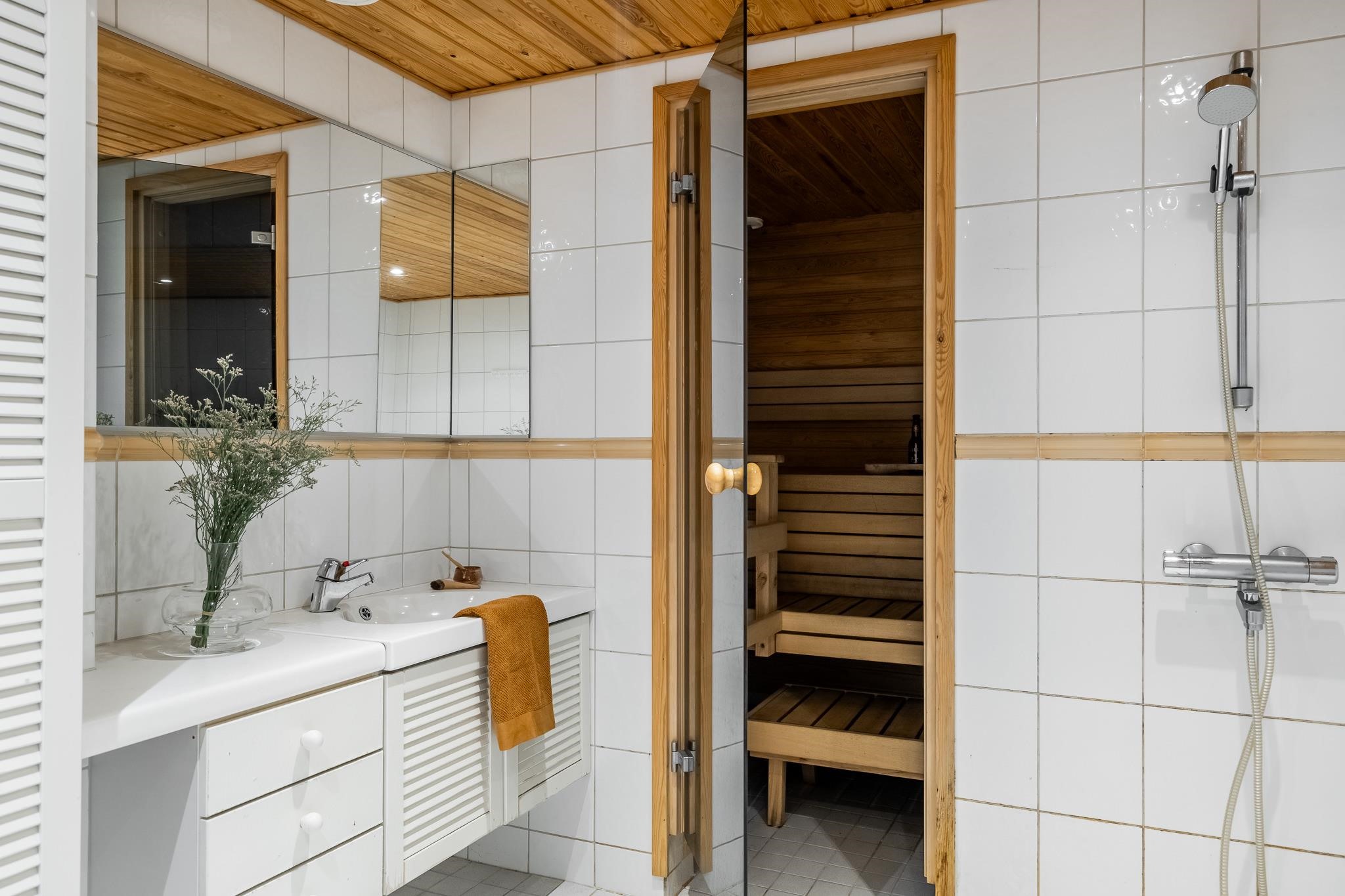 - Sauna, sähkökiuas, kylpyhuone, erillinen wc, suihku, peilikaappi, kaapit, allaskaappi, pesukoneliitäntä, kiinteät valaisimet.