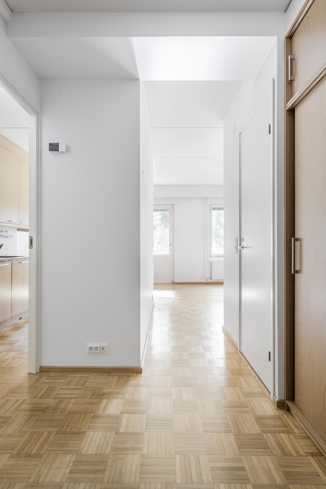 Keittiö: Tammisauvaparketti, tapetti. Olohuone: Tammisauvaparketti, tapetti. Makuuhuone 1: Laadukas korkkiparketti, tapetti. Sauna: Laatta, kuusipaneli. Kylpyhuone: Laatta. Eteinen: Tammisauvaparketti, tapetti.