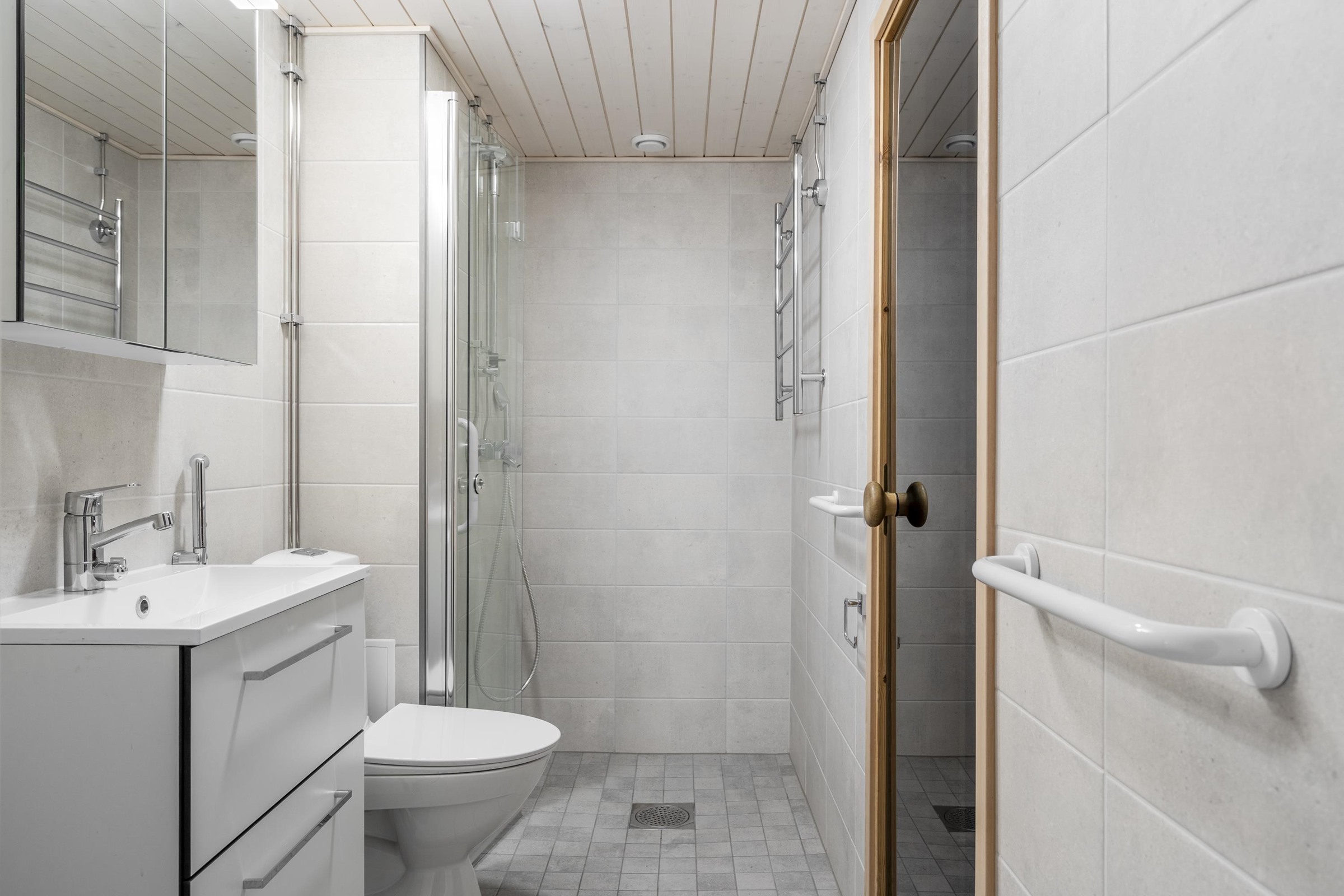 - Saunassa sähkökiuas, kylpyhuone, suihkuseinä, peilikaappi, allaskaappi, pesukoneliitäntä. Kylpyhuone remontoitu 2024 linjasaneerauksen yhteydessä.