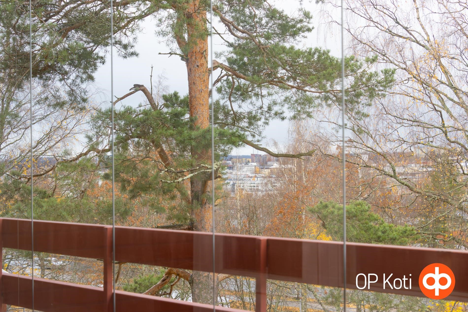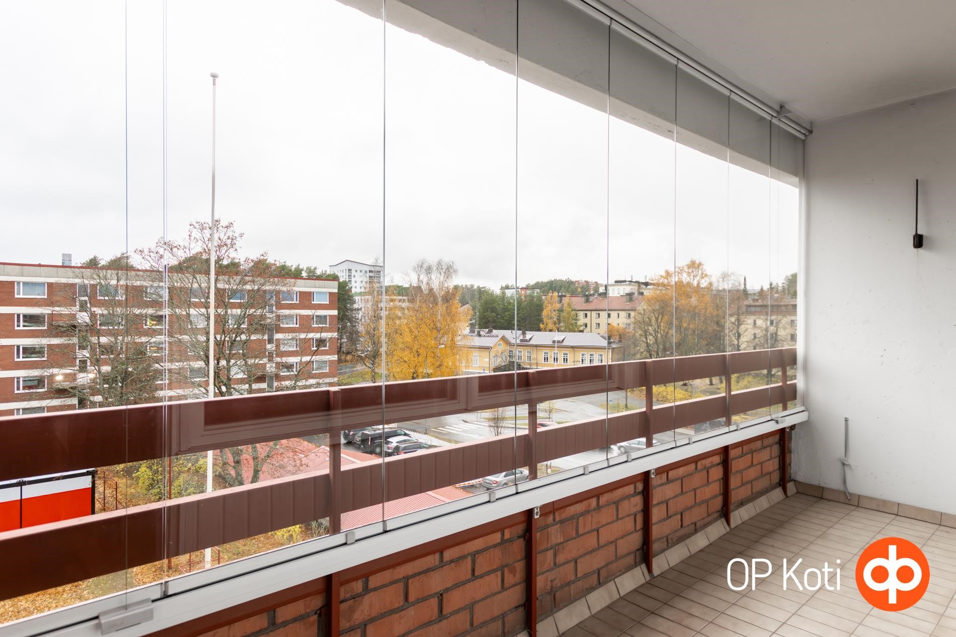 Kodin levyinen lasitettu parveke toimii lisähuoneena keväästä syksyyn - täydellinen paikka aamukahville tai iltahetkelle.
