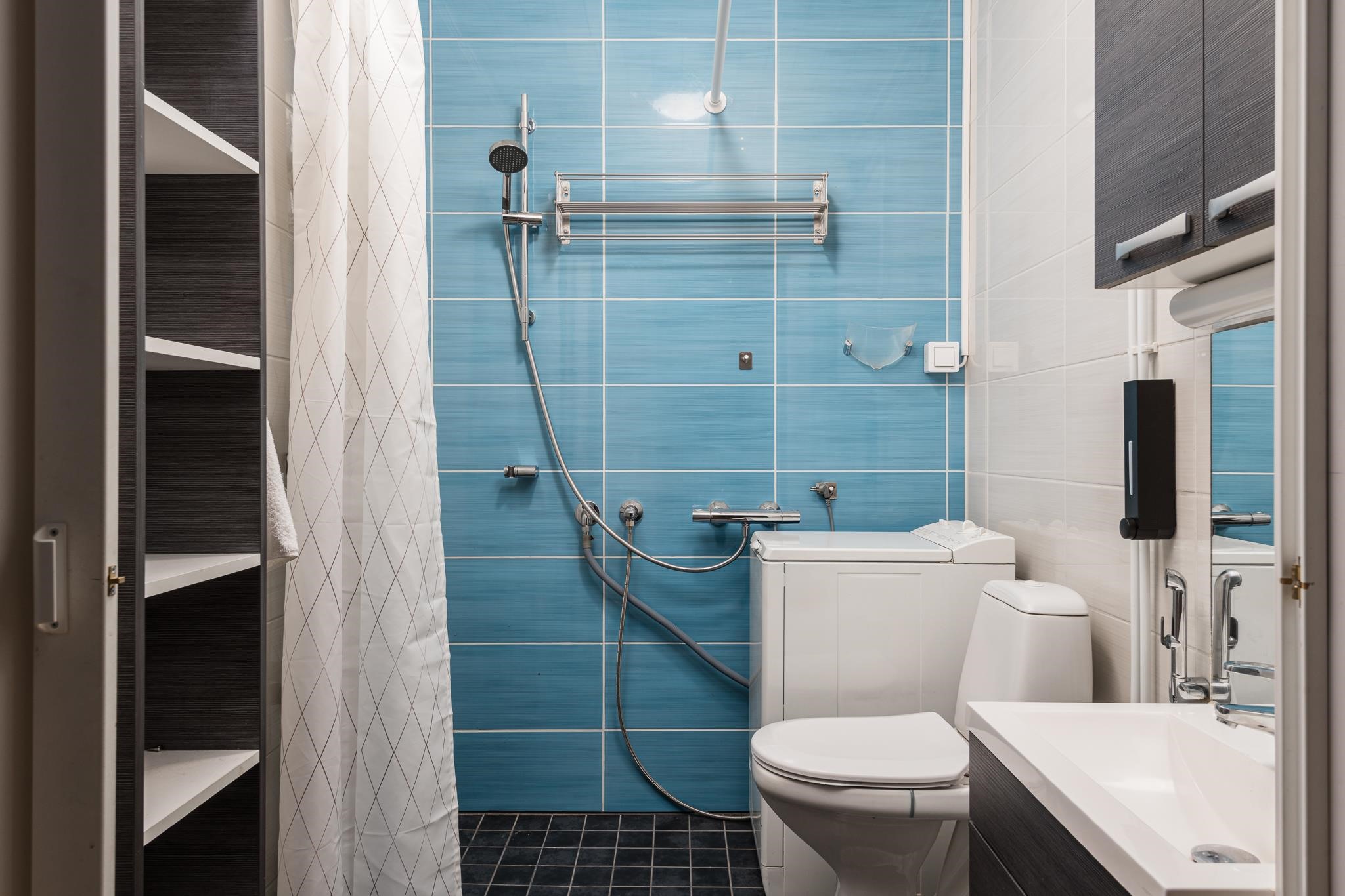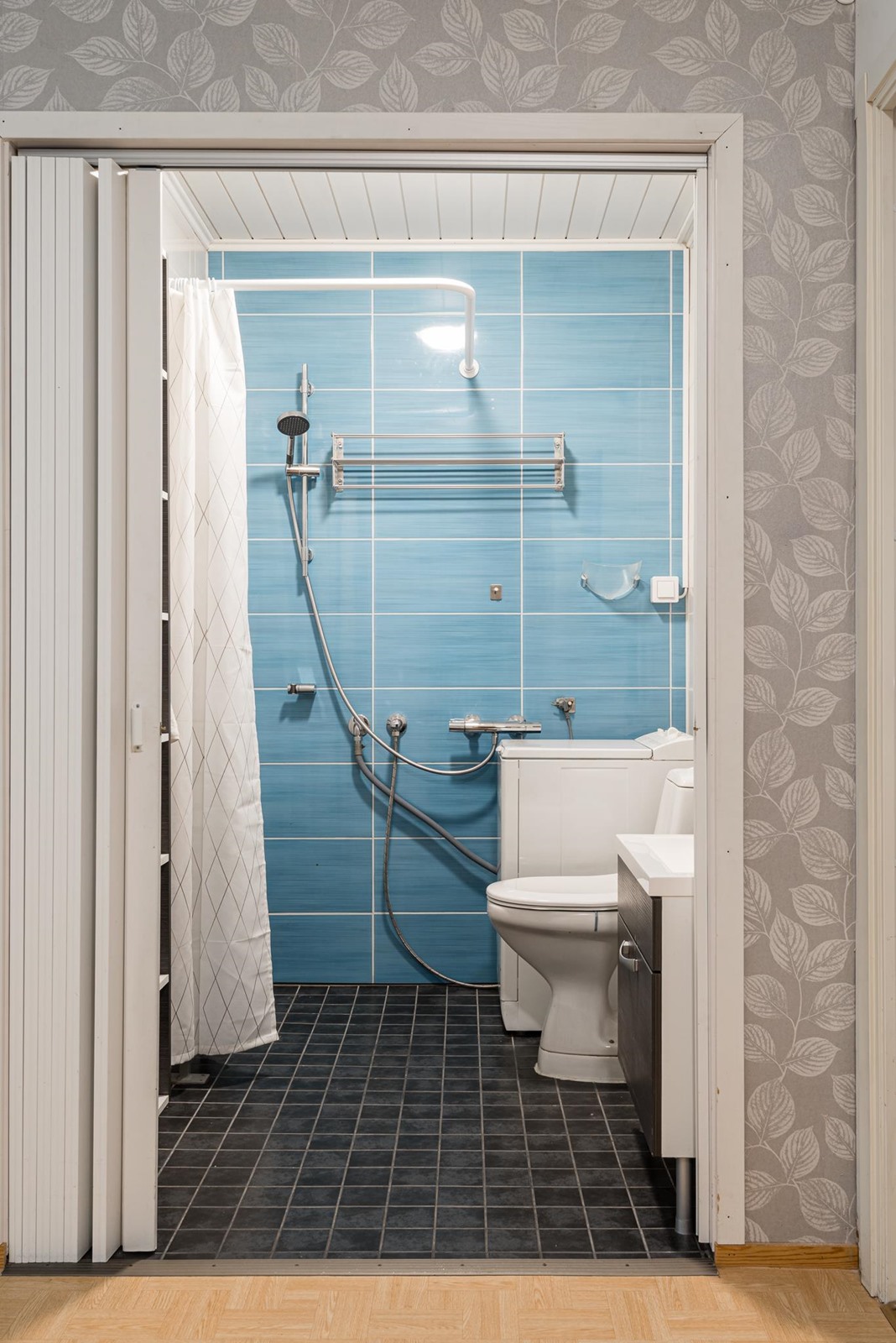 - Kylpyhuone, suihku, peilit, kaapit, allaskaappi, pesukoneliitäntä, lattialämmitys kph, kiinteät valaisimet.