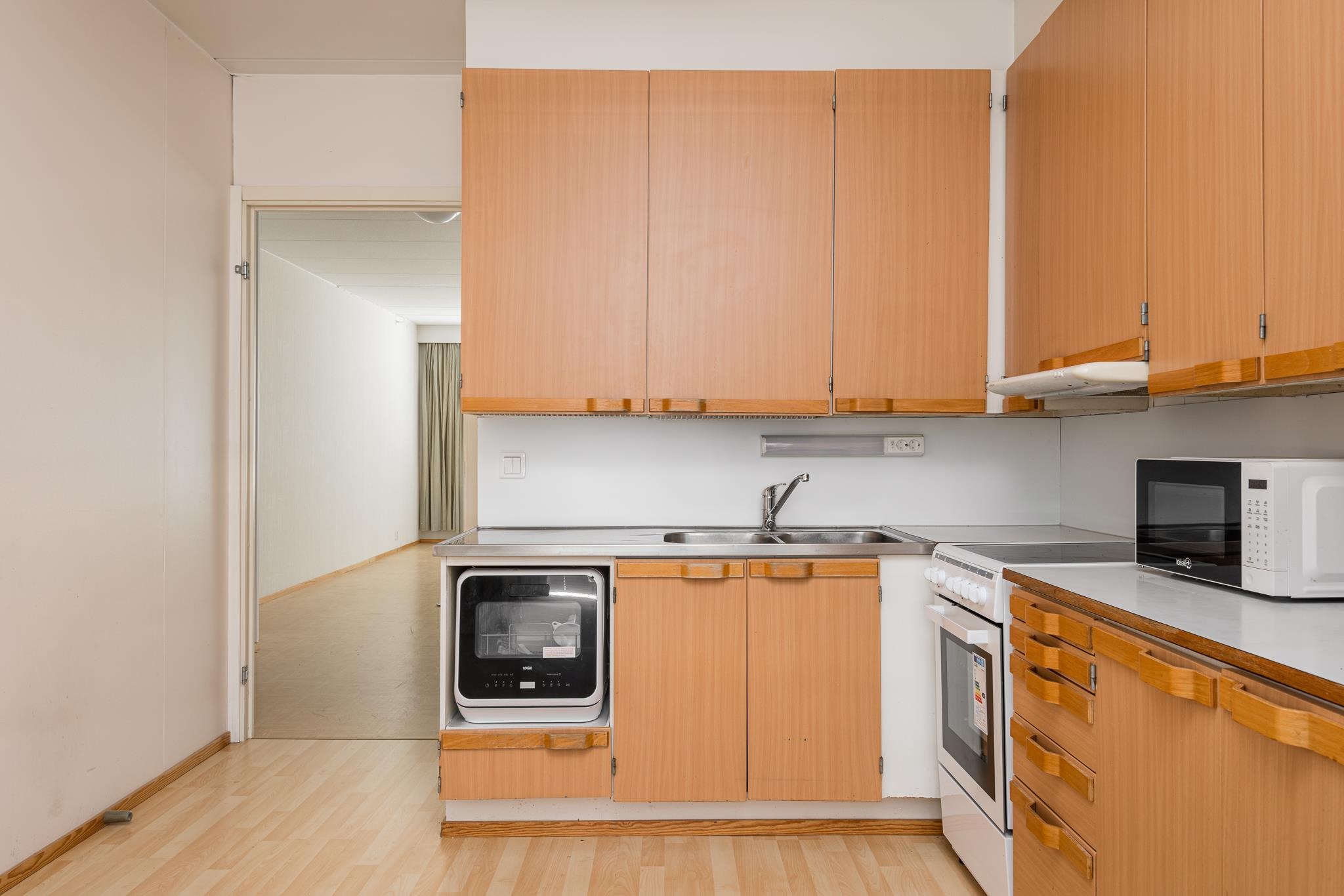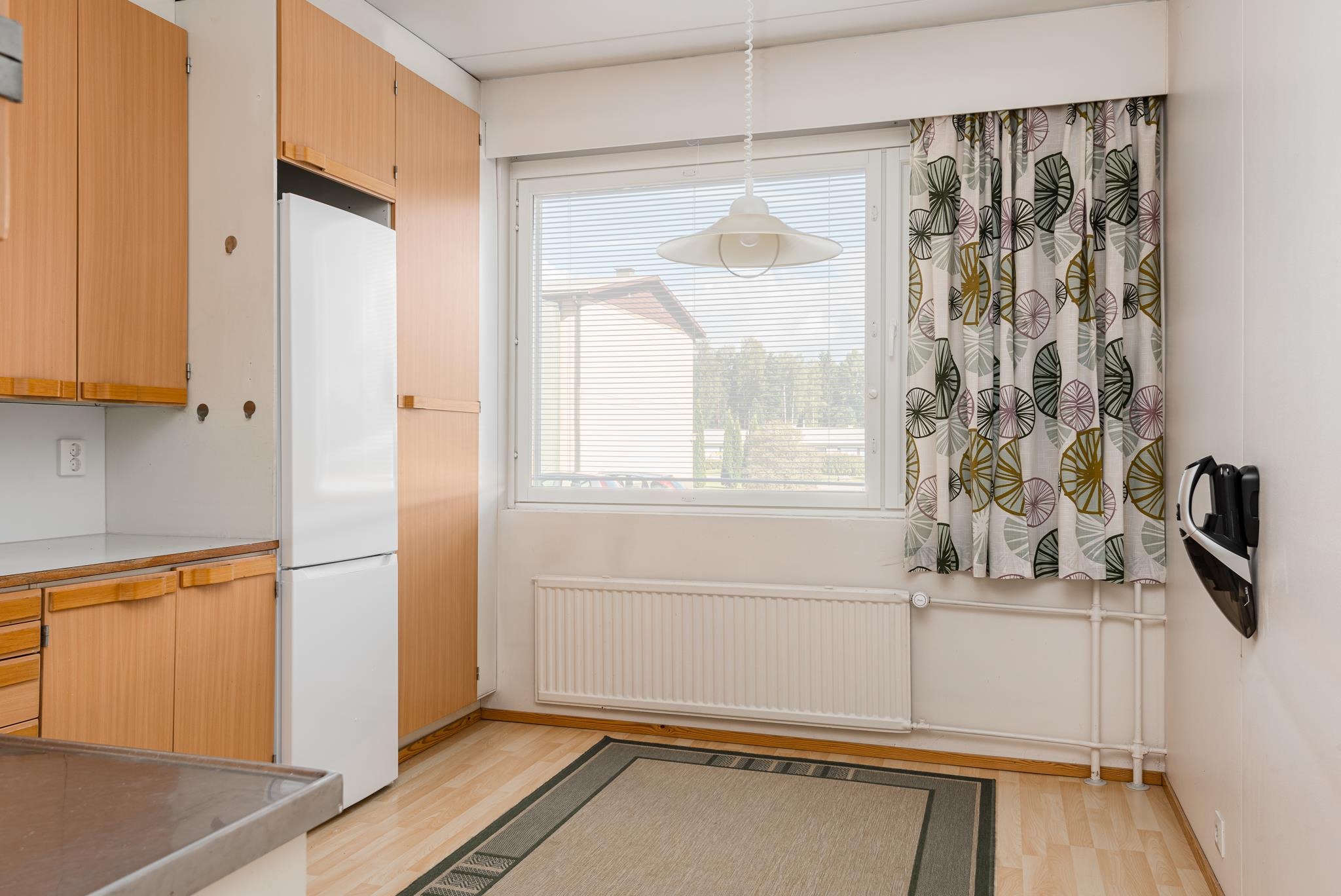Tämä ensimmäisen kerroksen asunto on sisältä muutettu esteettömäksi. Kaupan mukana seuraavat tarvittaessa pyörätuoliliuskat porraskäytävän muutamaa rappua varten. Pesuhuone on remontoitu, keittiön koneet uusittu ja asunto muuten siistissä kunnossa.