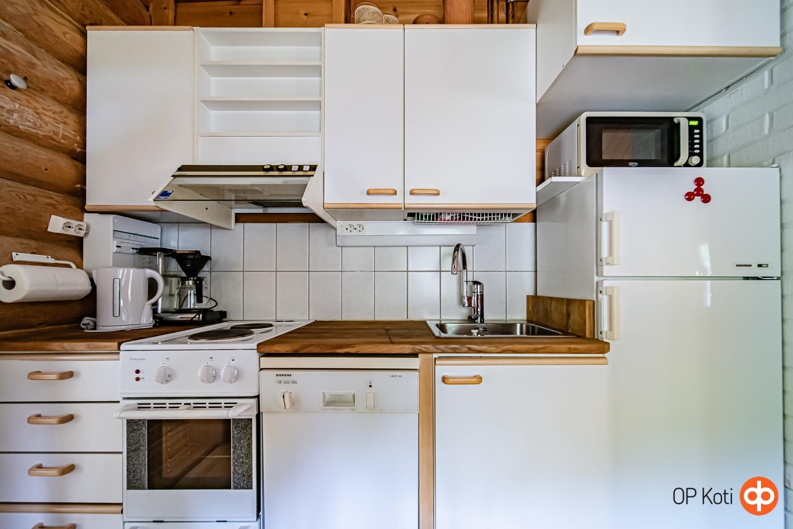 - Jääkaappipakastin, sähköliesi, liesituuletin, mikroaaltouuni, astianpesukone, kaapistot, kiinteät valaisimet, pöytätasojen materiaali laminaatti/puu.