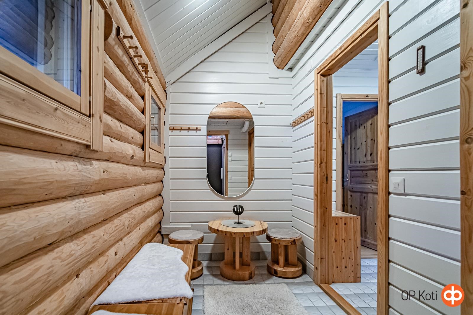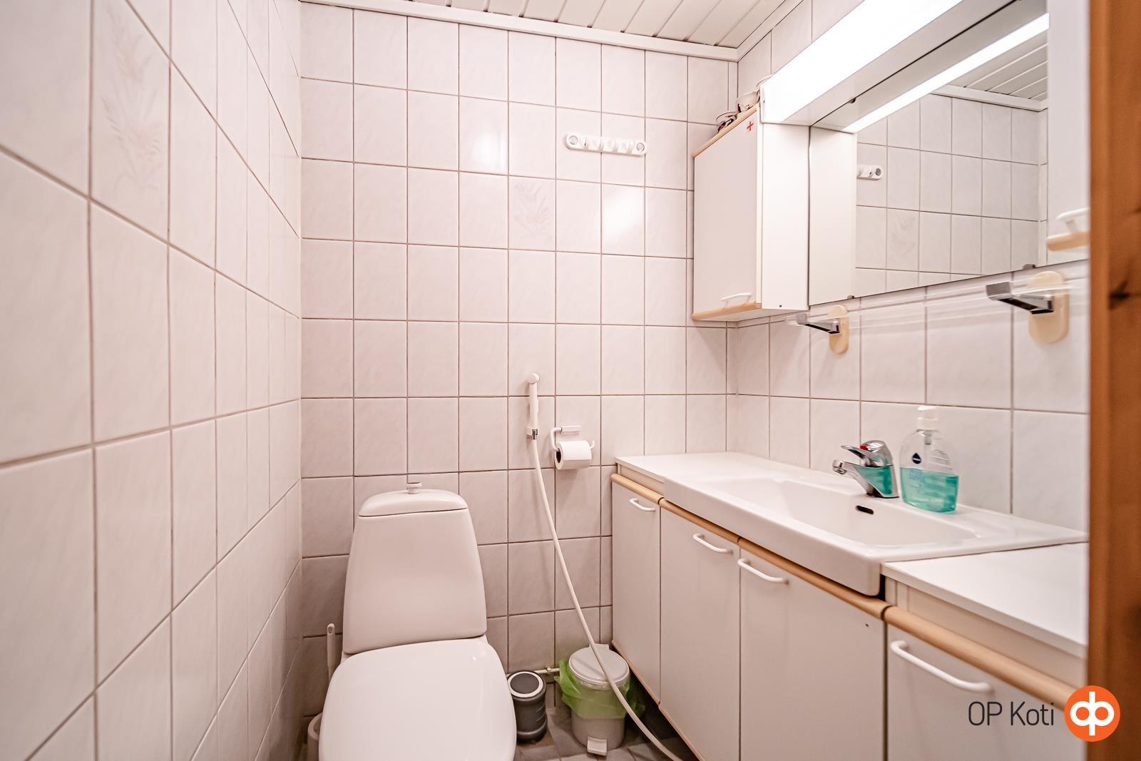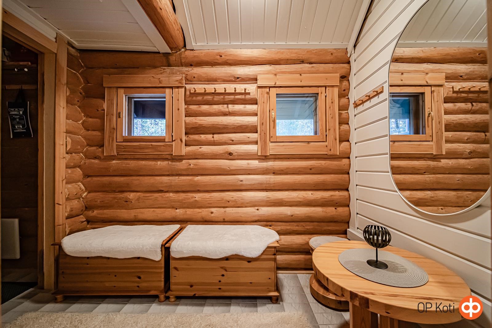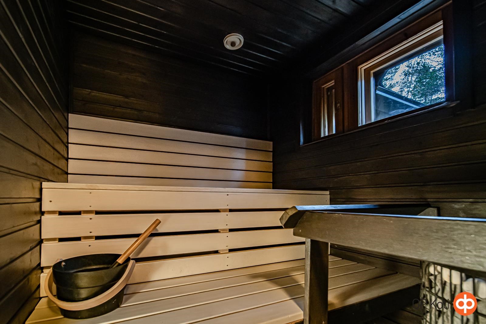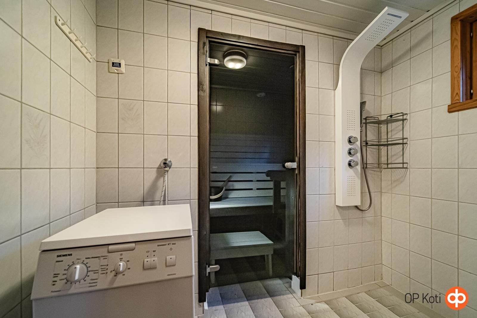 - Sauna (Mondex Teno sähkökiuas 9 kW, noin vm. 2021), sähkökiuas, kylpyhuone, erillinen wc, suihku, peilit, kaapit, allaskaappi, pesukoneliitäntä, lattialämmitys, kiinteät valaisimet.