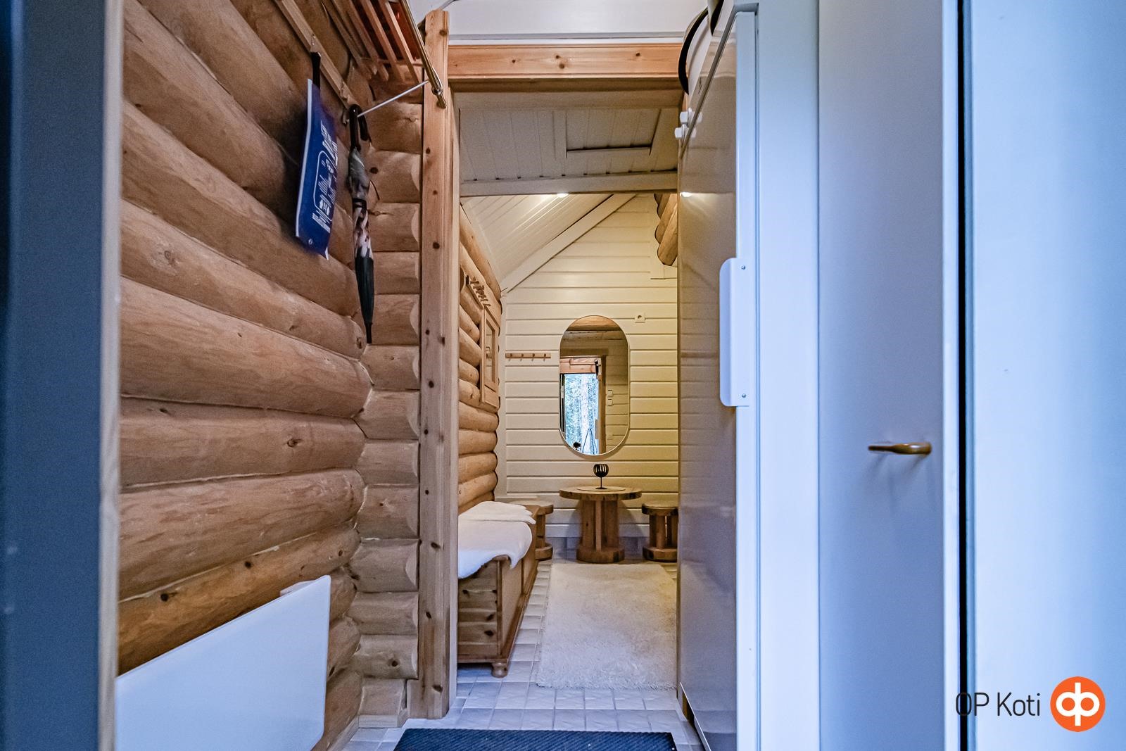 Keittiö: parketti, hirsi. Olohuone: parketti, hirsi. Makuuhuone 1: parketti, hirsi. Sauna: laatta, paneeli. Kylpyhuone: laatta, laatta. Wc: laatta, laatta.