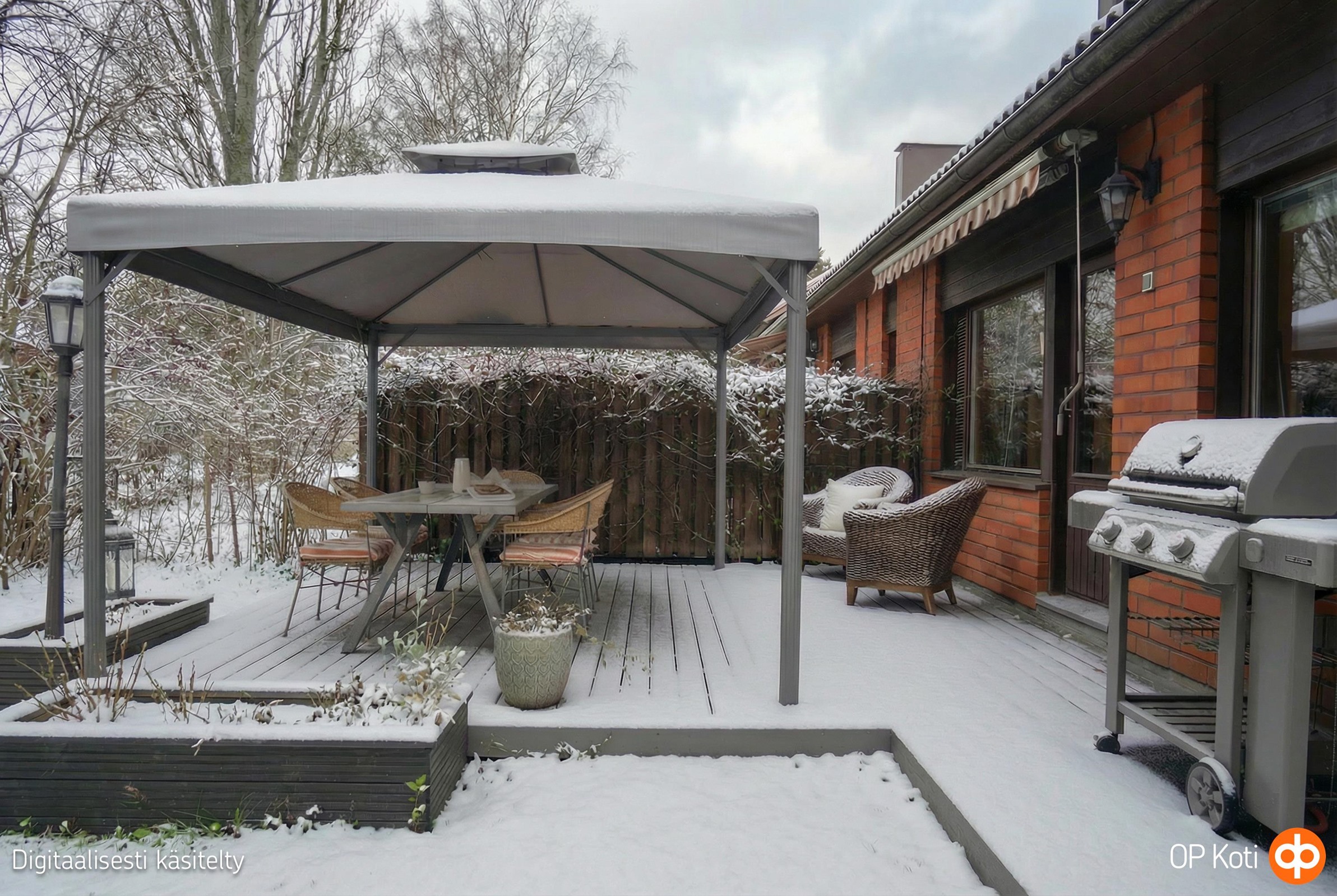 Oma, puuaidalla rajattu länsipiha on kuin oma pieni keidas - terassi, kasvihuone, hiekkalaatikko, paviljonki ja istutukset kutsuvat viihtymään ja viettämään aikaa ulkona.