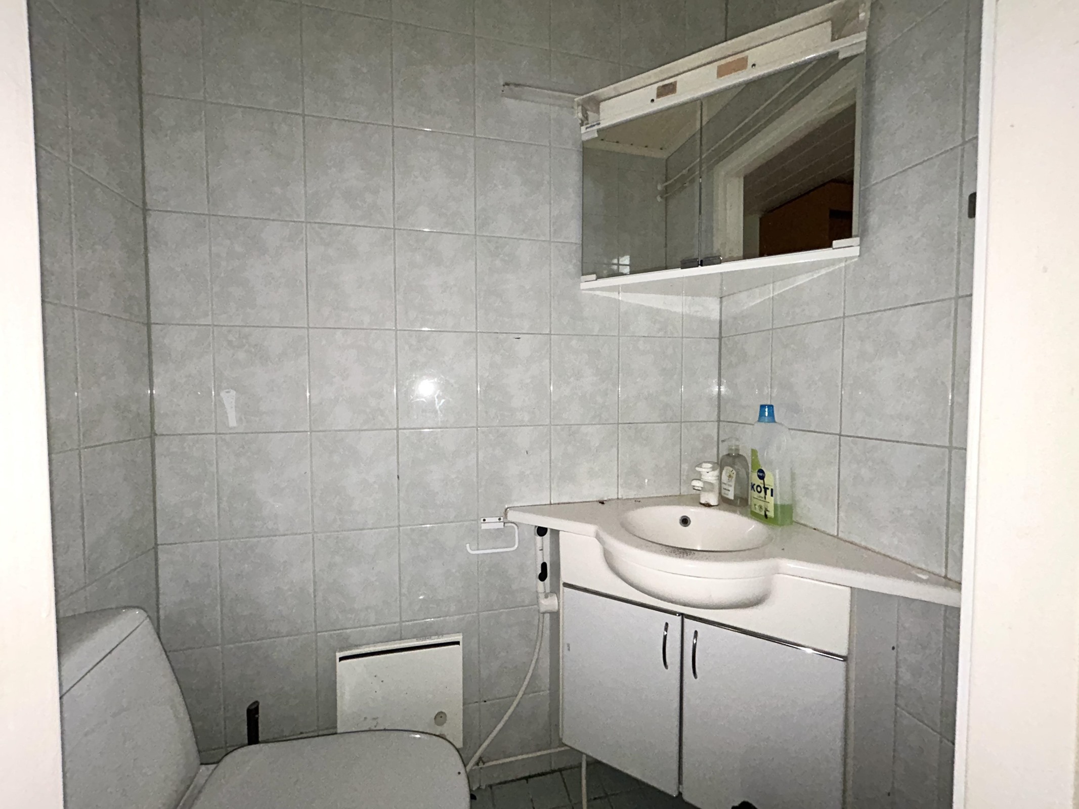 - Sauna, sähkökiuas, kylpyhuone, erillinen wc, suihku, suihkuseinä Lasi rikki, peilit, peilikaappi, pesukoneliitäntä, lattialämmitys, kiinteät valaisimet.